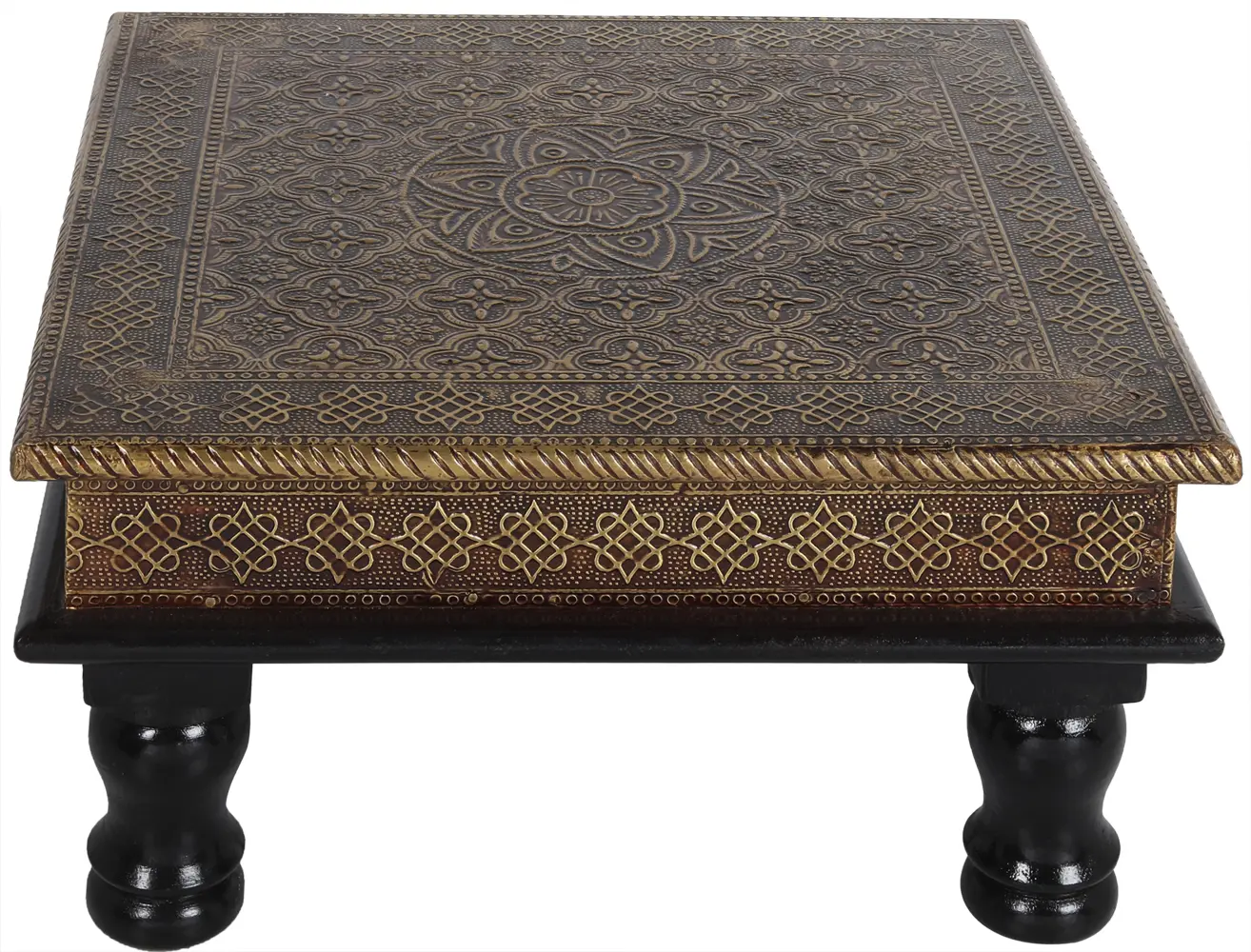 The chowki, or bajot, has been an integral part of Indian households and places of worship for generations. It is more than just a low table; it is a sacred platform. In Hindu traditions, placing deities or holy books upon a raised surface like a chowki signifies respect and honor. It elevates the divine from the everyday, creating a dedicated space for spiritual practice. The practice of performing puja (worship) often involves placing the idol of a deity on a chowki, symbolizing their presence in the home. This particular chowki, with its ornate brass detailing, would have been a cherished possession, passed down through families, each generation adding their own prayers and devotion to its already rich history. The very act of creation, with skilled hands shaping metal and wood, is seen as a form of offering in many Indian cultures, imbuing the object with positive energy. This piece, with its blend of natural wood and lustrous brass, embodies the classical aesthetic of Indian decorative arts. The dark wood provides a grounding, earthy contrast to the bright, intricate brasswork, creating a visual harmony that is both sophisticated and deeply resonant. It is an invitation to connect with a heritage of craftsmanship that has for millennia sought to bring beauty and meaning into the everyday. Whether used for daily worship, special ceremonies, or as a striking decorative accent, this chowki is a powerful reminder of the enduring connection between art, spirituality, and the home.