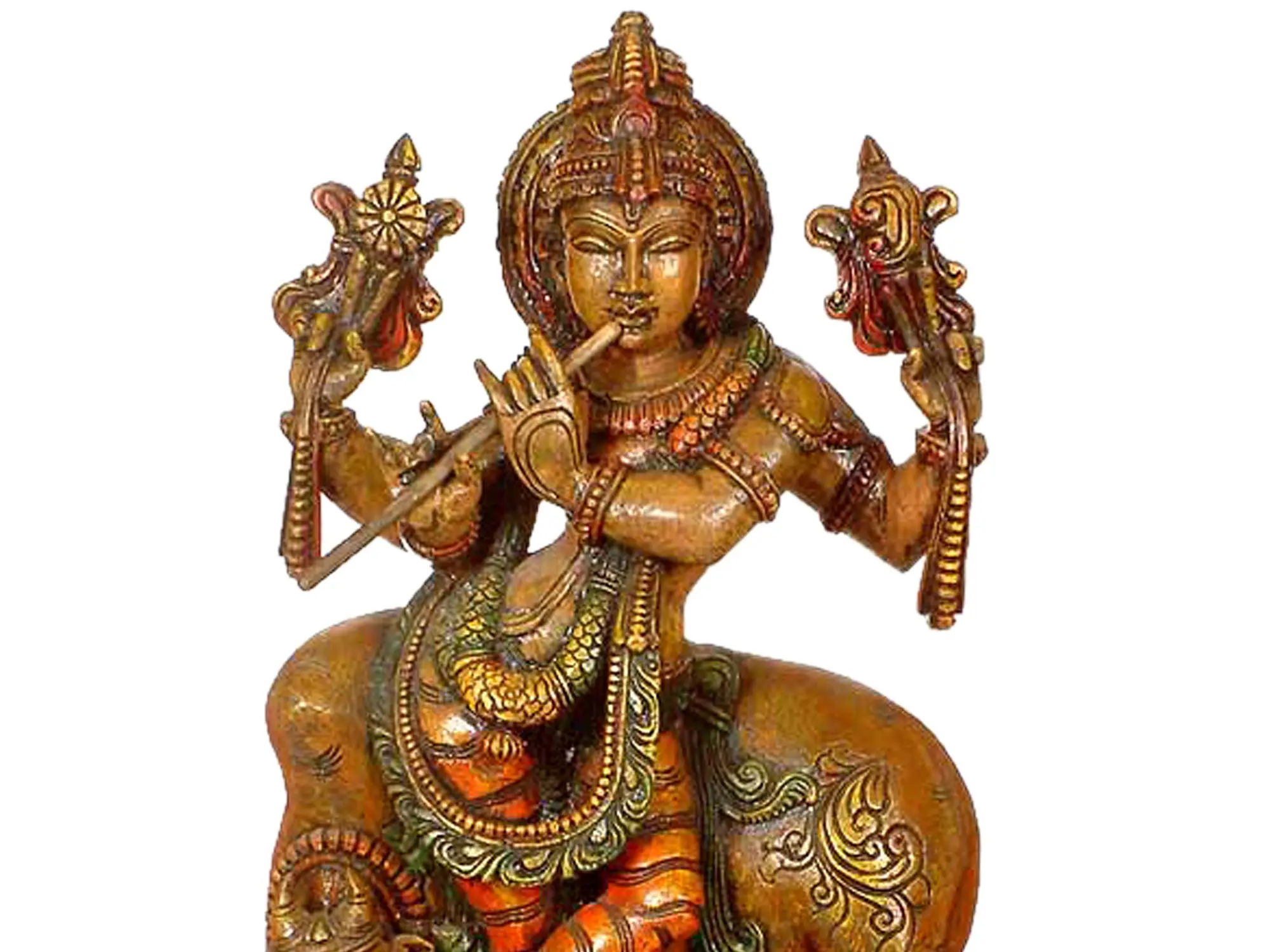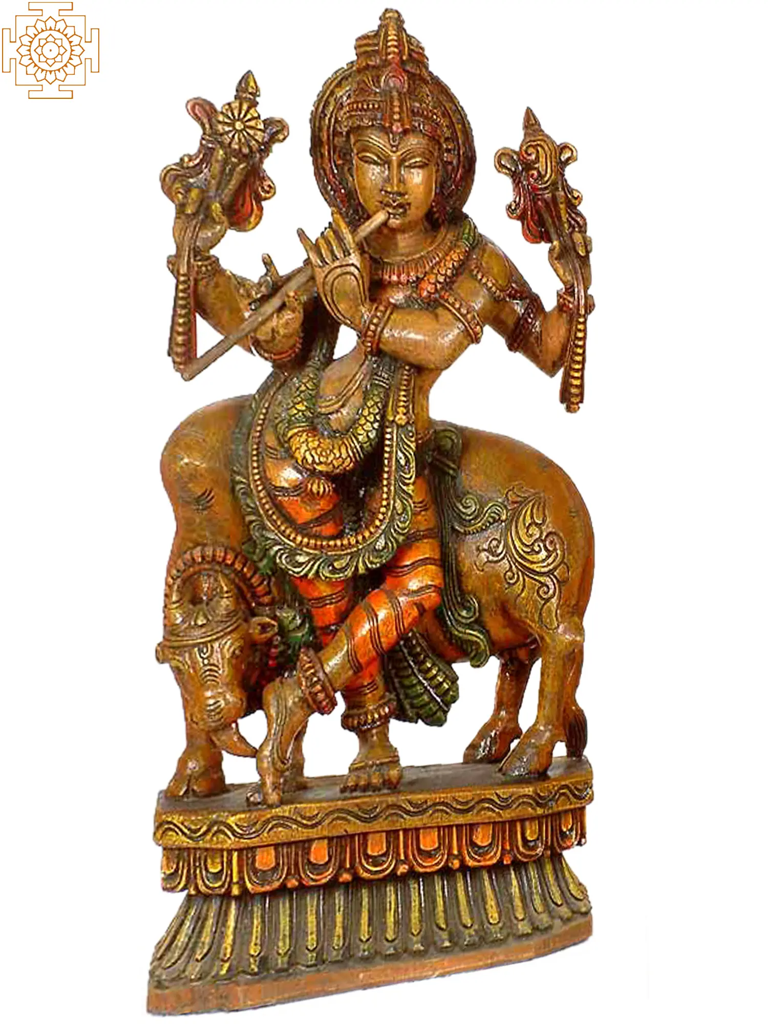 The central figure embodies Lord Krishna, one of the most beloved deities in the Hindu pantheon. As a symbol of joy, devotion, and divine love, Krishna's tales resonate through centuries. Here, he is depicted in his captivating aspect as a musician, enchanting the world with the celestial melodies of his flute. His posture exudes grace and serenity, inviting contemplation and peace into any space it graces. Imagine Krishna in Vrindavan, the idyllic setting of his childhood adventures. The sweet strains of his flute are said to have charmed not only the gopis (milkmaids) but also the animals and even the rivers, causing them to pause in their course to listen to his divine music. This image is a potent reminder of Krishna's enchanting power and his ability to captivate hearts. The flute itself is not merely an instrument; it’s a symbol of the call of the divine, beckoning the individual soul to unite with the Supreme Being. The melodies emanating from it represent the universal harmony and the divine love that binds all creation.