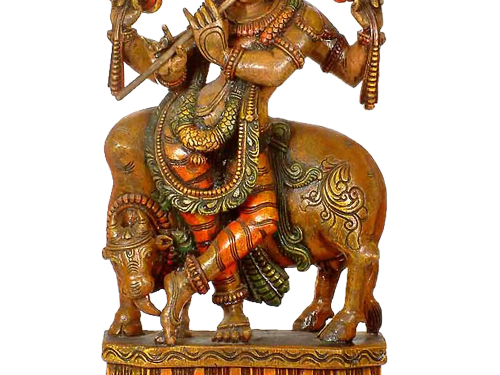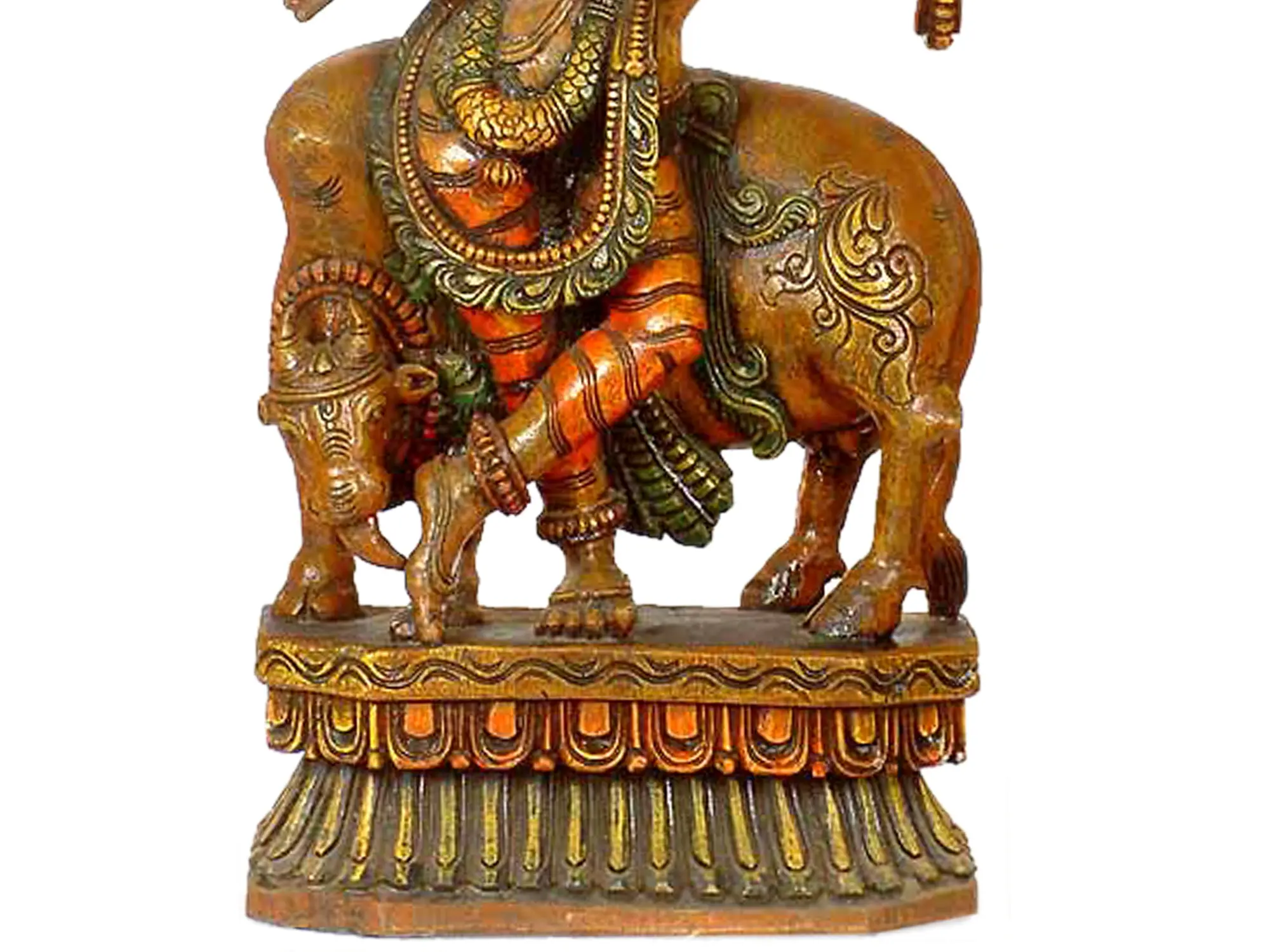Journey into the heart of South Indian artistic tradition with this magnificent wood carving. Measuring 24.0 x 12.0 x 5.0 inches, this piece is more than a statue; it's a narrative captured in wood, a testament to the skill of artisans who have honed their craft for generations in the sacred temple traditions. Observe the intricate details, lovingly etched by hand, bringing to life a divine being steeped in legend and love.