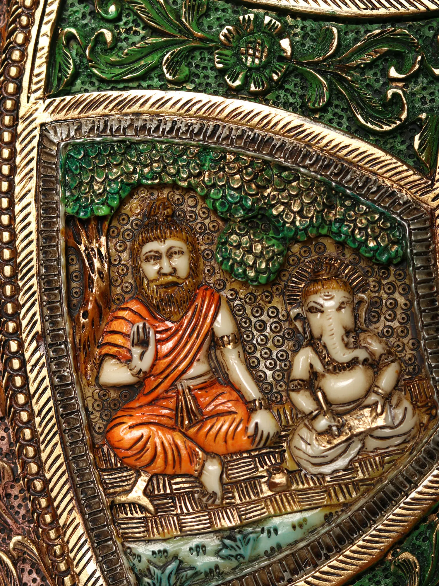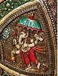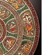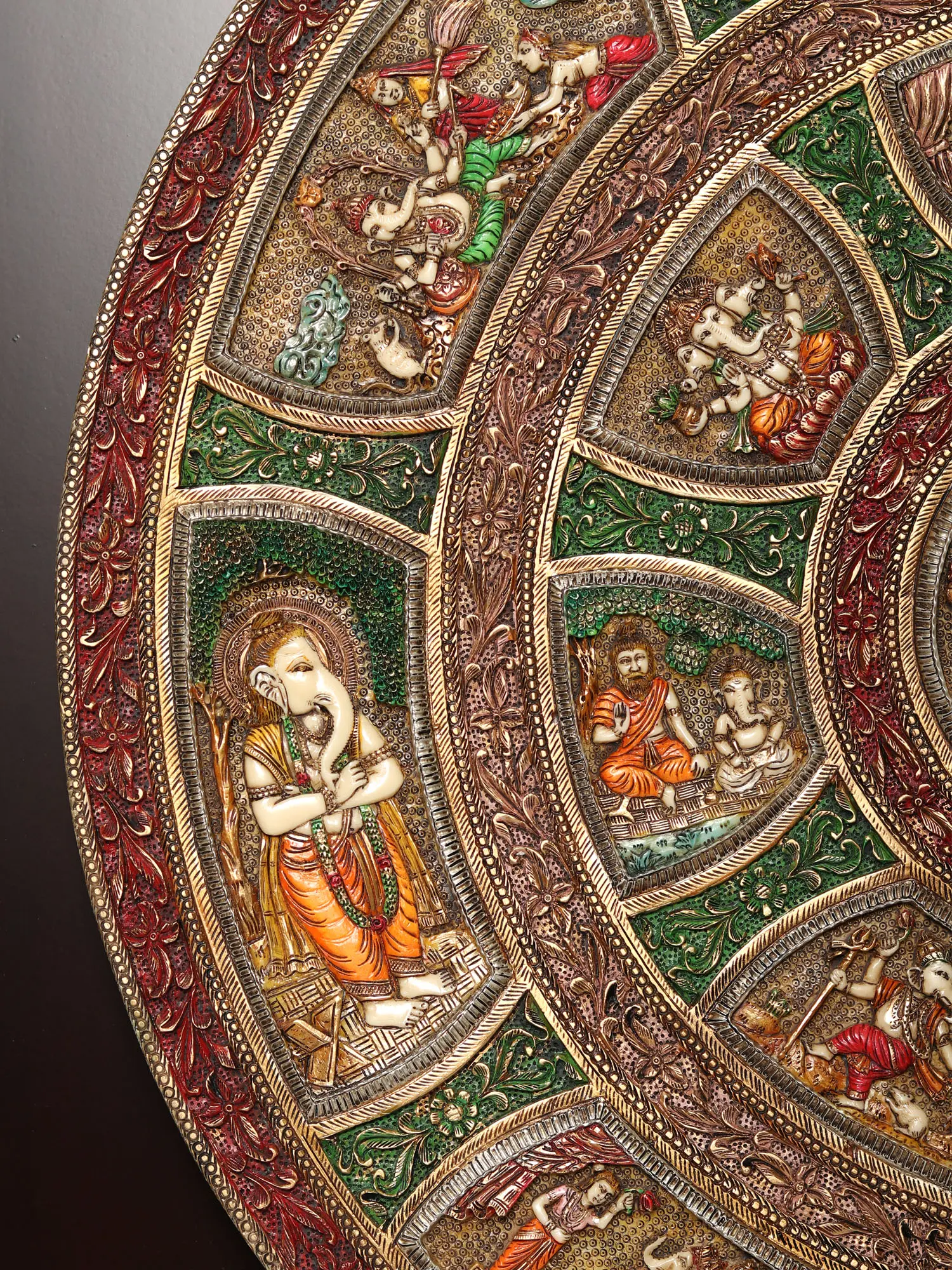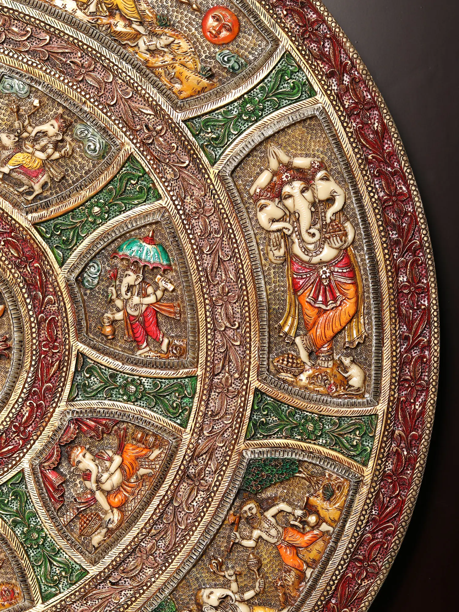 The central round section showcases the life story of Lord Ganesha in vibrant and bright colors, with a delightful combination of green and other hues. Enclosed within a plain wooden frame, it exudes a natural and timeless appeal. This wall hanging serves as a visual narrative, celebrating the diversity and significance of Lord Ganesha's presence and inviting a sense of auspiciousness and positivity into any space.