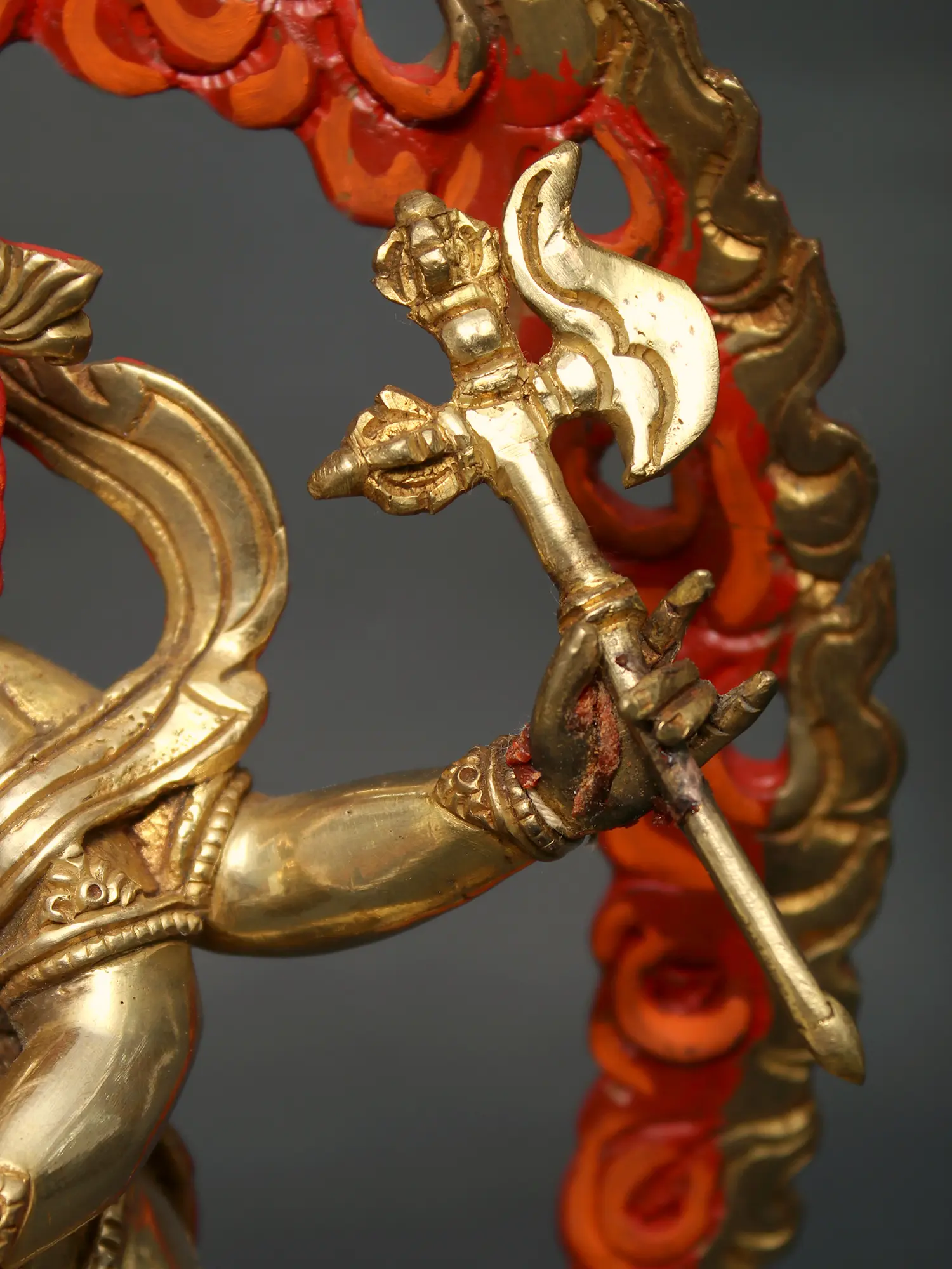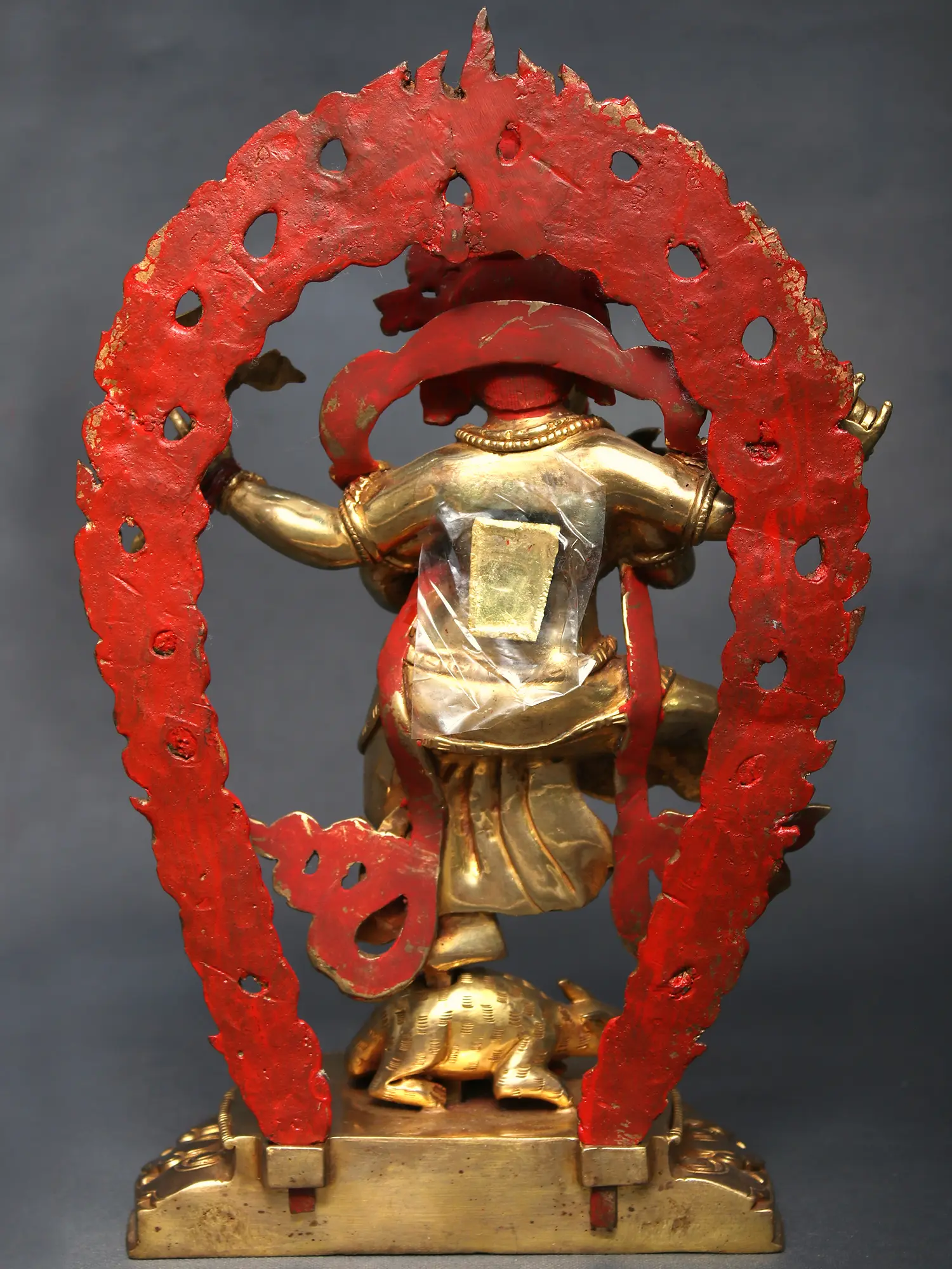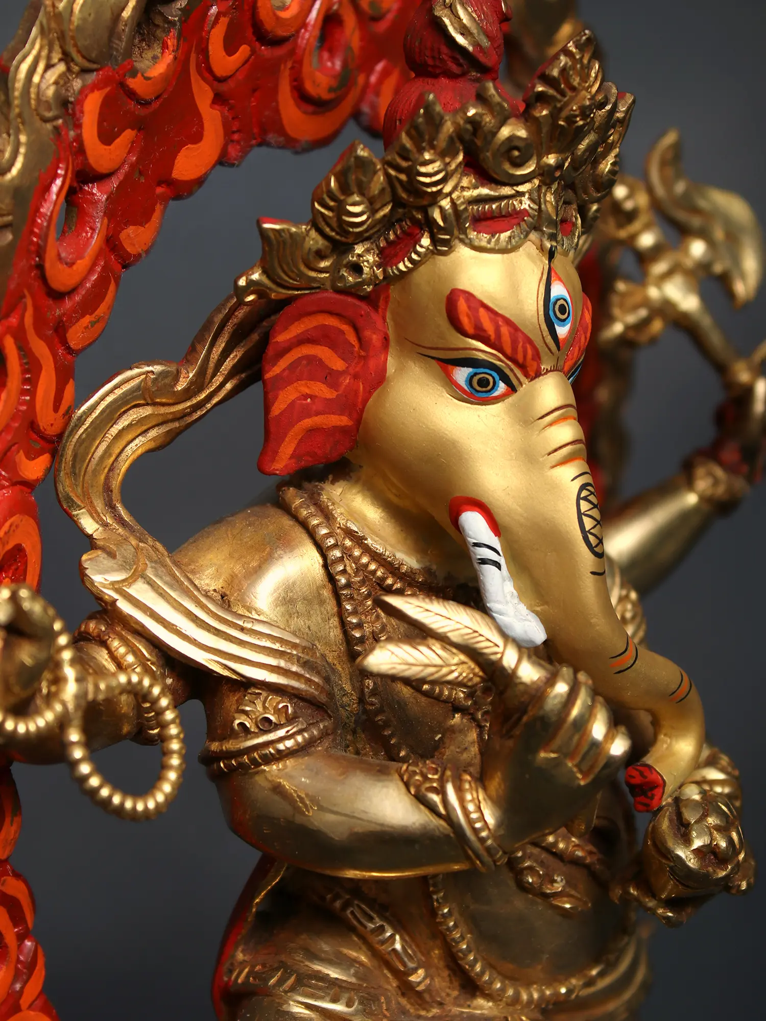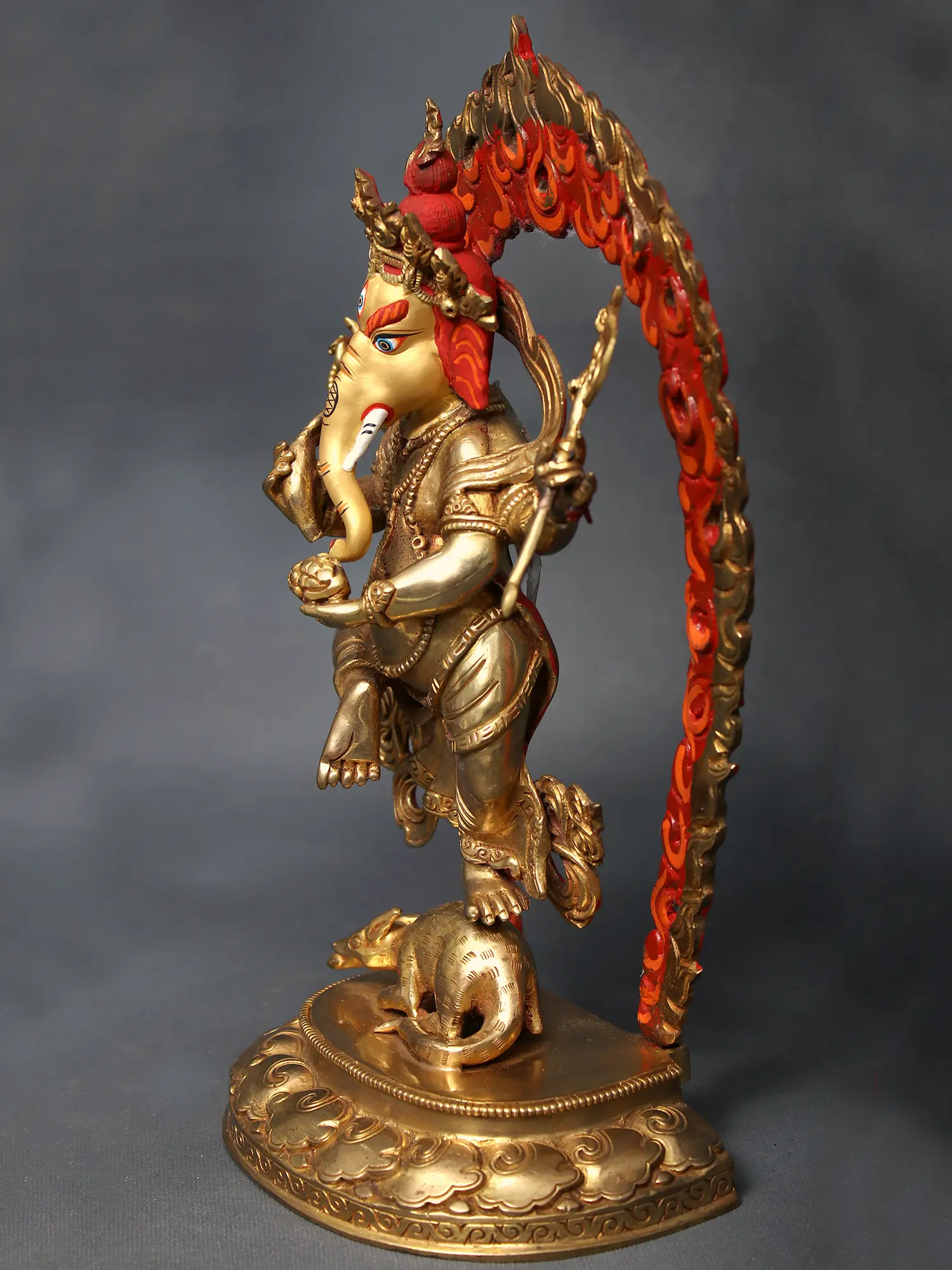 This is a gilded copper murti, which is a staple of the traditional art of Nepal. Where it is not gilded, the copper is superimposed with scarlet and vermillion colour paste. This adds to the brilliance of the composition. In fact, the brilliance lies in the lifelike composure of Ganesha’s countenance, as well as the realistic stance of His delicately sculpted limbs.