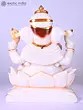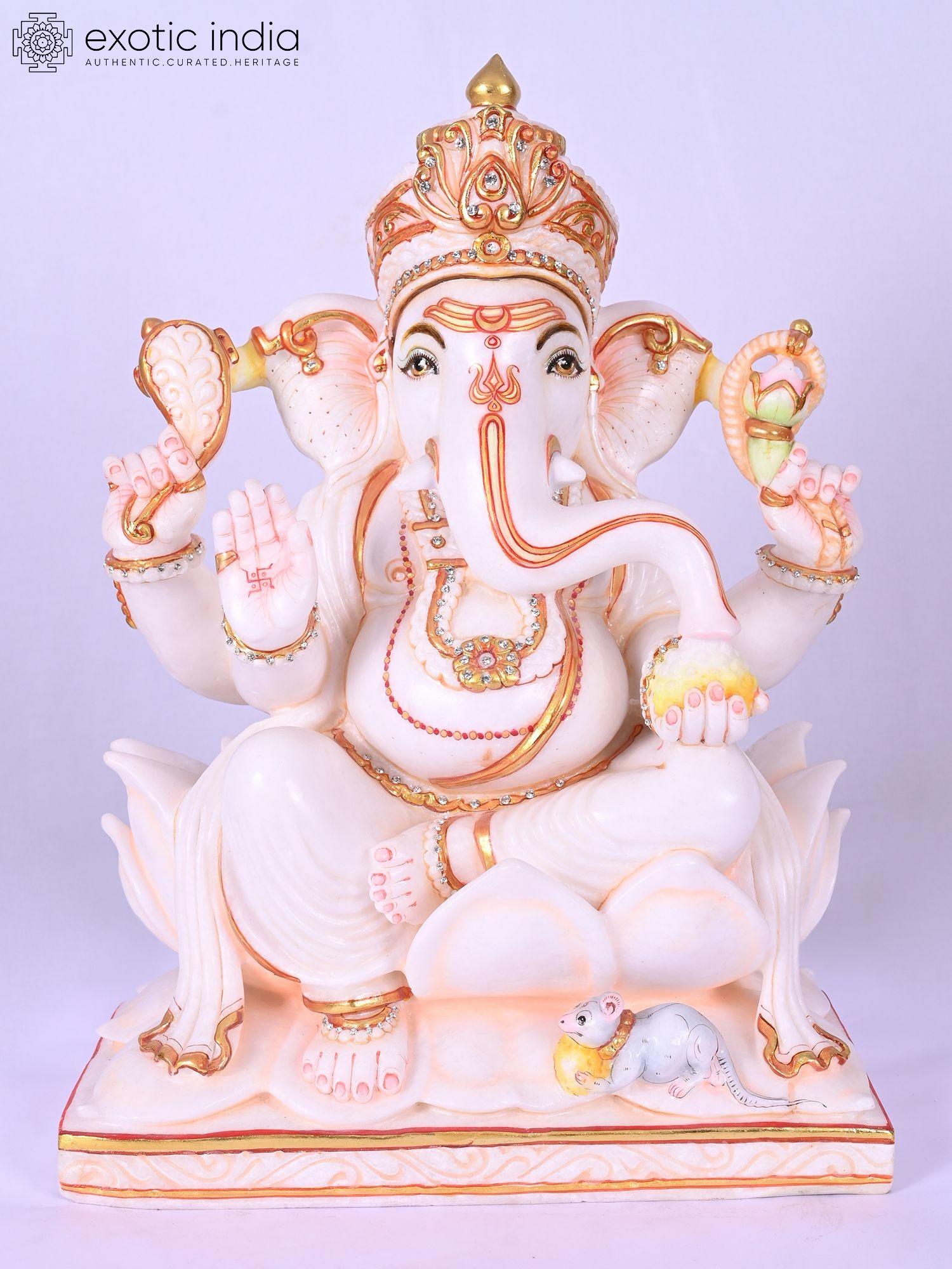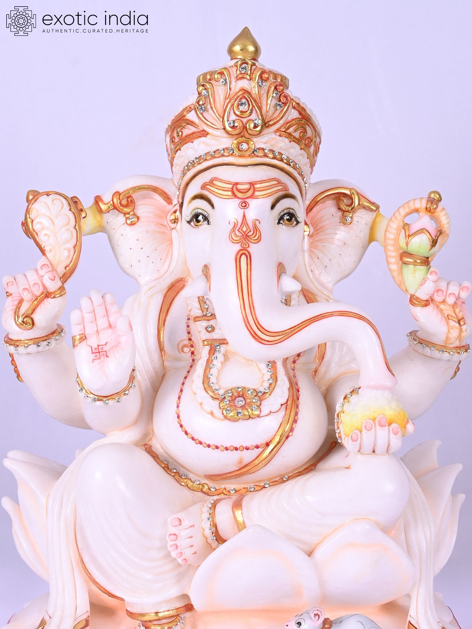 Observe the intricate details that elevate this sculpture beyond mere representation. Adorned with subtle yet striking ornamentation, its four arms are positioned in symbolic gestures, while the gentle sway of the trunk and the serene expression on its face convey profound peace. The delicate hand painting, accented with tasteful gold leaf and shimmering embellishments, highlights the divine nature and adds a radiant, luxurious finish. This piece, measuring approximately 18 inches in height, stands as a substantial yet gracefully proportioned work of art.