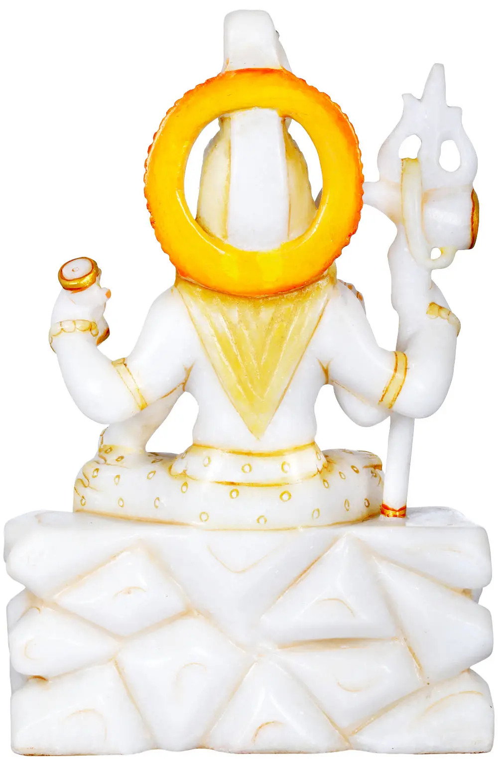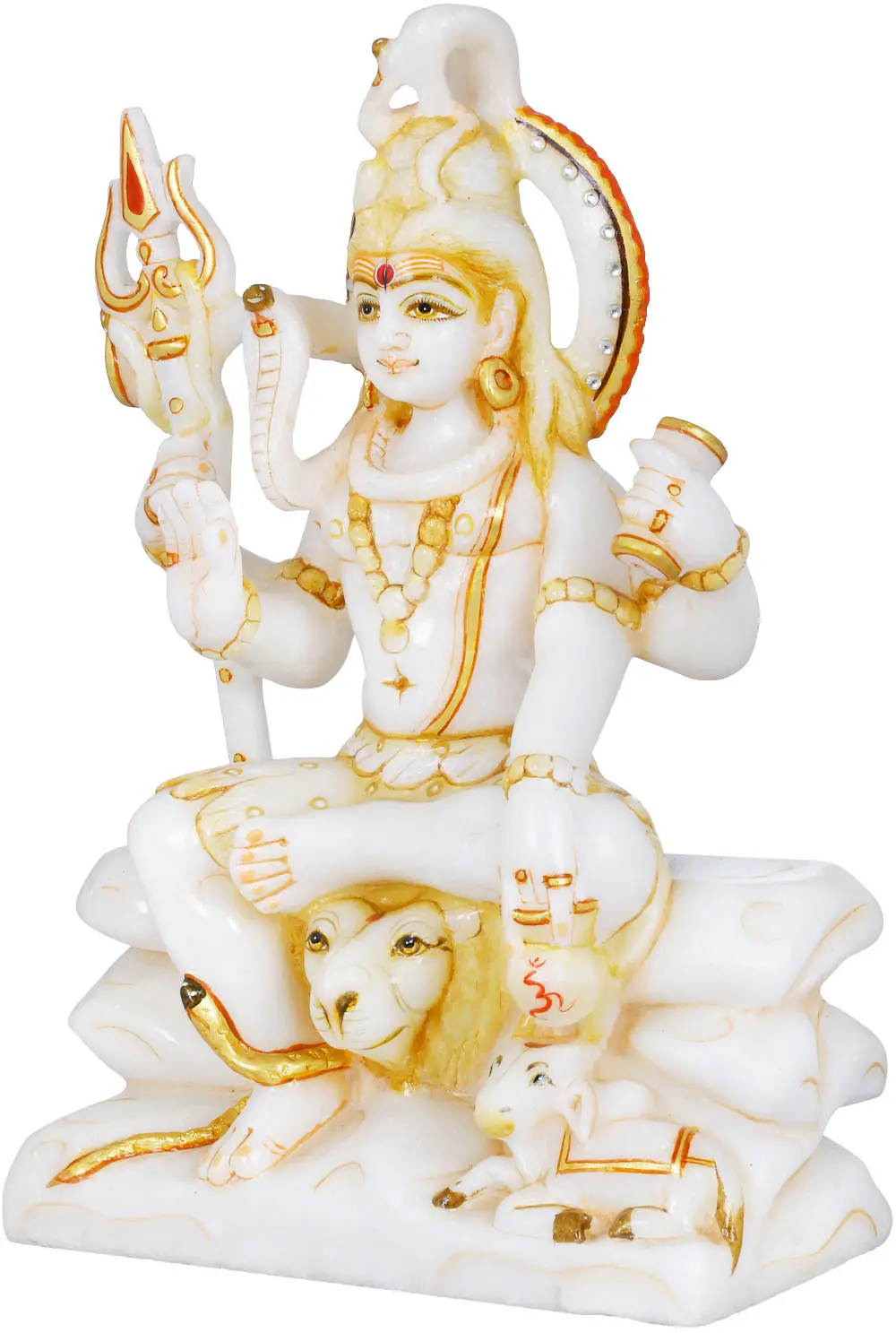 The artistry of this marble statue is truly remarkable. The sculptor has brought to life the intricate details of Lord Shiva's divine form. His serene expression, adorned with a third eye on his forehead and a crescent moon in his matted locks, speaks of his transcendence and eternal consciousness. A serpent, Vasuki, coils around his neck, a symbol of his mastery over poison and his connection to the primal forces of the universe. The golden embellishments that grace his attire and adornments, such as the necklaces and bracelets, add a touch of opulence and highlight the divine radiance of the deity. The halo behind his head signifies his omnipotence and omnipresence.