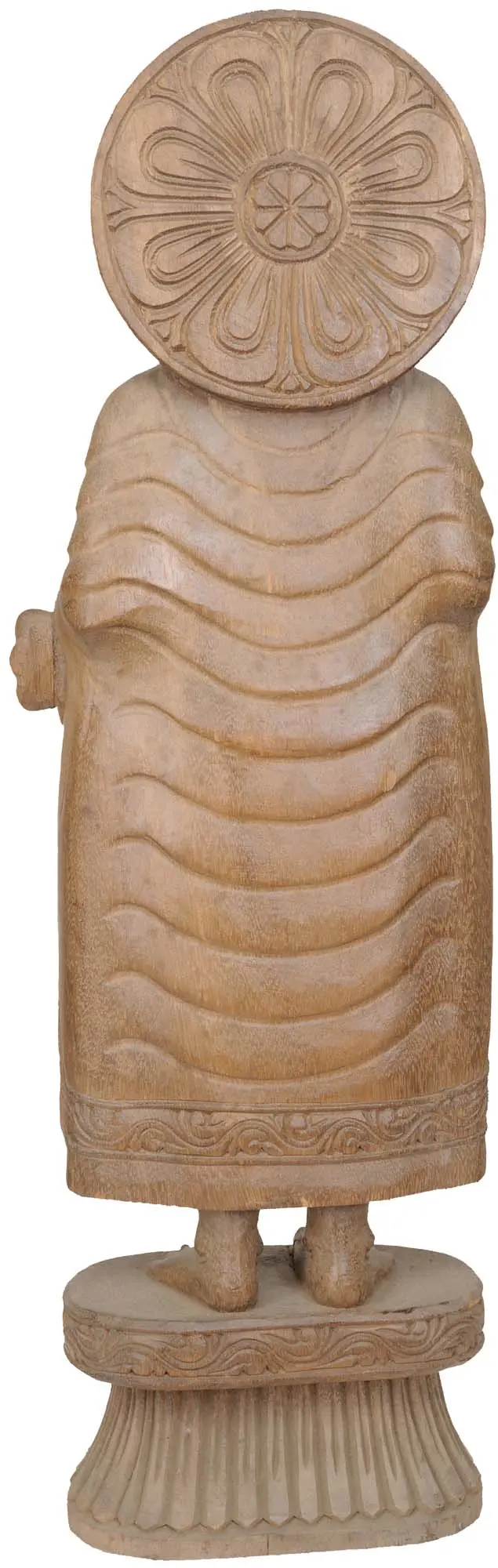 This exquisite wooden sculpture captures the serene and compassionate visage of the Buddha, an icon that has inspired millions across centuries. Hand-carved with meticulous attention to detail, the artistry reflects a rich tradition of South Indian temple wood carving, a craft passed down through generations. The warm, natural tone of the wood lends an earthy authenticity to the piece, inviting contemplation and spiritual reflection. The figure stands gracefully, its posture radiating a sense of calm power. The robe is rendered with flowing lines, suggesting movement and the gentle drape of fabric. The face, with its closed eyes and subtle smile, conveys a profound sense of inner peace and wisdom. A halo-like carving behind the head signifies enlightenment and the Buddha's transcendence.