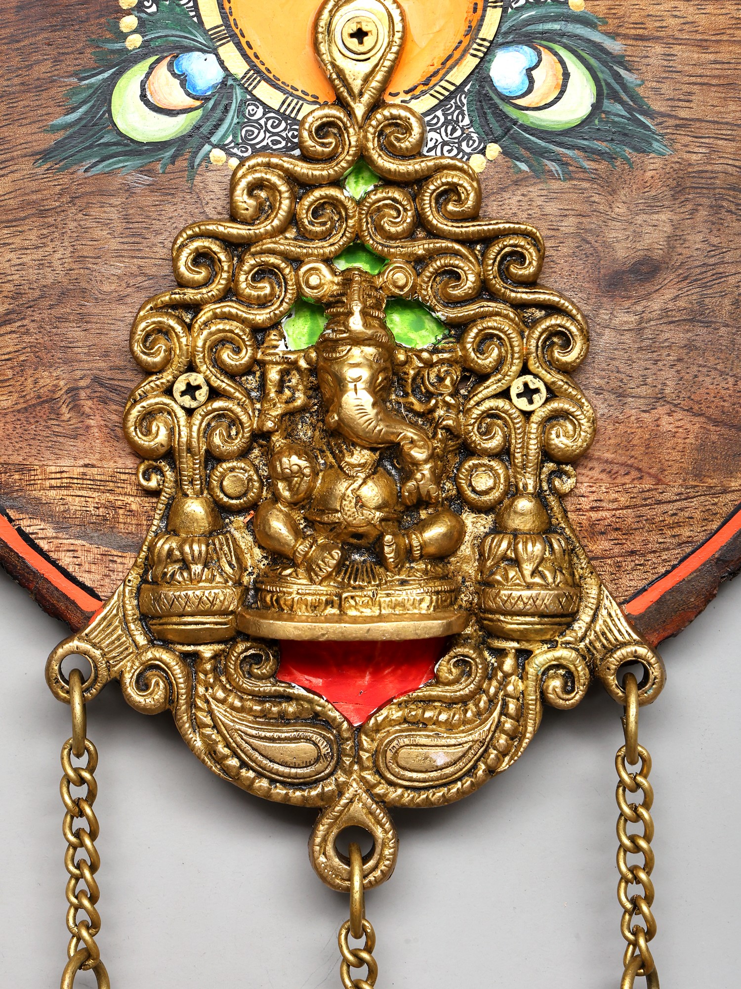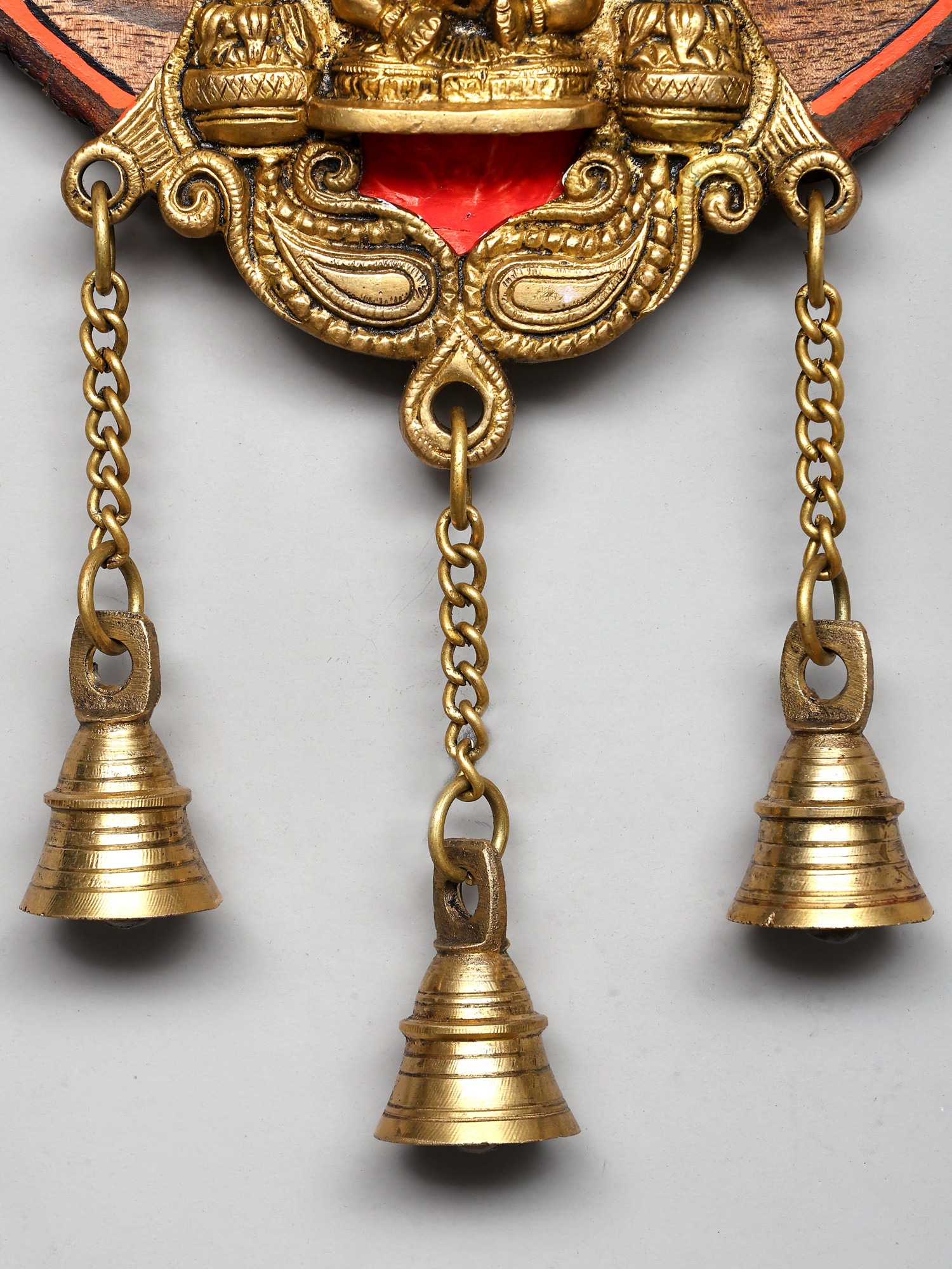 12" Blessing Lord Ganesha Wall Hanging Fame with Bells | Brass and Wood