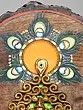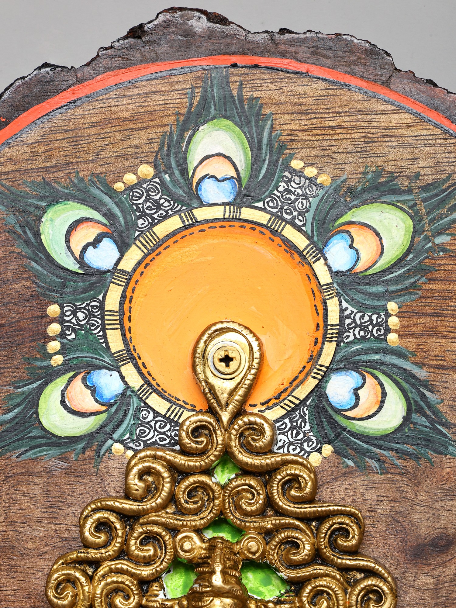 The central Ganesha figure is set against a hand-painted wood frame showcasing a vibrant peacock feather design.
