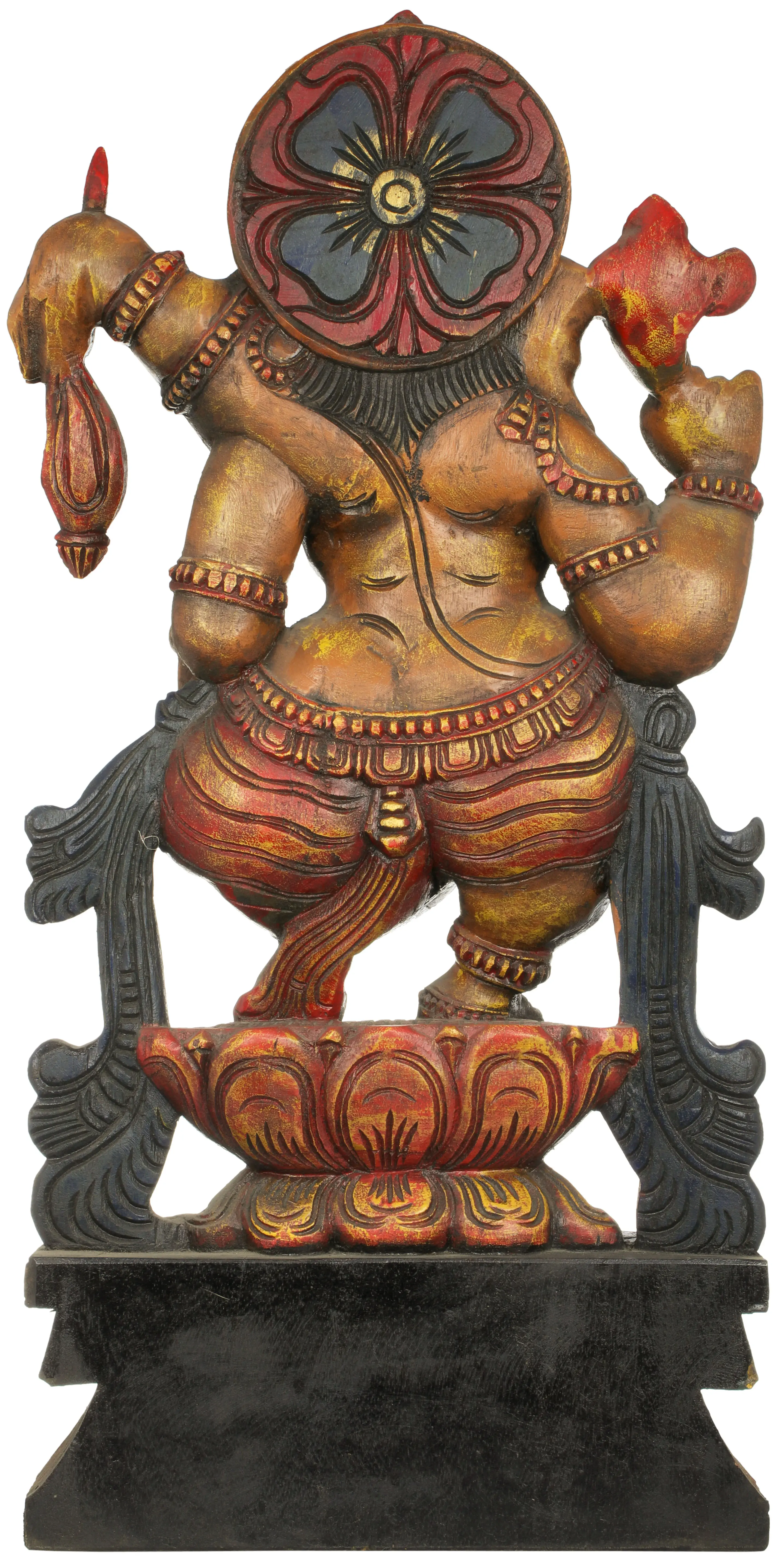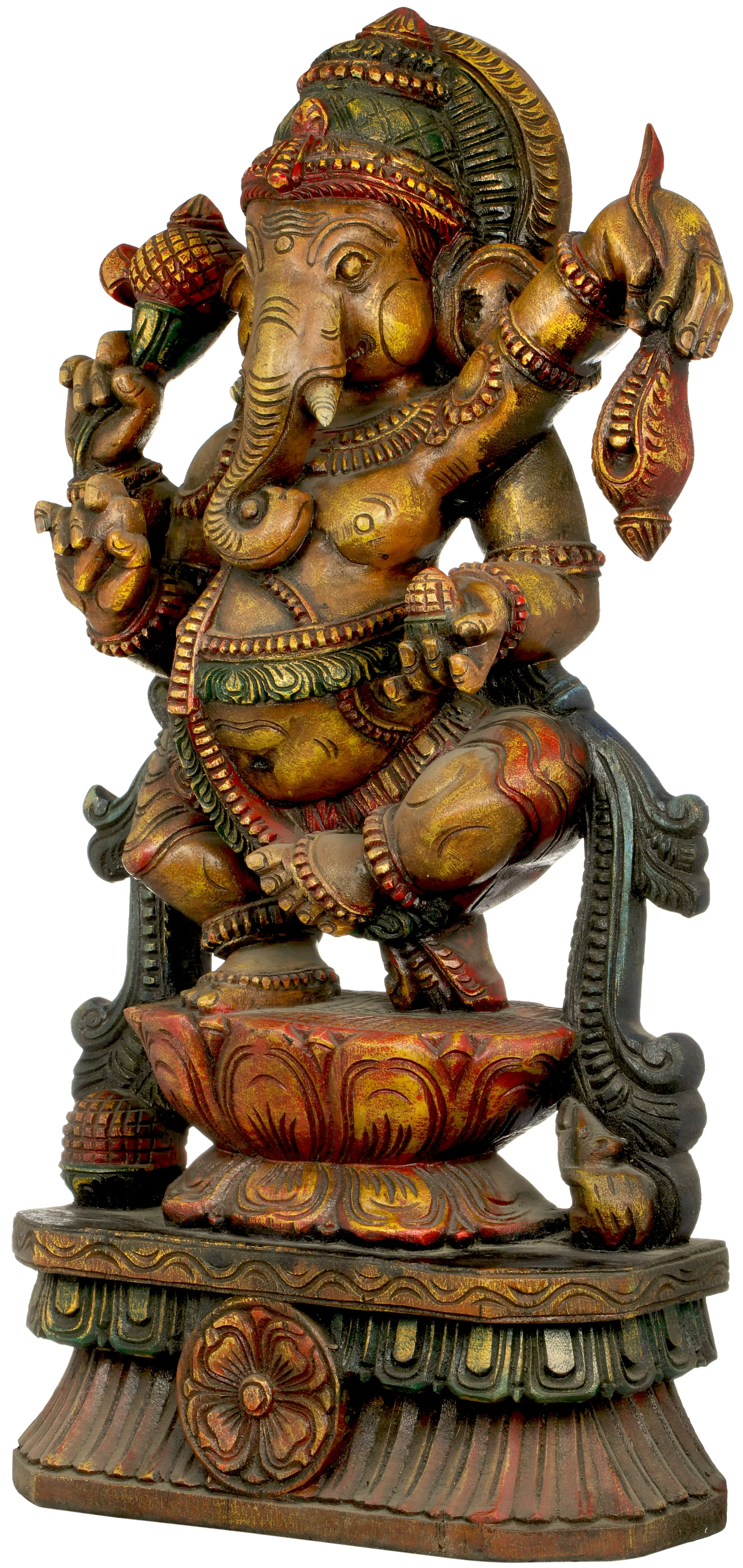This exquisite wooden carving depicts Lord Ganesha, the beloved elephant-headed deity, in a dynamic pose atop a magnificent lotus. Ganesha, revered as the remover of obstacles and the patron of arts and sciences, is often invoked at the beginning of any new venture. This particular rendition captures the joyous and celebratory aspect of the divine, showcasing his playful spirit and divine grace. The intricate details of the carving, from the elaborate headdress and divine ornaments to the textures of his skin and the flowing drapery, speak to the artisan's skill and devotion. Ganesha's multiple arms, each carrying symbolic items such as the goad, noose, and a modak (a sweet delicacy), are dynamically positioned, enhancing the sense of movement and energy in the sculpture.
