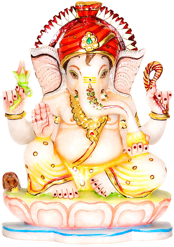 The unique feature of this sculpture is Ganesha's headgear known as a pagdi (turban). It is tied here in the typically Rajasthani fashion, which is not surprising since this artwork was created in Jaipur, the capital city of Rajasthan.