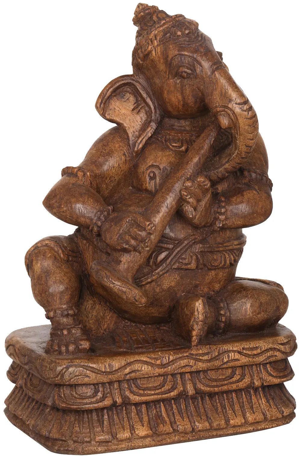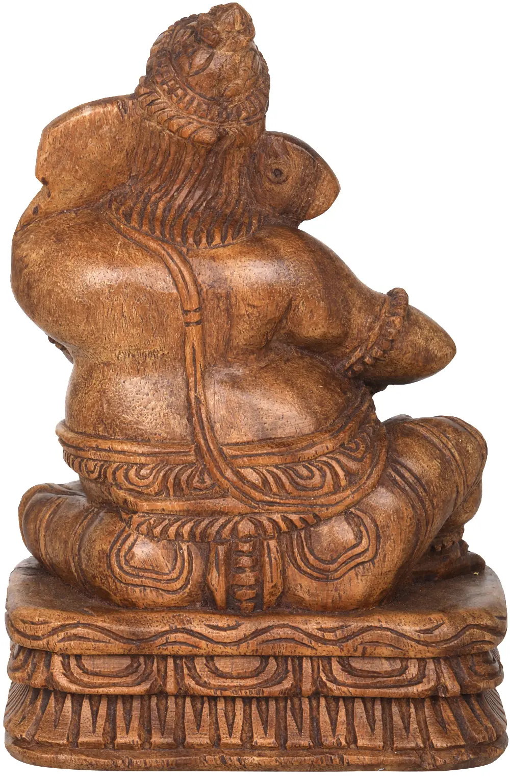 Sculpted in dark brown wood, the statue radiates an aura of timeless artistry. Ganesha's divine presence is emphasized as he sits atop a lotus podium, symbolizing his elevated stature and patronage over virtues associated with wisdom. As the patron of arts and crafts, the wooden statue captures Ganesha as a guardian in fostering creativity and warding off negativity.