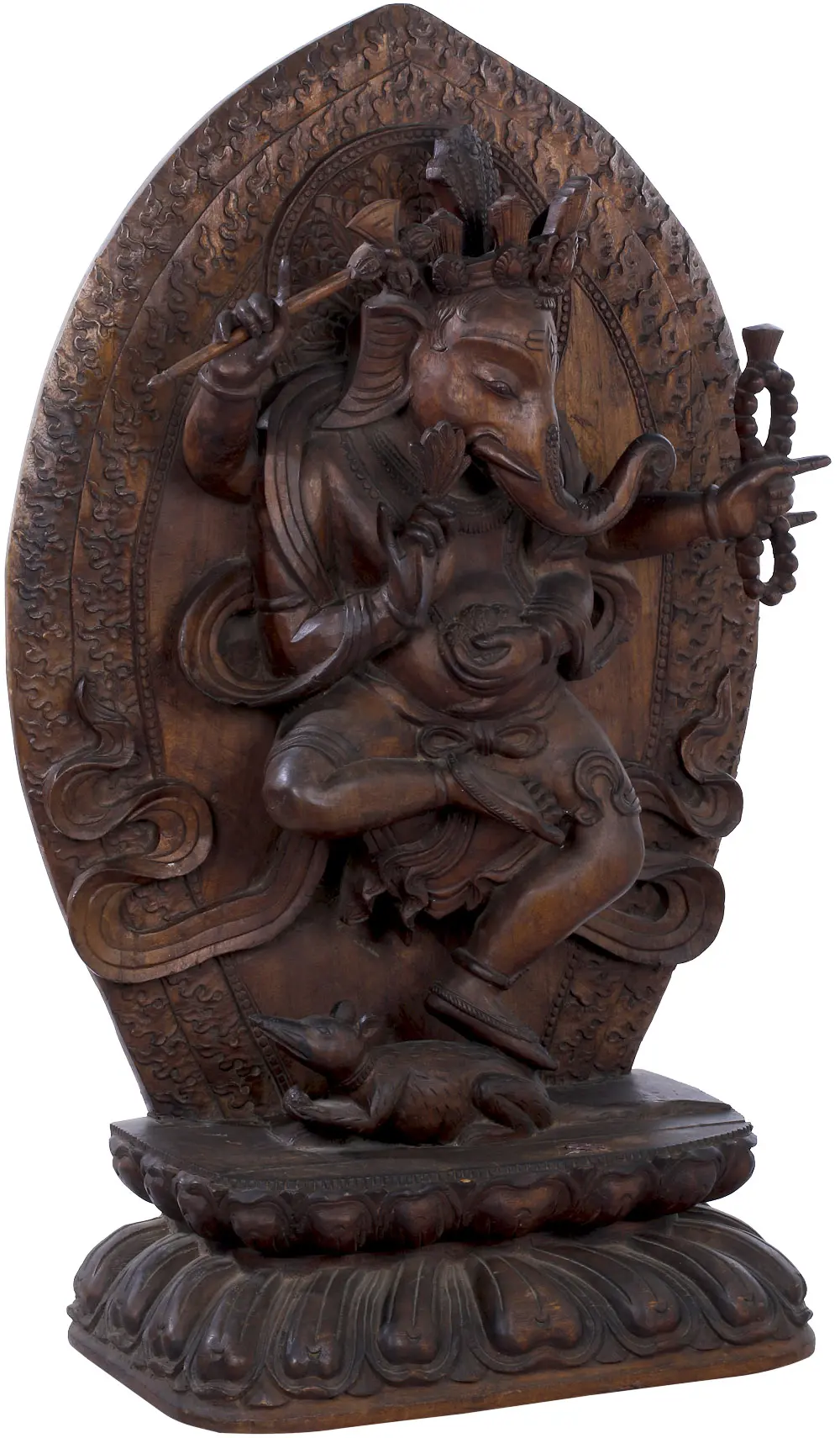The style of this Ganesha carving is distinctly Nepalese, characterized by its intricate detailing, often incorporating floral and geometric patterns that surround the central deity. The arched backdrop, adorned with auspicious symbols and radiating energy, frames Ganesha's divine dance, enhancing the sense of dynamism and spiritual power. Such carvings are often found in temples and monasteries throughout Nepal, serving as focal points for worship and meditation. The wood itself, chosen for its warmth and ability to hold fine detail, is carved using traditional techniques passed down through generations of skilled artisans, ensuring a piece of art that is both beautiful and imbued with spiritual significance. This sculpture serves as a testament to the enduring artistic traditions of Nepal and its profound connection to Hindu iconography.