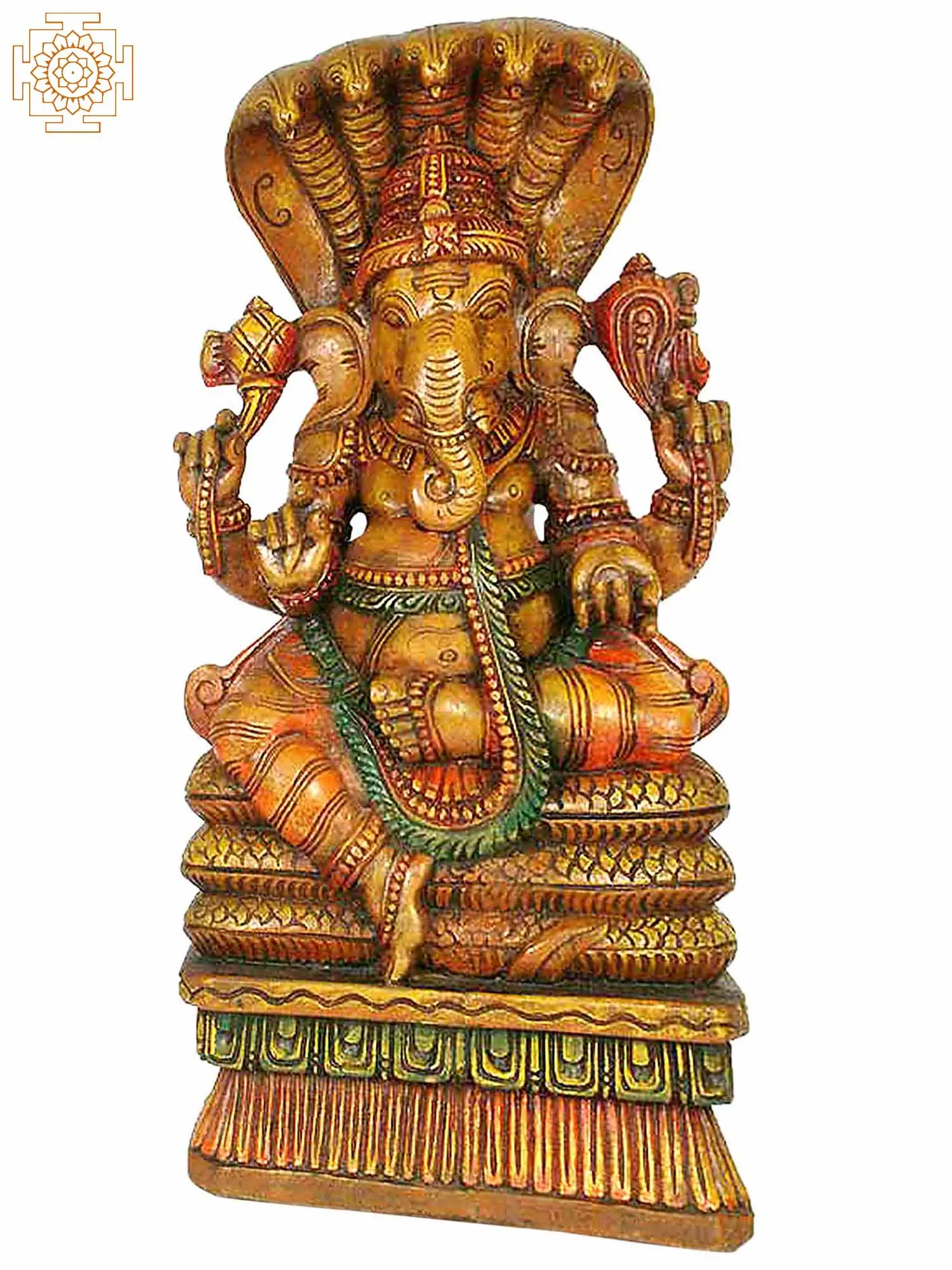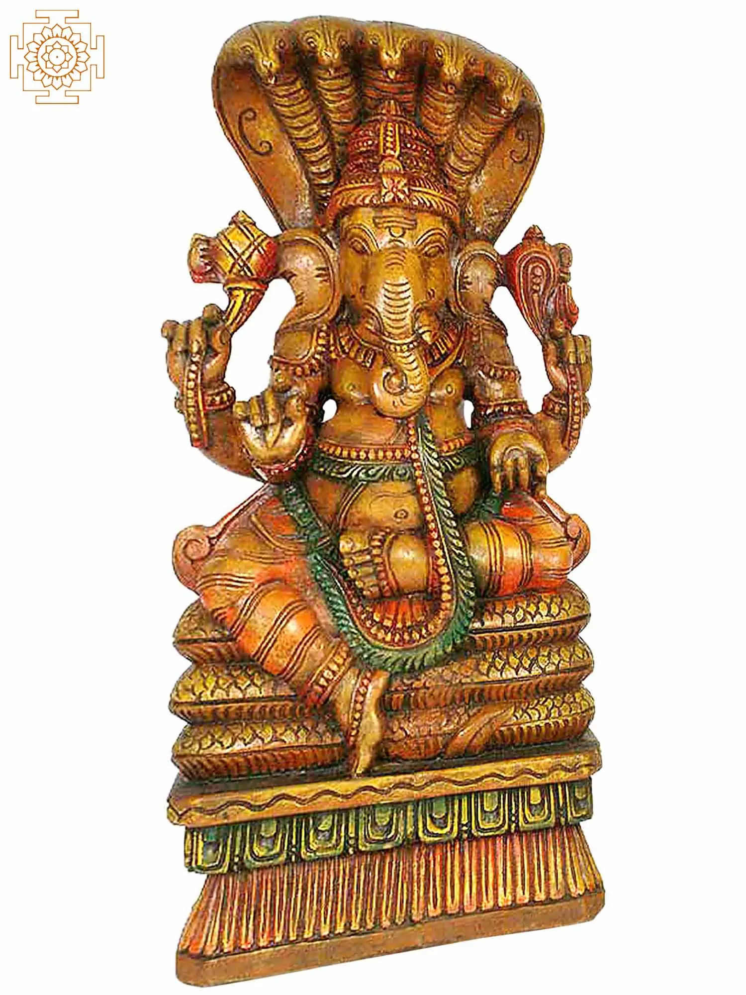 The majesty of Ganesha is magnified by the presence of Sheshanaga, the multi-headed serpent king, who is often seen as an important support. Sheshanaga is depicted as an immense serpent who represents the primordial cosmic waters and serves as the bed for Lord Vishnu during the periods between creation and destruction. Shesha’s many heads are a symbol of the infinite nature of time and the cyclical nature of existence. The multiple heads protect and shelter Ganesh like an umbrella and provides an ethereal aura. The depiction of Ganesha atop Sheshanaga is a testament to the inter-connectedness of all things. It symbolizes the control of wisdom over the vast and sometimes chaotic forces of nature and the ability to navigate the challenges of life with strength and grace.