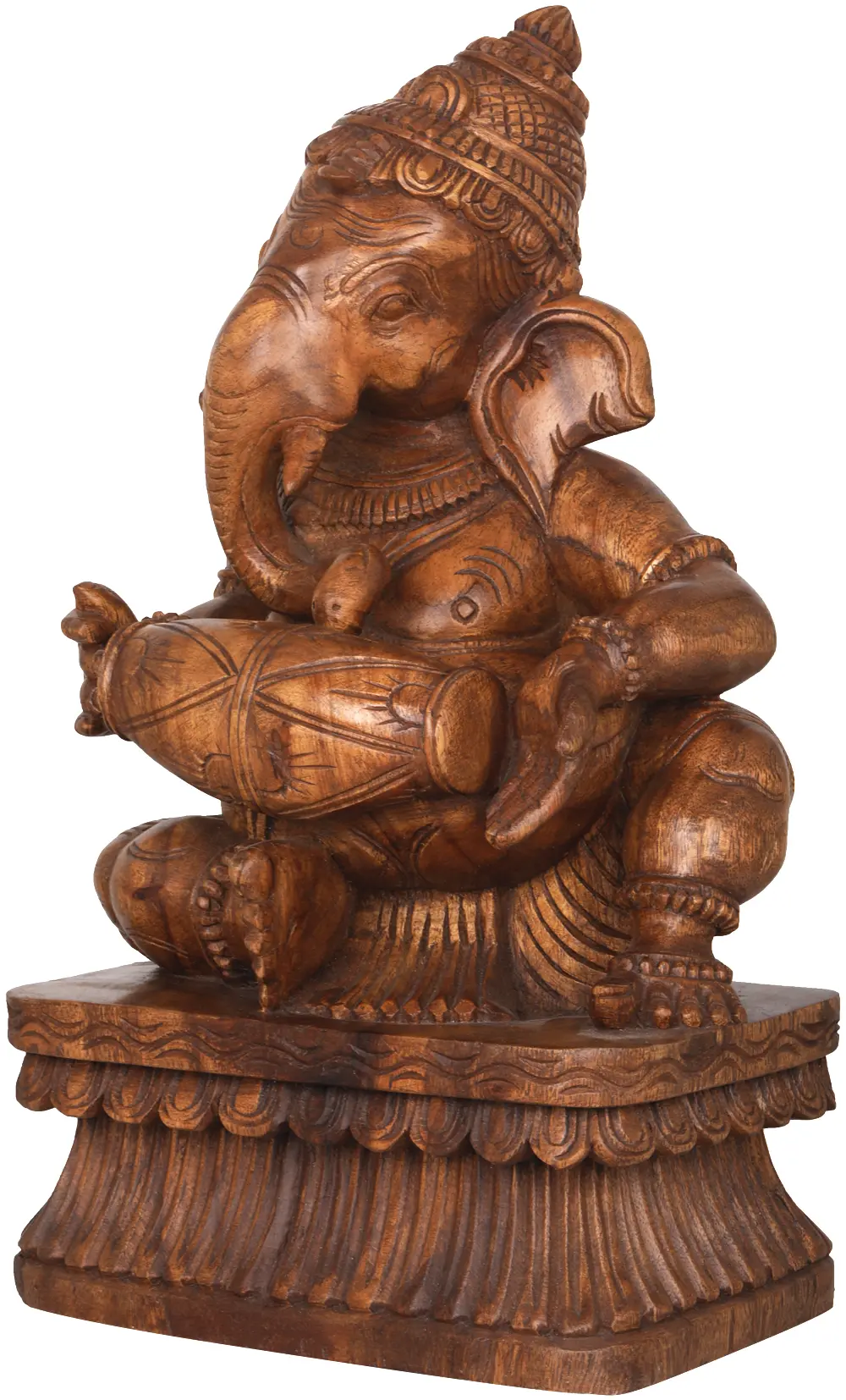 Immerse yourself in the divine melody and auspicious presence of Lord Ganesha, the remover of obstacles and the bestower of wisdom, as captured in this exquisite South Indian temple wood carving. This magnificent statue depicts Ganesha in a joyous posture, his hands skillfully poised to strike a dholak, a traditional two-headed drum. The dholak itself is intricately carved, adorned with patterns that speak of ancient rituals and festive celebrations. The very act of Ganesha playing the drum evokes a sense of vibrant energy and harmonious vibrations, mirroring the belief that his divine music dispels negativity and usher in prosperity.