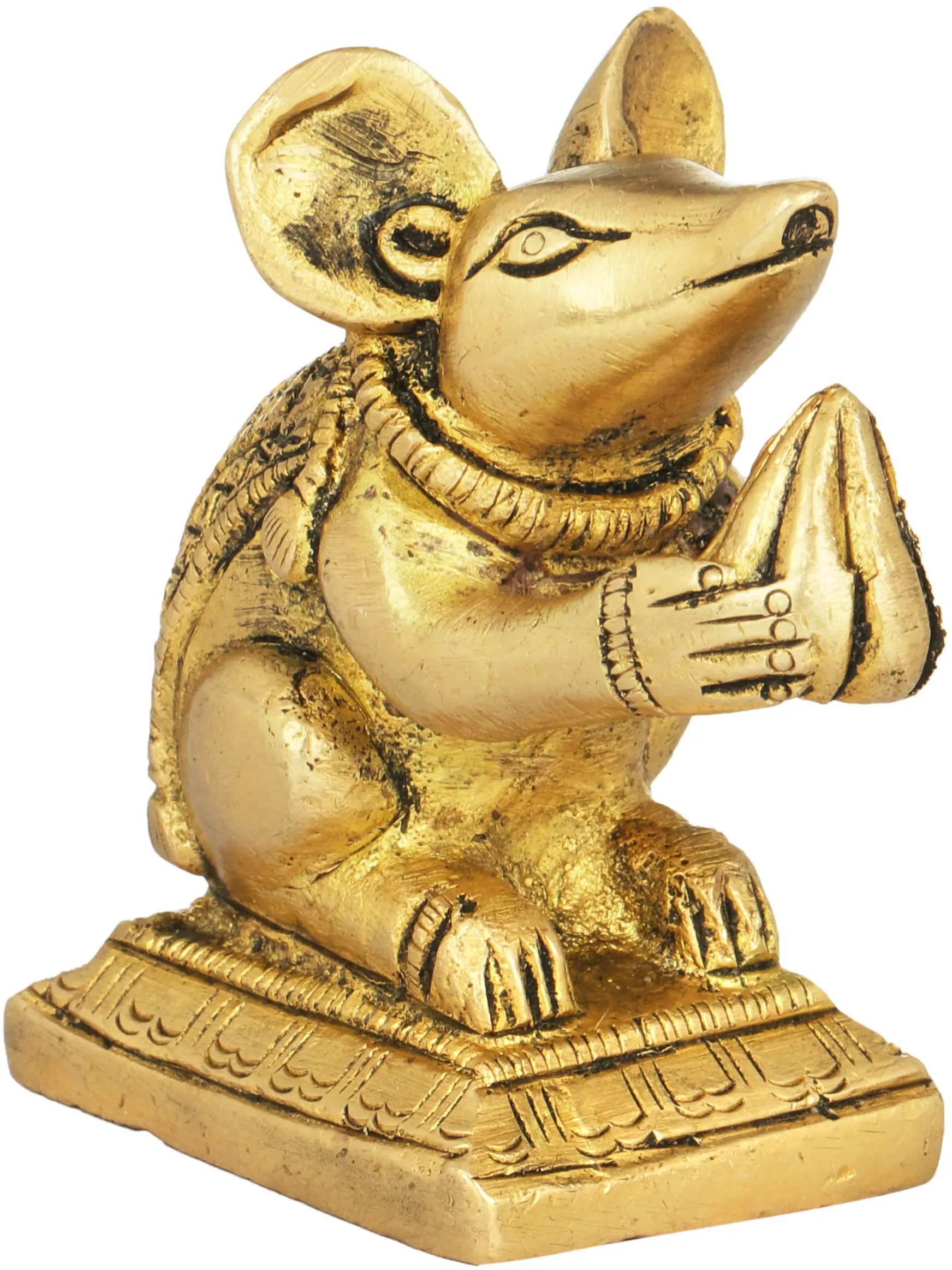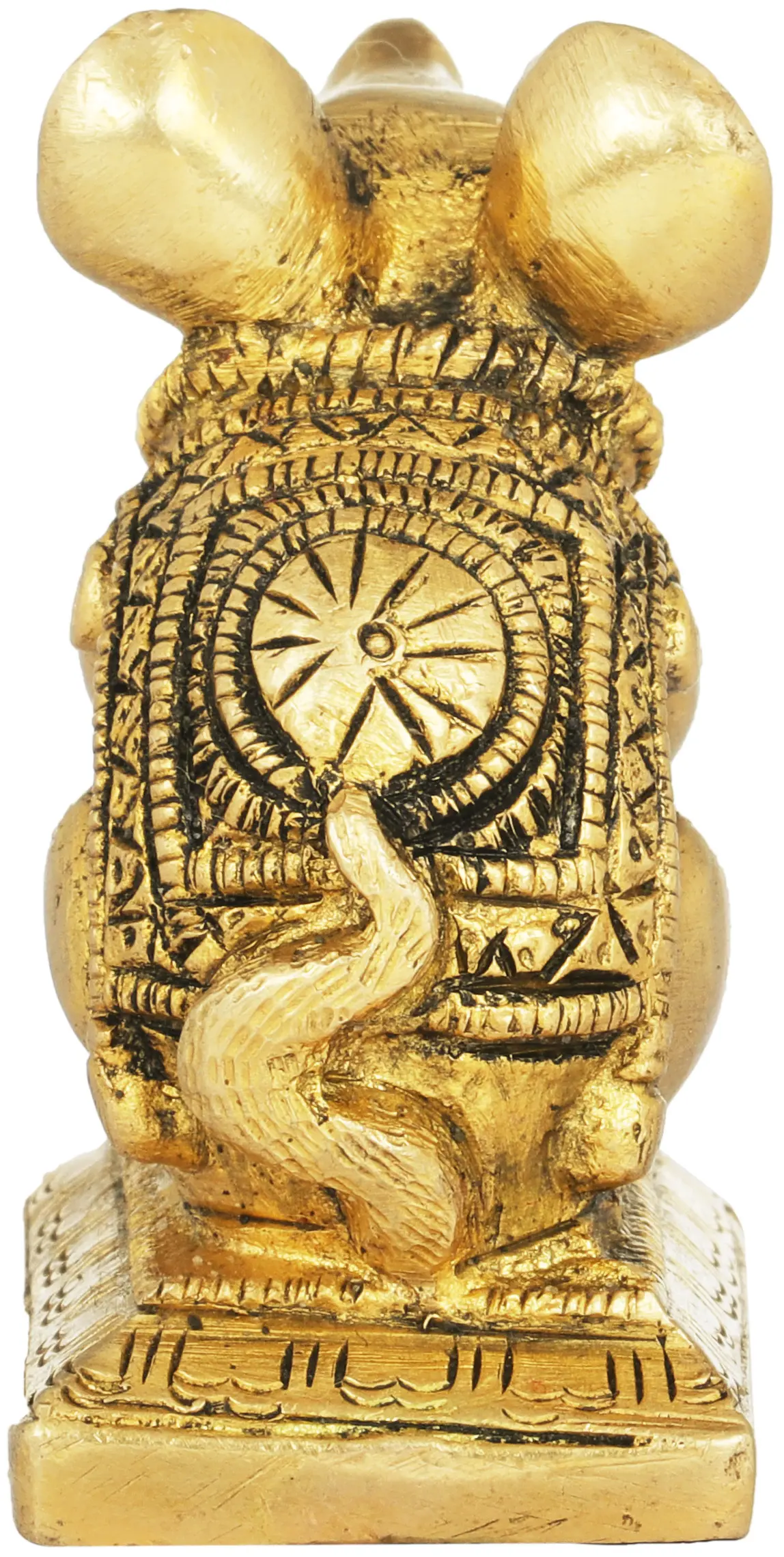 This statue is meticulously crafted from durable brass, a metal revered for its purity and its association with prosperity and divine energy. The golden sheen of the brass evokes a sense of opulence and auspiciousness, making it a fitting representation of divine grace. The fine detailing on the rat's body, from the textured saddle blanket to the delicate patterns adorning its back, speaks to the artisan's skill and dedication. Each curve and contour has been thoughtfully rendered, bringing this sacred creature to life. The base, also sculpted from brass, features traditional motifs that add to its aesthetic appeal and spiritual significance.