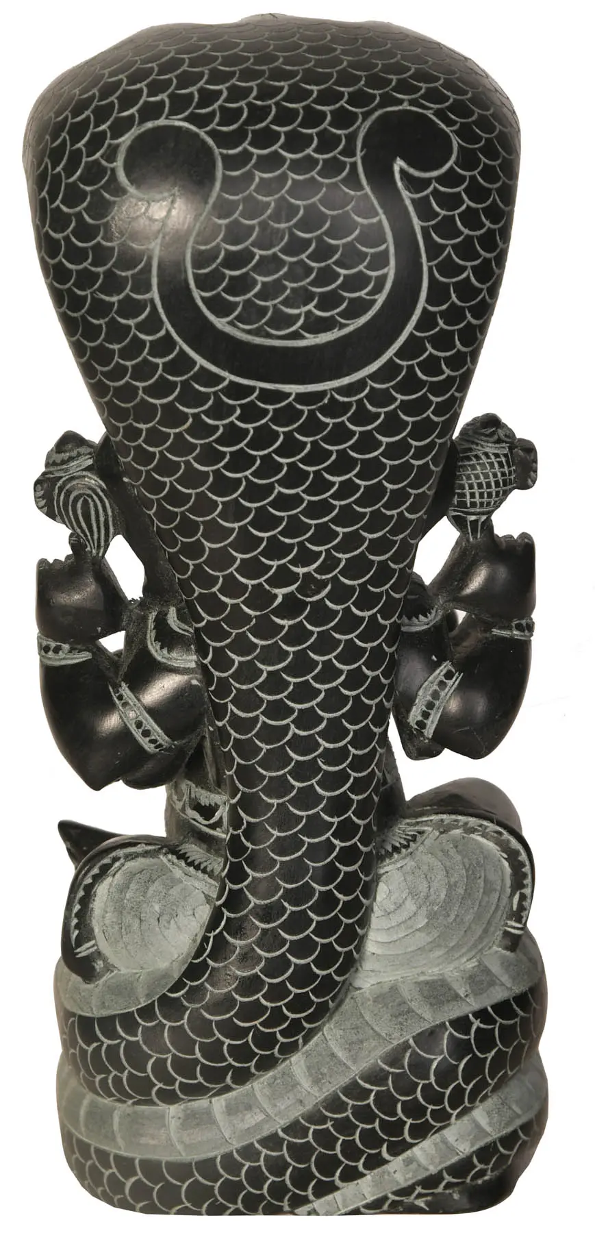 The skilled artisans of Mahabalipuram, a place steeped in ancient sculptural traditions, have brought this divine vision to life. The use of Katappa stone lends a unique texture and a timeless gravitas to the sculpture. Every curve of Ganesha's form, from his ever-compassionate eyes to the delicate carvings on his ornaments, speaks of devotion and meticulous craftsmanship. Observe the intricate details on his tusks, the subtle lines on his trunk, and the divine 'Om' symbol adorning his forehead – all meticulously rendered to evoke a sense of sacred awe. Ganesha's multiple hands are adorned with symbolic offerings. In one hand, he holds a conch shell, representing the primordial sound of creation and the awakening of consciousness. In another, a modak, his favorite sweet, symbolizes the sweetness of spiritual realization and the rewards of virtuous action. The way his hands are positioned, in blessings and gestures of protection, further emphasizes his benevolent nature and his power to bestow grace and prosperity. The coiled form of Sheshnaga beneath him, with its distinct scale patterns, is a testament to the artist's ability to imbue even the base with symbolic meaning, creating a complete and harmonious representation of divine power and cosmic order.