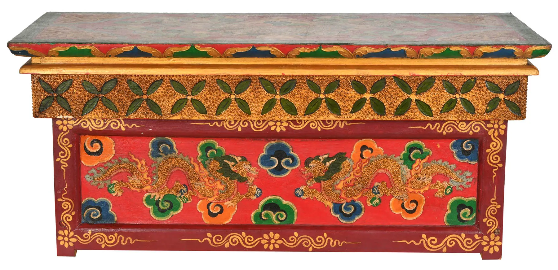 The side panels of the altar desk feature majestic dragons, rendered in striking gold against a vibrant red background. In East Asian and Tibetan cultures, dragons are powerful symbols of strength, wisdom, good fortune, and celestial power. They are believed to be controllers of water and weather, bringing rain vital for agriculture and prosperity. The presence of two dragons facing each other can symbolize balance, harmony, and the overcoming of duality. The swirling clouds surrounding them further emphasize their dominion over the skies and their auspicious nature. The intricate golden border between the lid and the sides, with its repeating floral or star-like motifs, adds an element of regal splendor and protection. The deep red base color is auspicious, symbolizing vitality, prosperity, and warding off evil.