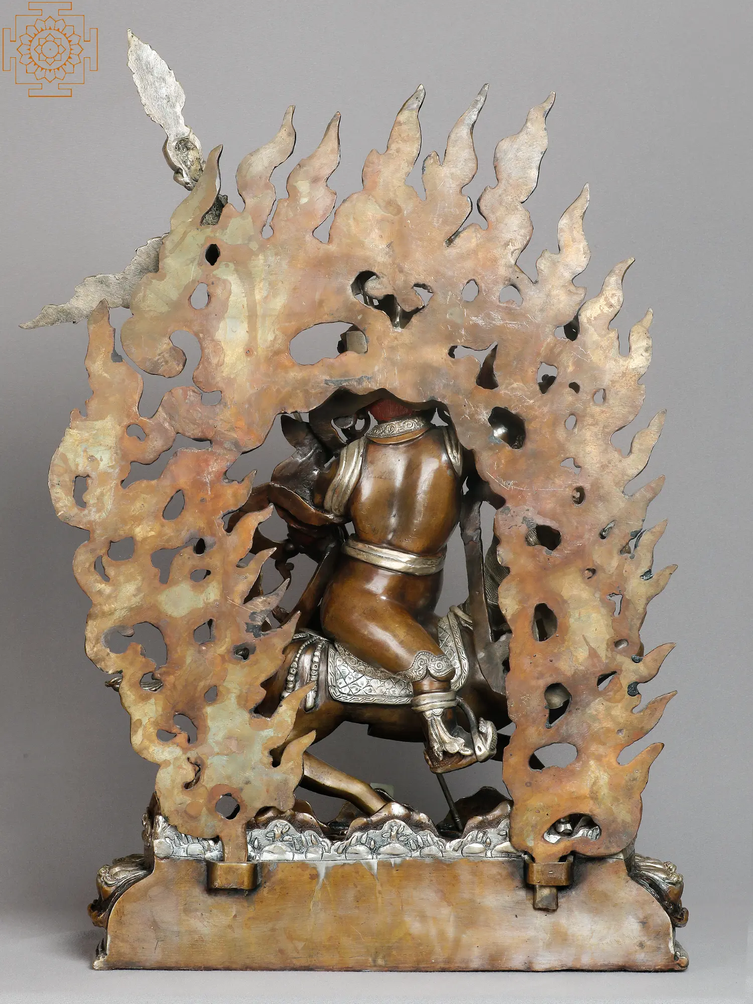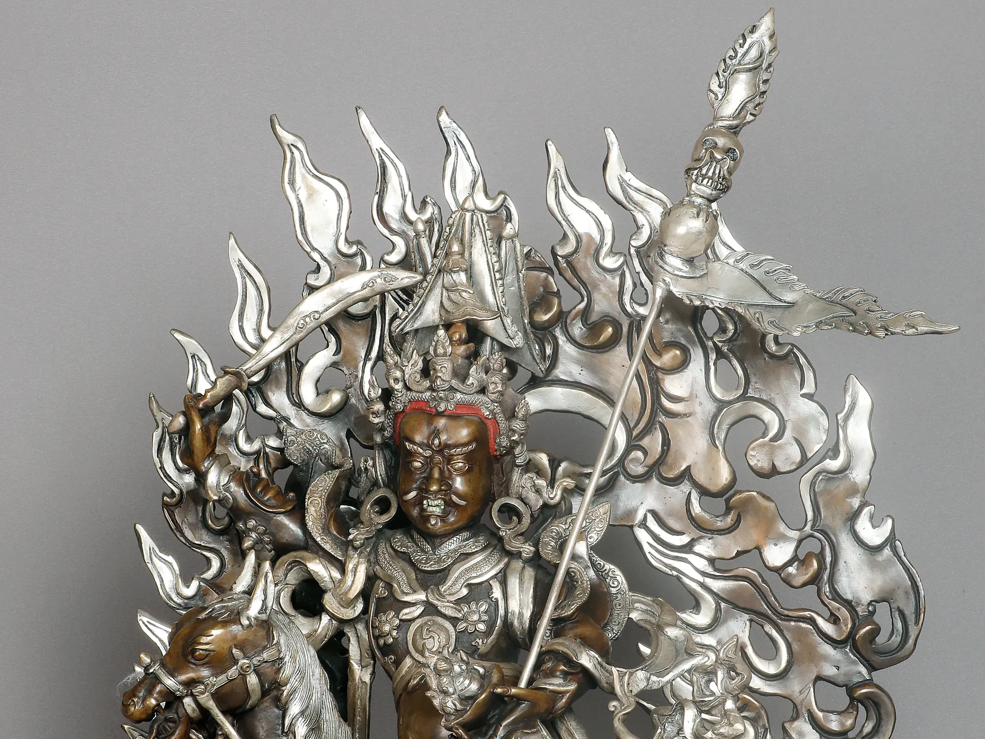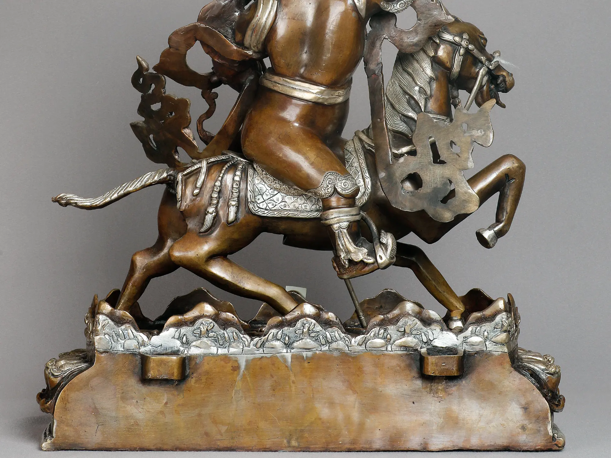 Gesar king in Tibetan, Bhutanese, and Nepalese Buddhism is a divine being who came down to the human realm to protect the people from the forces of evil. From an early age, Gesar king showed signs of ferociousness which was not destructive, but protective. This Nepalese statue is made with copper and shows a potent representation of Gesar king, riding his horse in a dynamic mood. The raised leg of his horse, the flaming aureole surrounding Gesar king, and the frills of the staff that fly swiftly, bring an additional sense of movement to this powerful icon.