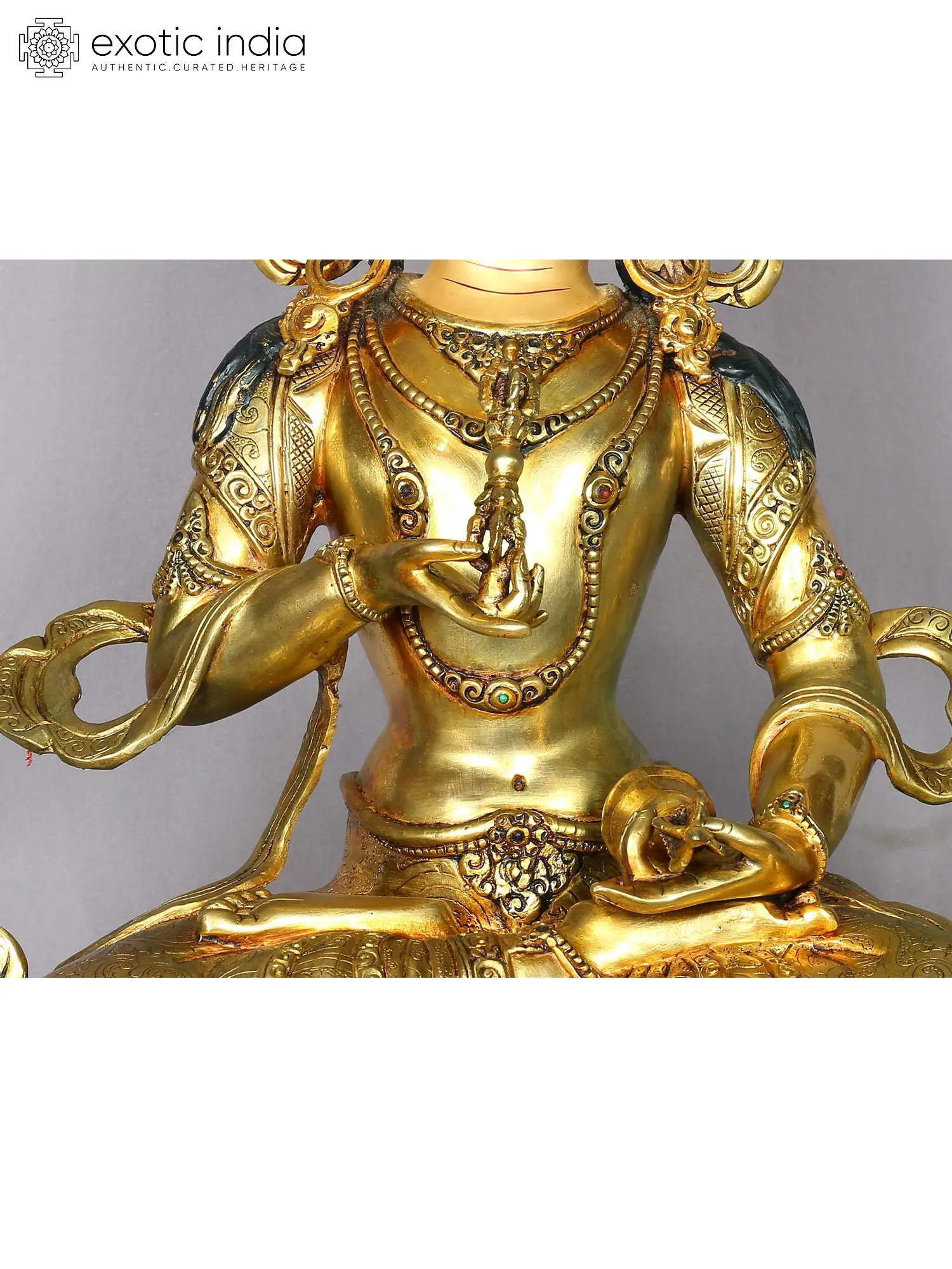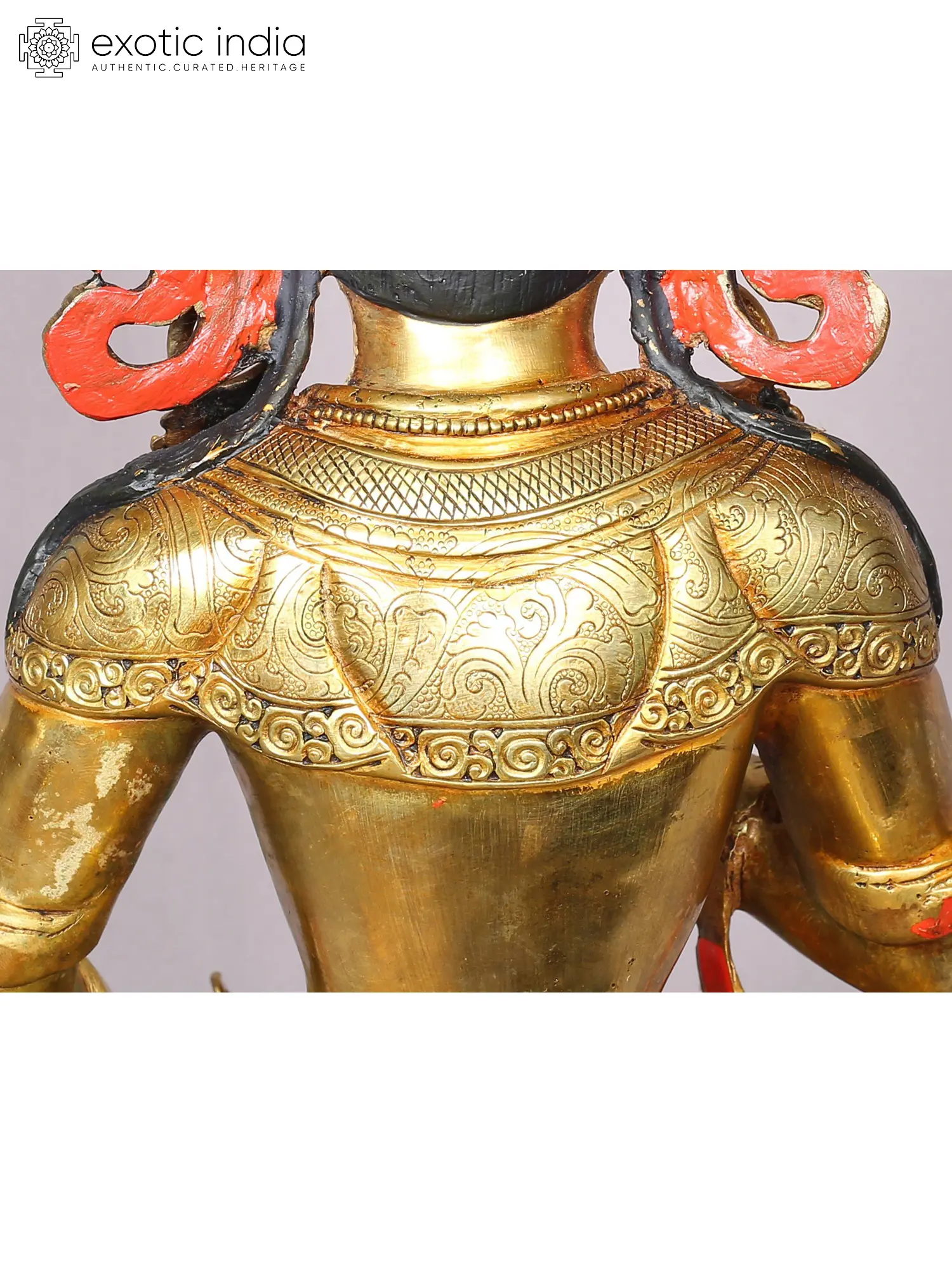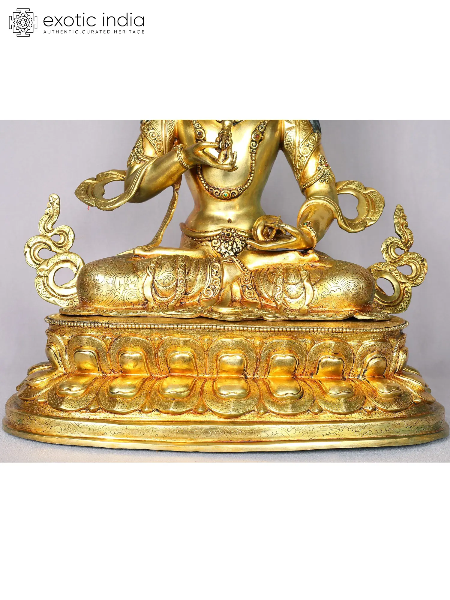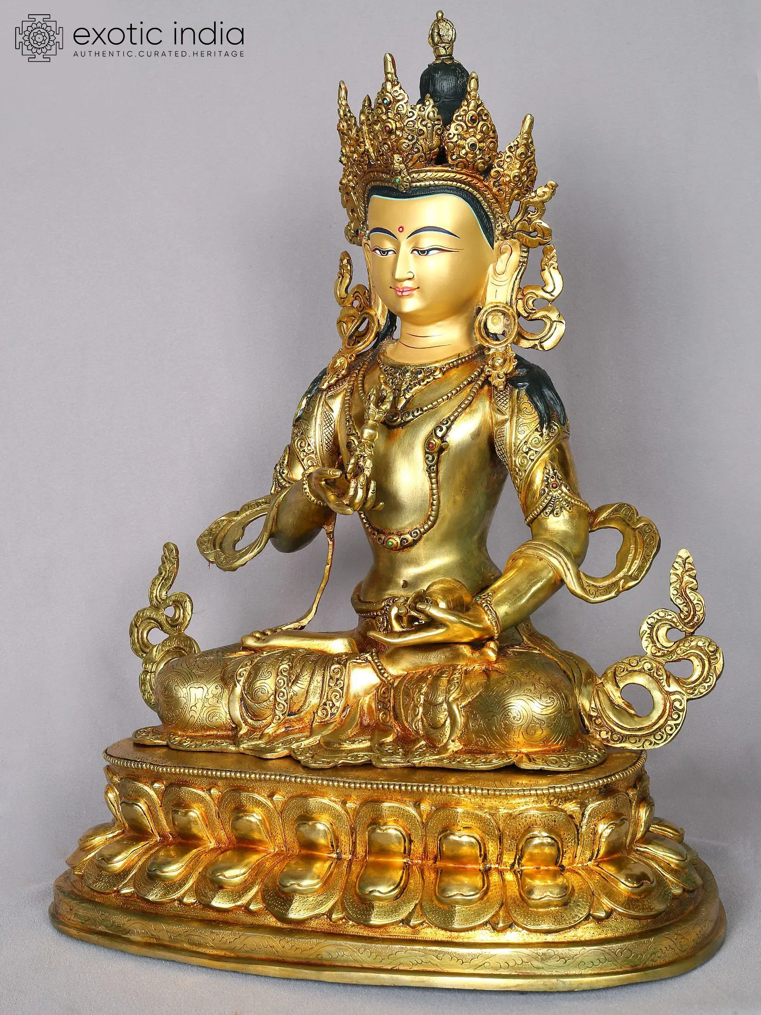 This gilded copper Nepalese statue of Vajrasattva presents the crown prince of dhamma attired brilliantly, gently bringing the Vajra- a symbol of wisdom and male element close to his heart, while placing the bell (a motif of compassion and feminine qualities) on his lap, parallel to the Vajra. A balance of these virtues is the way to supreme awakening, an idea that is underlined by this Vajrasattva icon. With gentleness on his face and delicateness in his attire, this statue of Vajrasattva emerges as the glorious fruit of enlightenment.