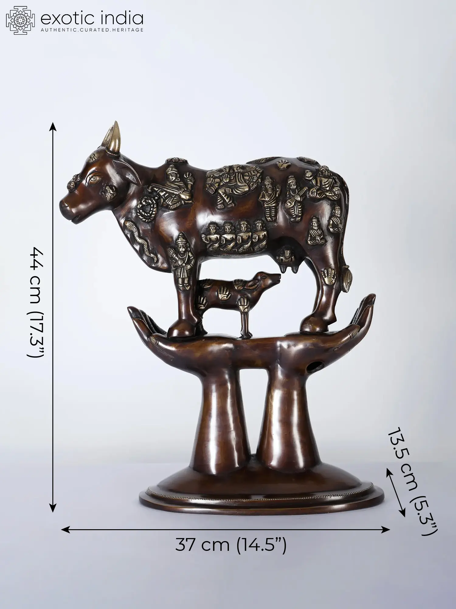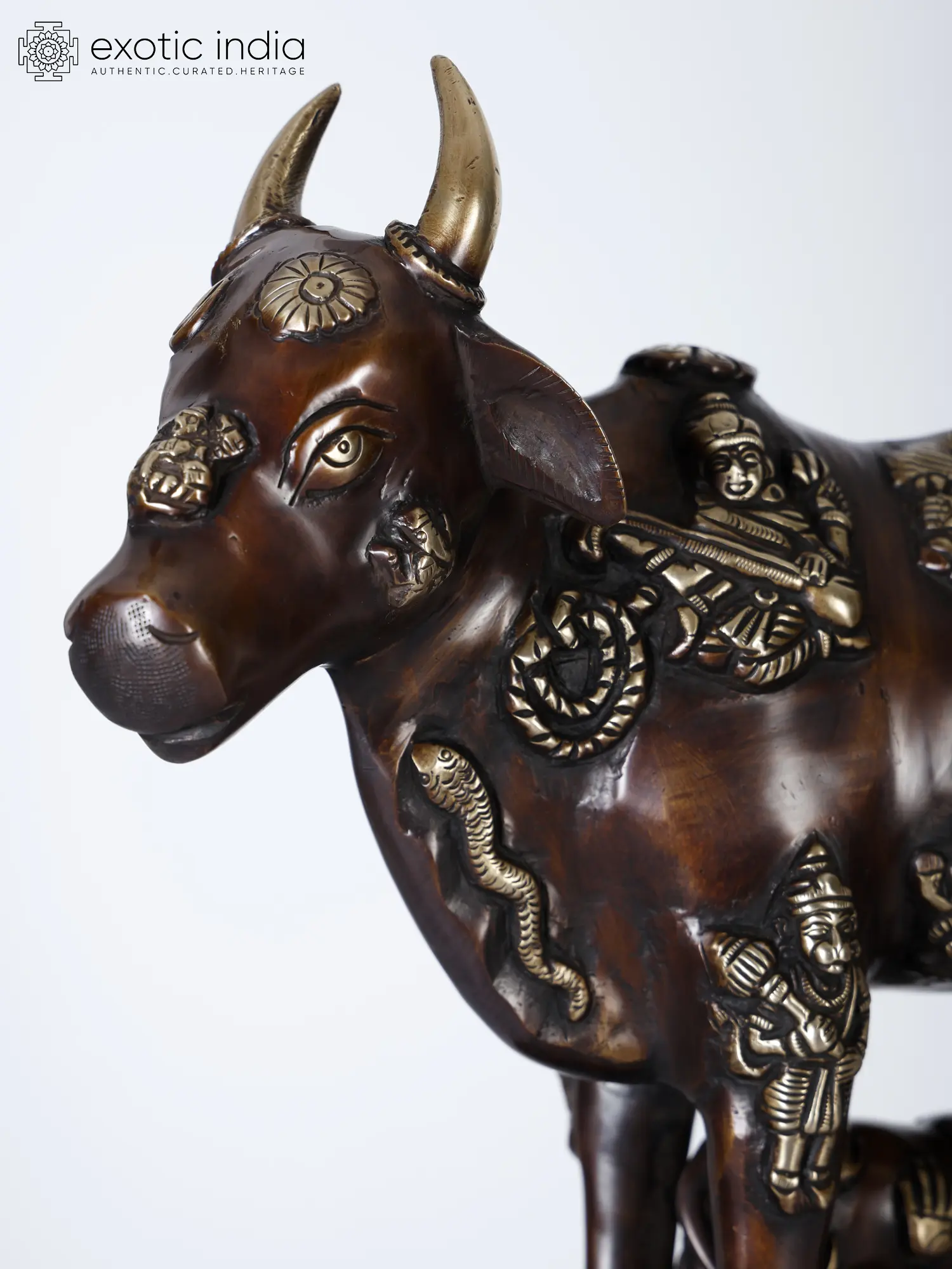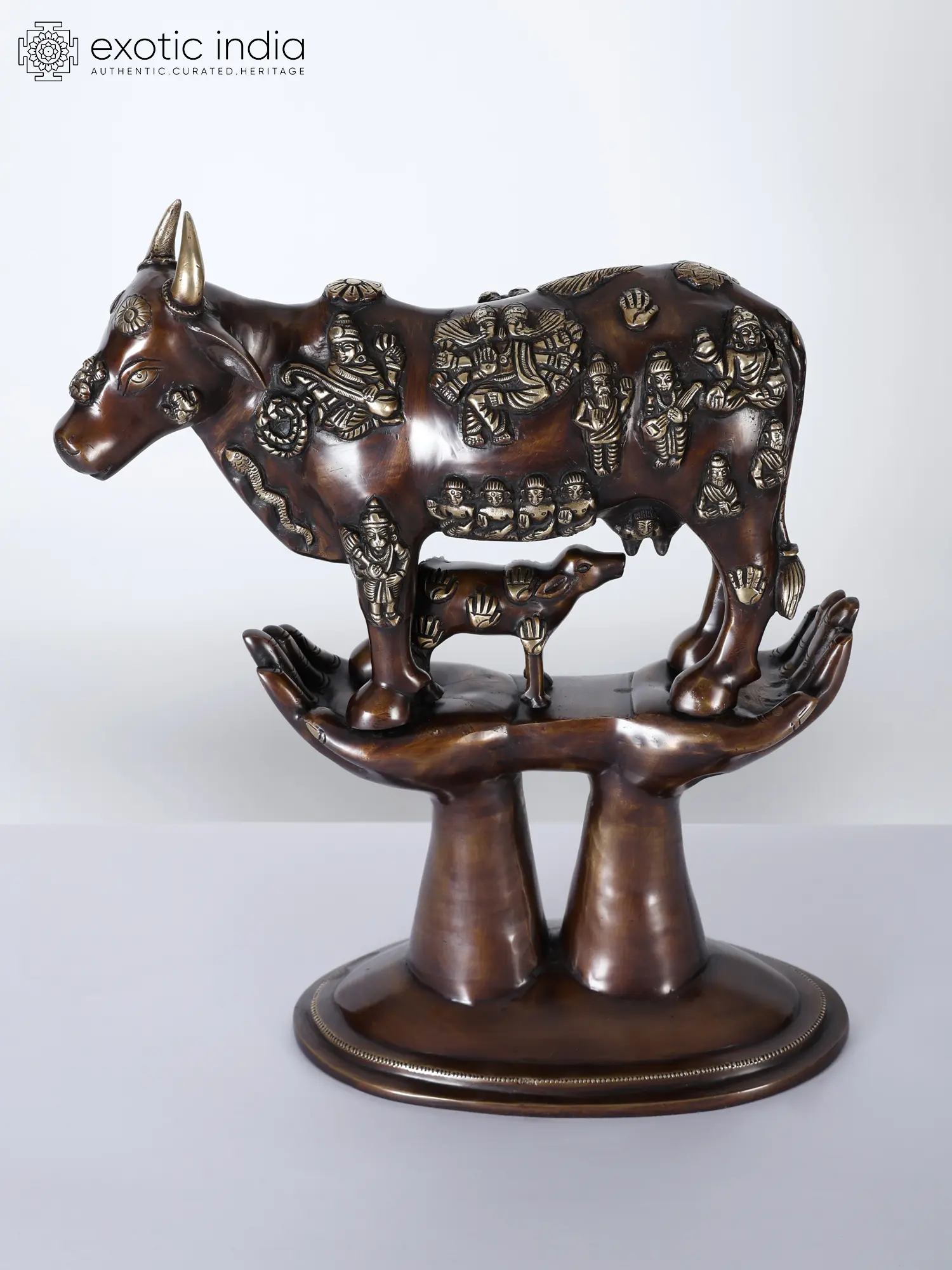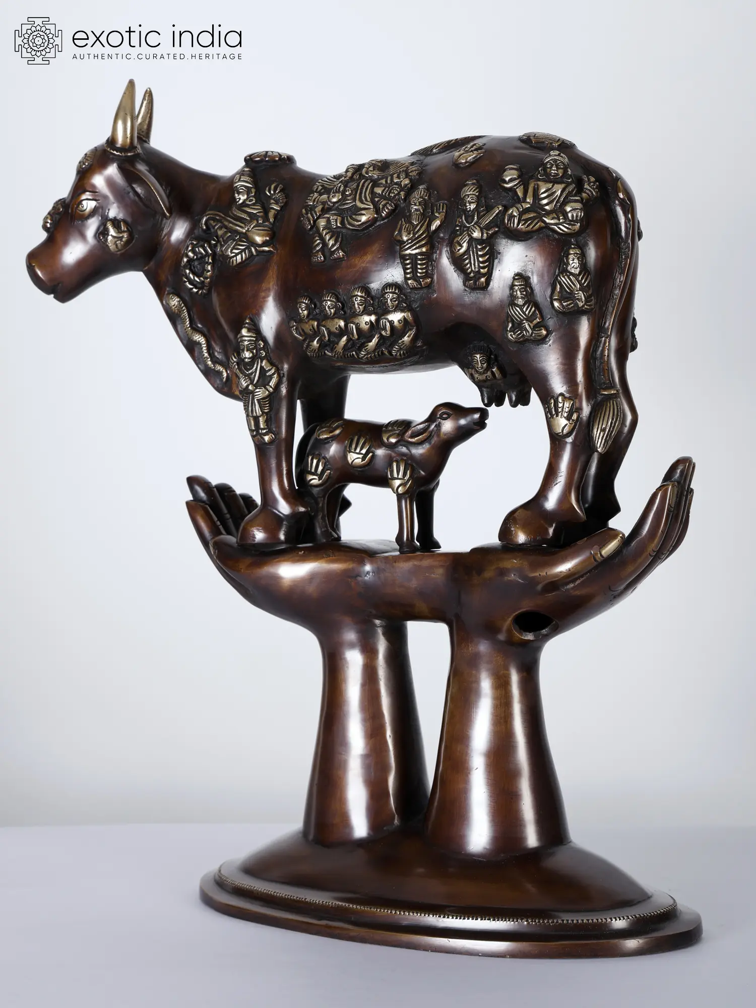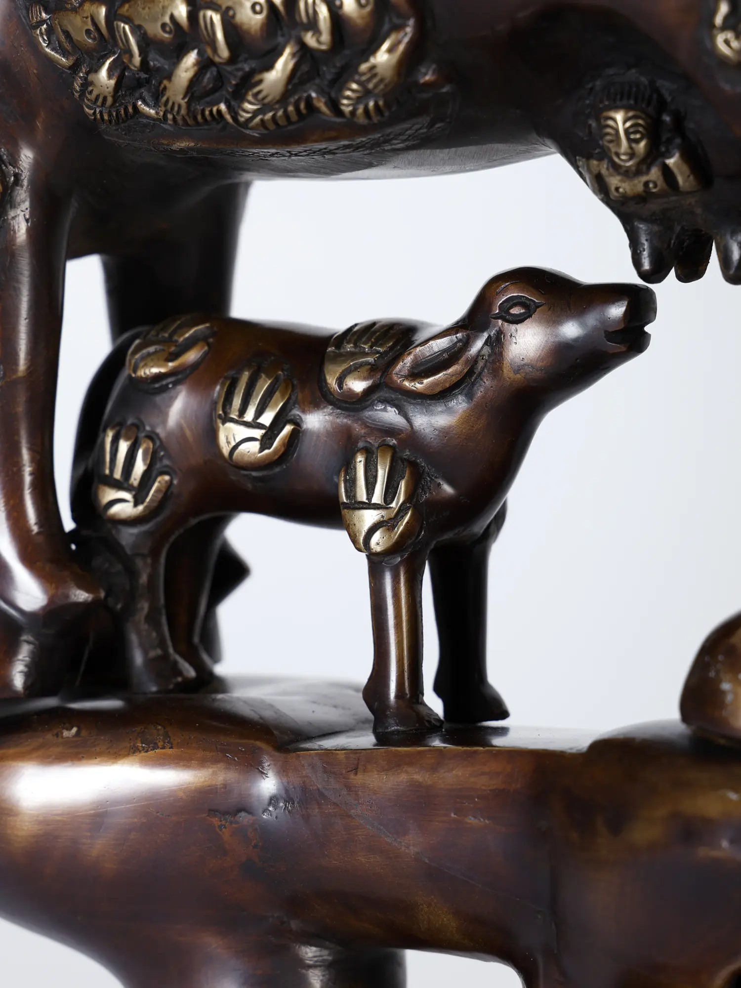 The Adi Parva of the Mahabharata narrates this legend, of the heavenly bovine Kamadhenu. Inspired by the epic story, the sculptor of this splendid brass artwork depicts her being lifted in two hands, belonging probably to the Lord of the Ocean.