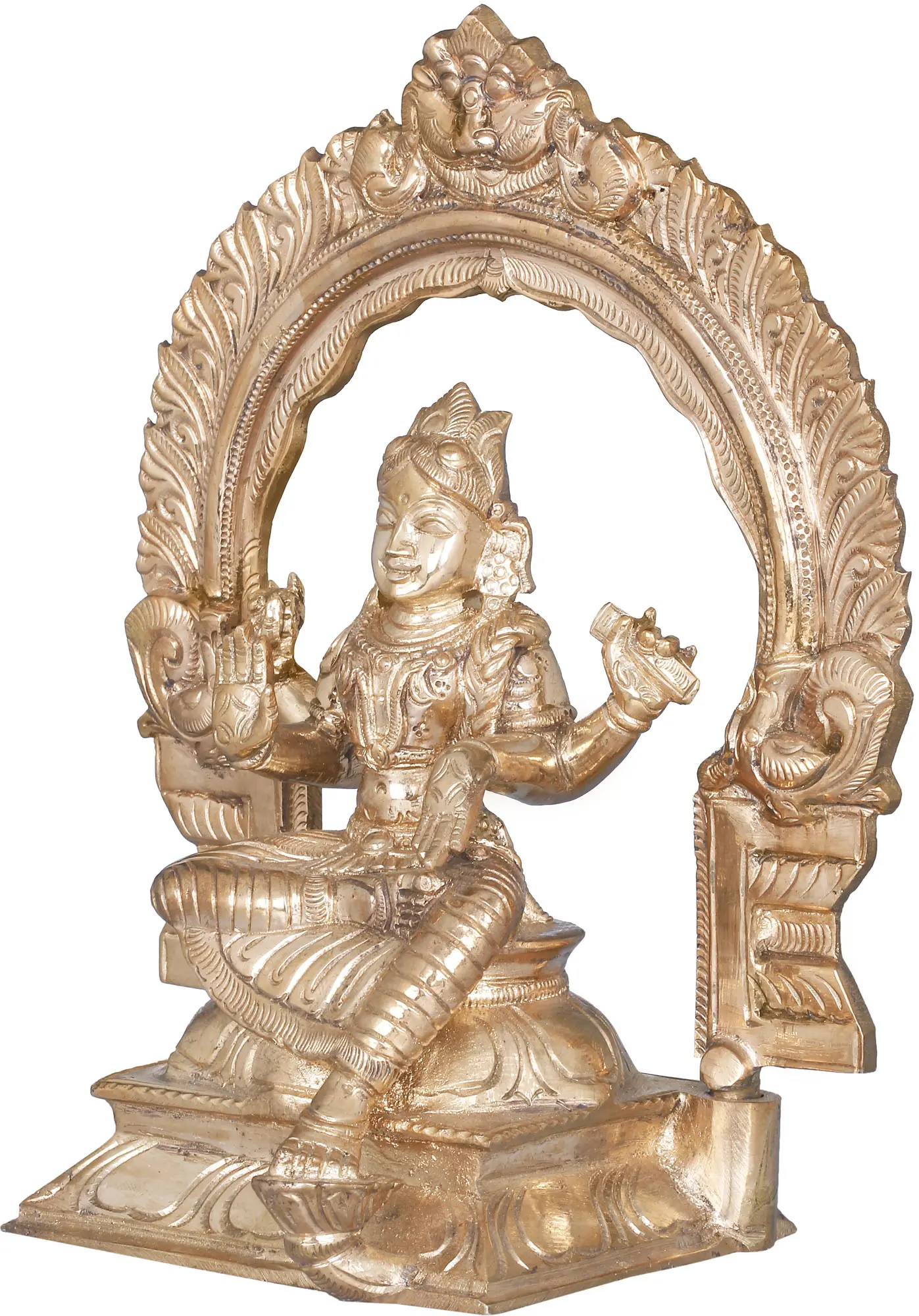 Goddess Bala Tripuri is closely associated with the great cosmic mother, Tripura Sundari, and is considered her manifestation in a youthful form. She is often invoked for knowledge, education, courage, and material well-being. Tales abound of her divine interventions, aiding devotees in overcoming challenges and achieving their aspirations. Her worship is believed to bring about inner peace, intellectual clarity, and protection from negativity. The archway framing the Goddess is reminiscent of the entrance to sacred temples, signifying passage into a sacred space of devotion and divine connection. The vibrant tradition of creating such Panchaloha idols has been passed down through generations, ensuring that the spiritual essence of these deities is preserved and honored. This statue serves not merely as an artistic object, but as a focal point for meditation, prayer, and a constant reminder of the benevolent divine presence in our lives.