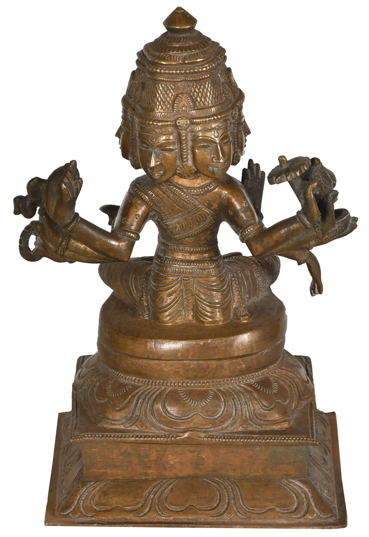 This exquisite bronze statue captures the essence of the revered Goddess Gayatri, a figure of immense spiritual significance in Hinduism. The craftsmanship, originating from Swamimalai, a renowned center for traditional South Indian bronze casting, is evident in every intricate detail. The patina of the bronze speaks of age and devotion, lending the deity a profound sense of presence and antiquity. The goddess is depicted with her iconic five heads, each representing a unique facet of her divine consciousness and her role as the personification of the Gayatri Mantra, one of the most powerful and sacred verses in the Vedas. These five heads are said to encompass the past, present, and future, as well as the physical and spiritual realms. This multi-headed aspect symbolizes her omnipresence and her ability to perceive all aspects of existence simultaneously. Her serene and compassionate gaze emanates from each visage, inviting contemplation and bestowing blessings.