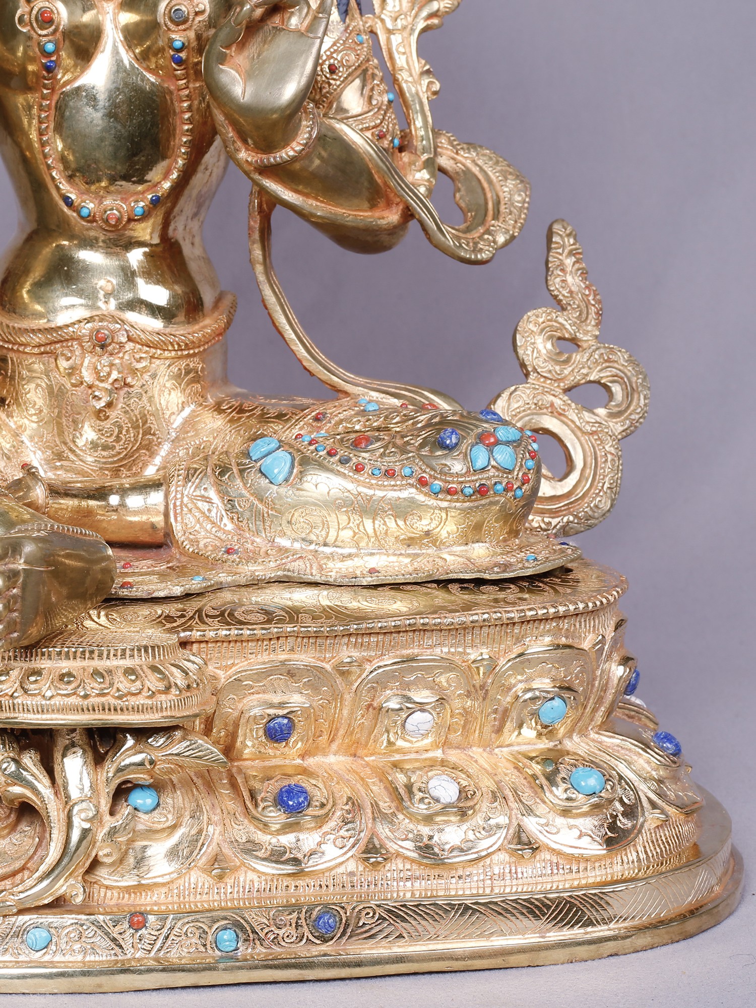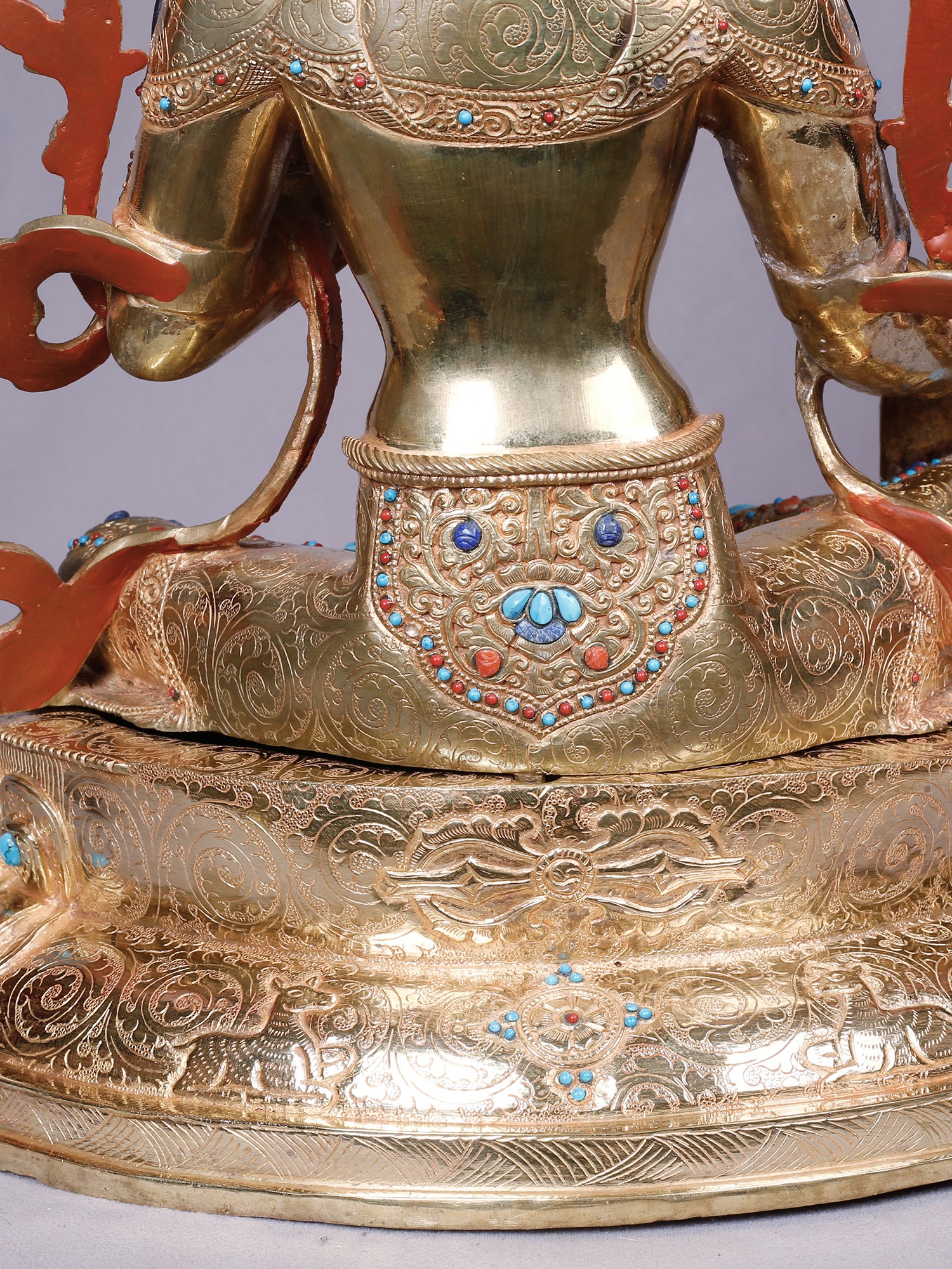Observe the serene countenance, the gentle smile, and the balanced posture that speaks of inner peace and unwavering strength. Richly ornamented with intricate jewelry, including necklaces, armbands, and a majestic crown, the deity is further embellished with carefully inlaid turquoise and coral stones. These vibrant accents capture and reflect light beautifully, enhancing the visual depth and opulence of the figure, making its impressive 18-inch height a commanding presence.