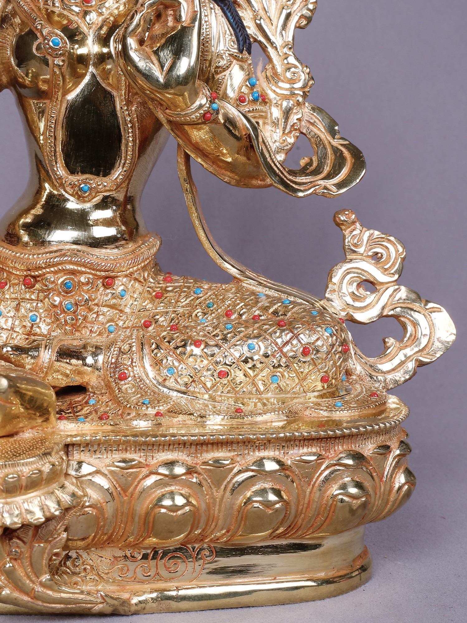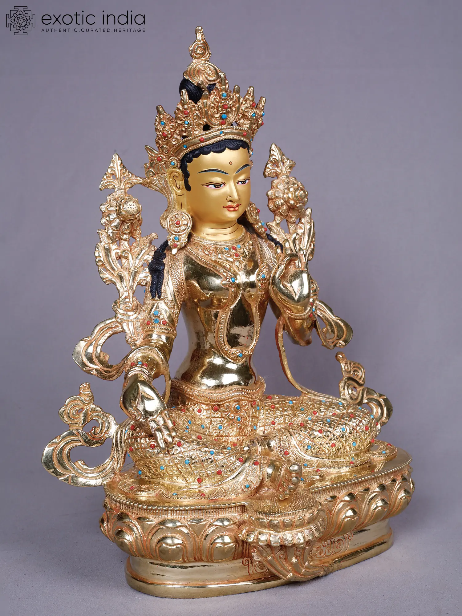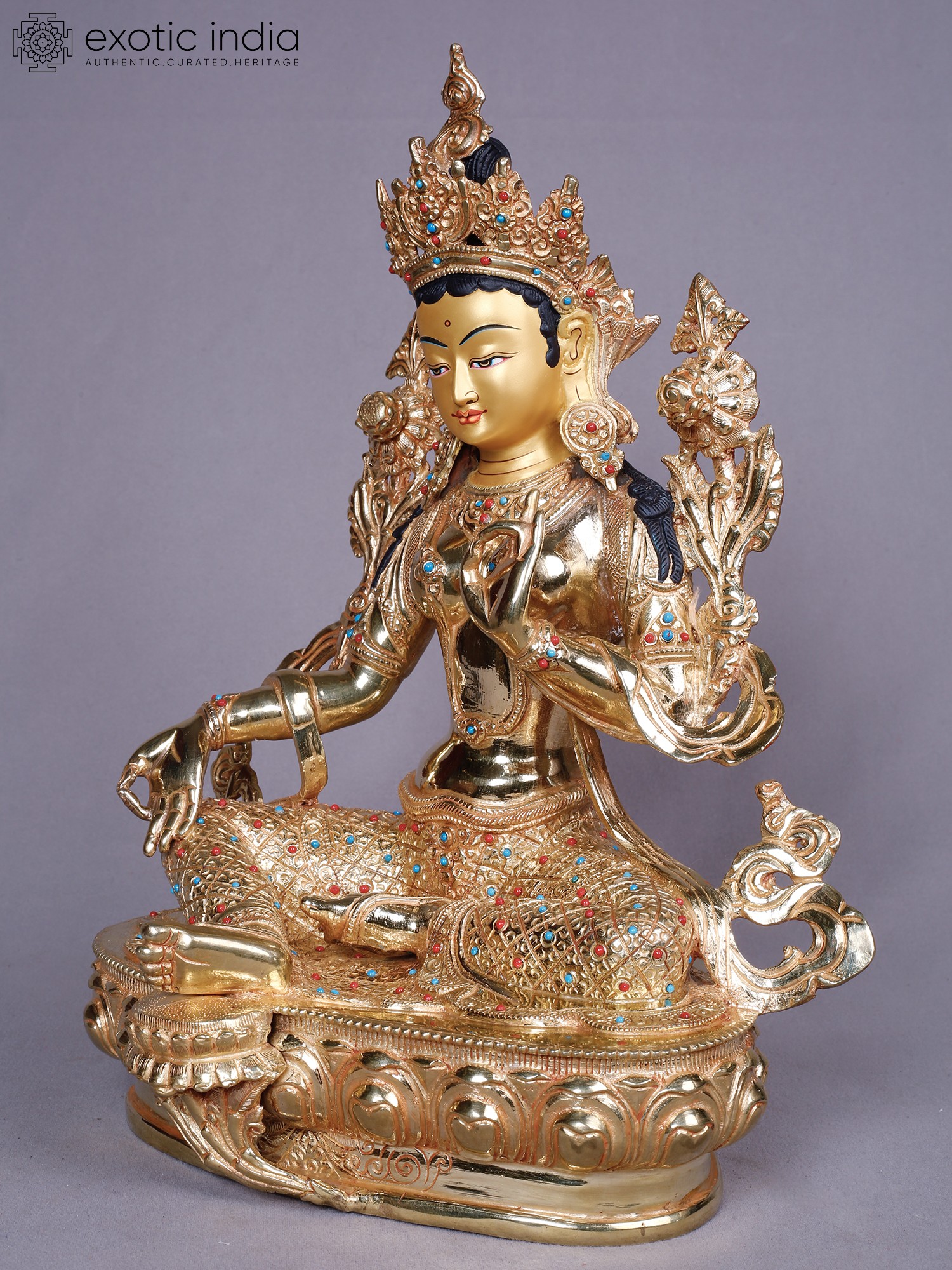 Crafted from robust copper, this piece is then lavishly plated with pure gold, creating a luminous surface that captures and reflects light with remarkable brilliance. Artisans have meticulously sculpted each detail, imbuing the form with a palpable sense of life and devotion. The intricate ornamentation, studded with vibrant turquoise and coral-hued accents, showcases a dedication to traditional craftsmanship, ensuring a piece of heirloom quality.
