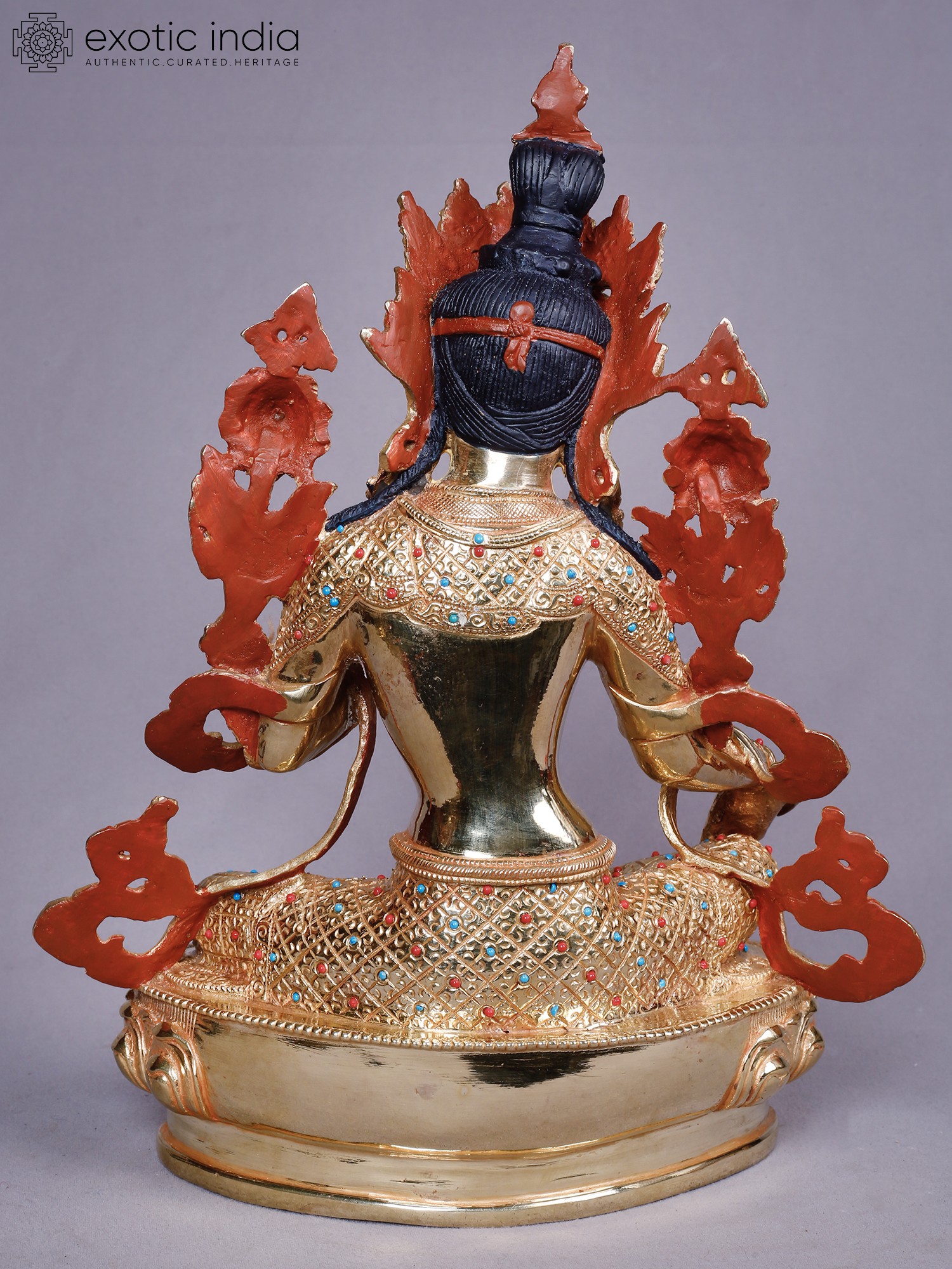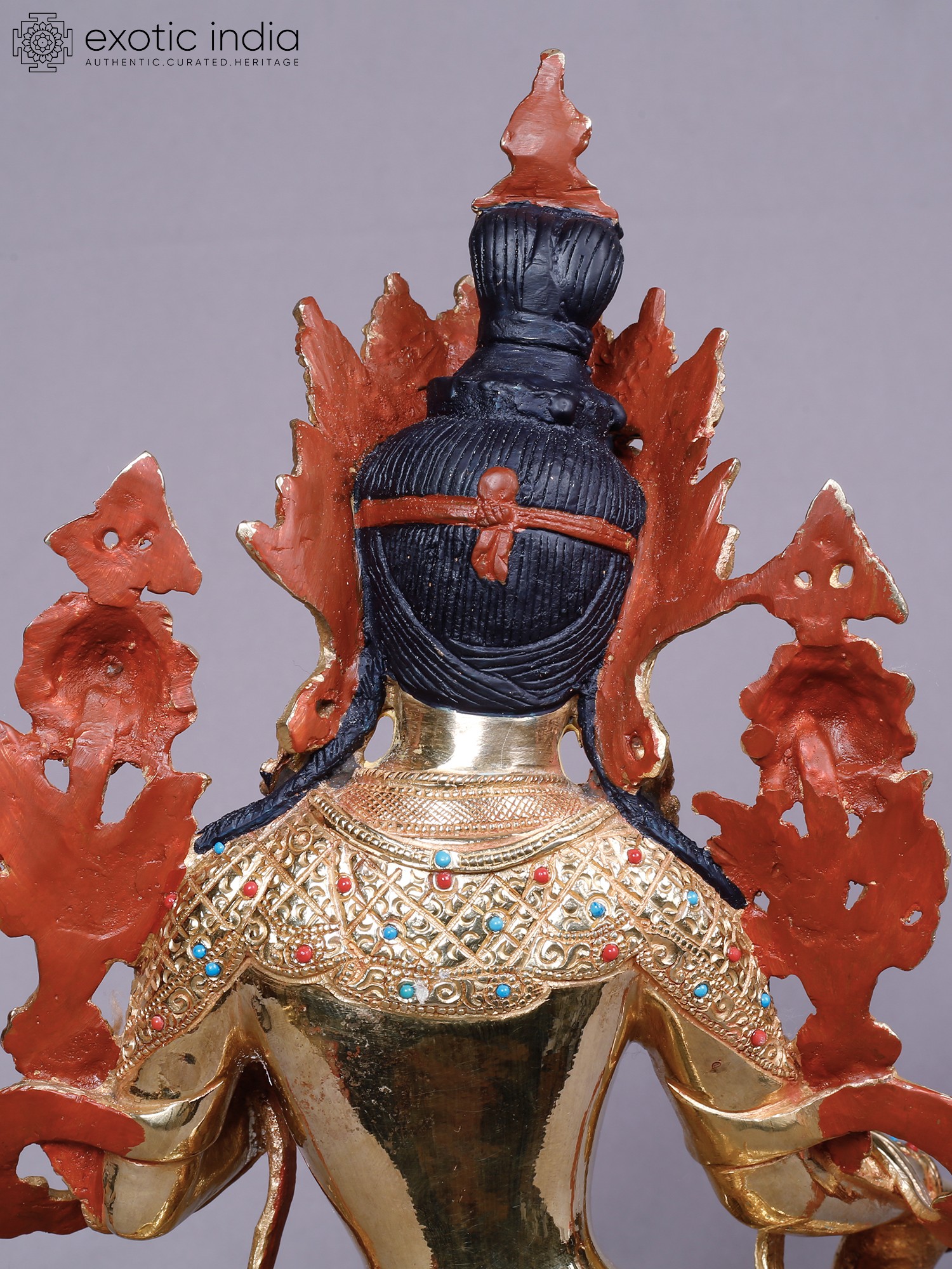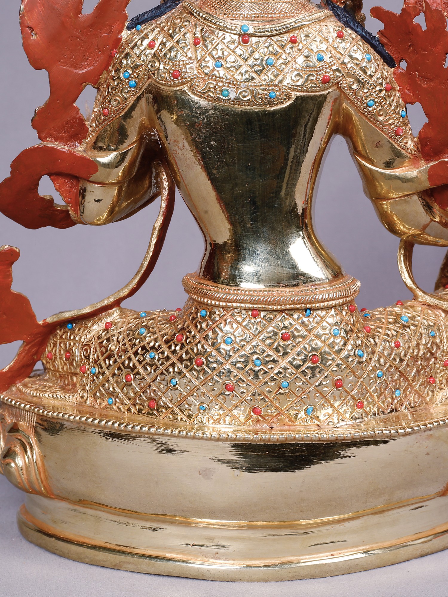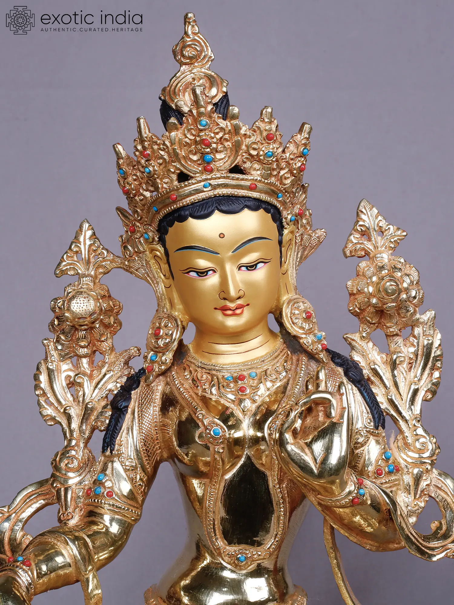 Crafted from robust copper, this piece is then lavishly plated with pure gold, creating a luminous surface that captures and reflects light with remarkable brilliance. Artisans have meticulously sculpted each detail, imbuing the form with a palpable sense of life and devotion. The intricate ornamentation, studded with vibrant turquoise and coral-hued accents, showcases a dedication to traditional craftsmanship, ensuring a piece of heirloom quality.