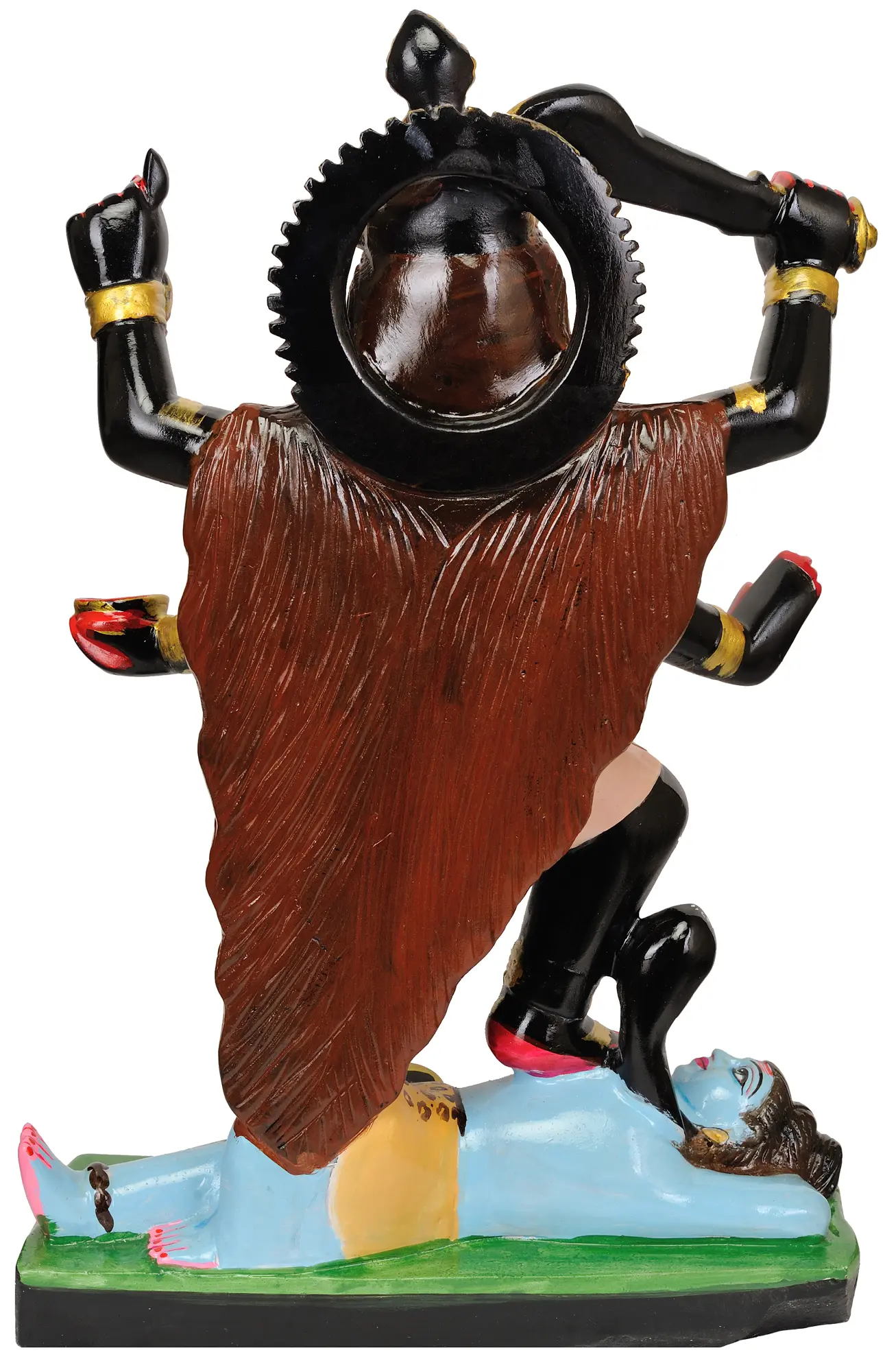 Each element of this sculpture is laden with meaning. The multiple arms of Kali signify her omnipresence and her ability to act in all dimensions simultaneously. In one hand, she wields a formidable sword, representing the sharpness of her wisdom and her power to sever the illusions that bind us. In another, she holds a severed head, symbolizing her victory over demonic forces and the ego. The remaining hands are in gesture of blessing and protection, offering solace and strength to her devotees. The image of Lord Shiva lying beneath Kali's foot is a profound representation of her supreme authority. Shiva, the destroyer and transformer, is often depicted in a state of ecstatic stillness when under Kali's divine presence. This posture signifies that even the most potent forces of the cosmos are under the command of the ultimate feminine power, who brings about transformation and renewal. The coiled serpent around her foot further enhances this imagery, symbolizing the Kundalini energy, the primordial divine force dormant within all beings.