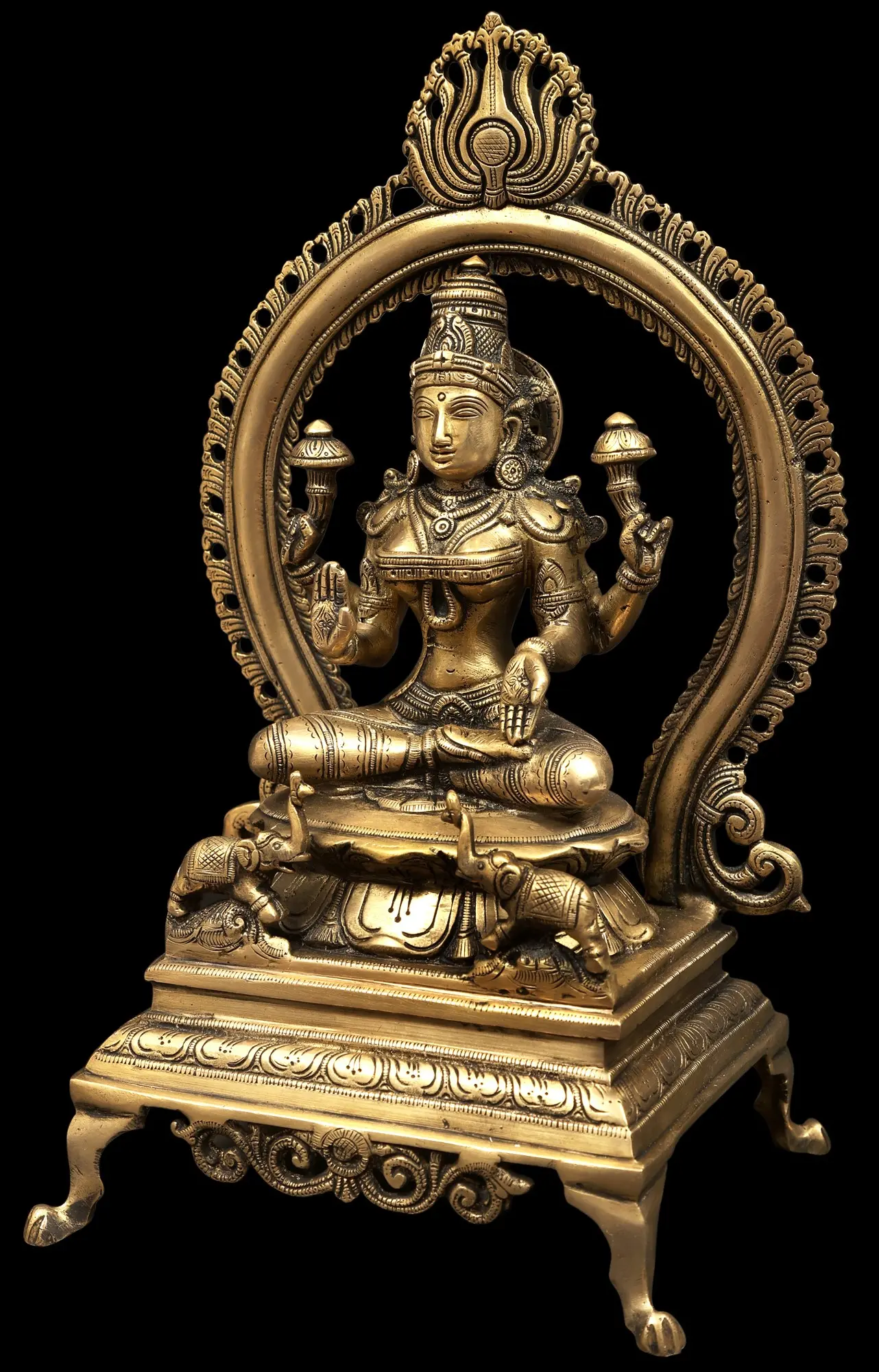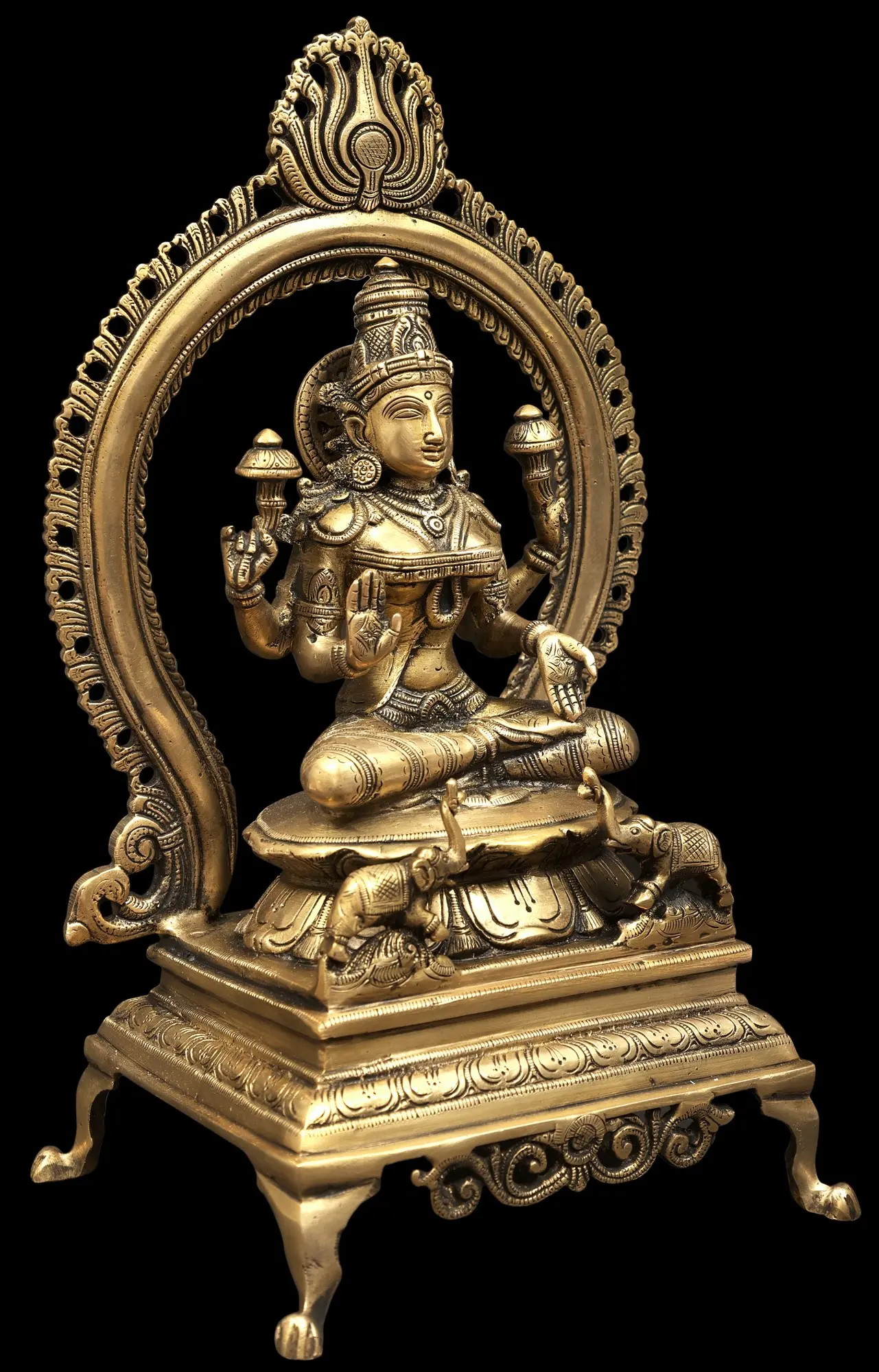 The throne upon which Goddess Kamala is seated is itself a symbol of her supreme authority and divine grace. The intricate carvings and the presence of elephants at the base are particularly noteworthy. Elephants, in Hindu mythology, represent strength, royalty, wisdom, and auspicious beginnings. They are often associated with Indra, the king of the gods, and are believed to bring good fortune and ward off negativity. The *prabhavali* framing the goddess signifies her cosmic energy and the celestial sphere she inhabits, creating a powerful and protective aura around her divine form. The detailed craftsmanship of the entire piece, from the elaborate headdress to the delicate adornments, speaks to the skill of the artisans and their deep understanding of religious iconography.