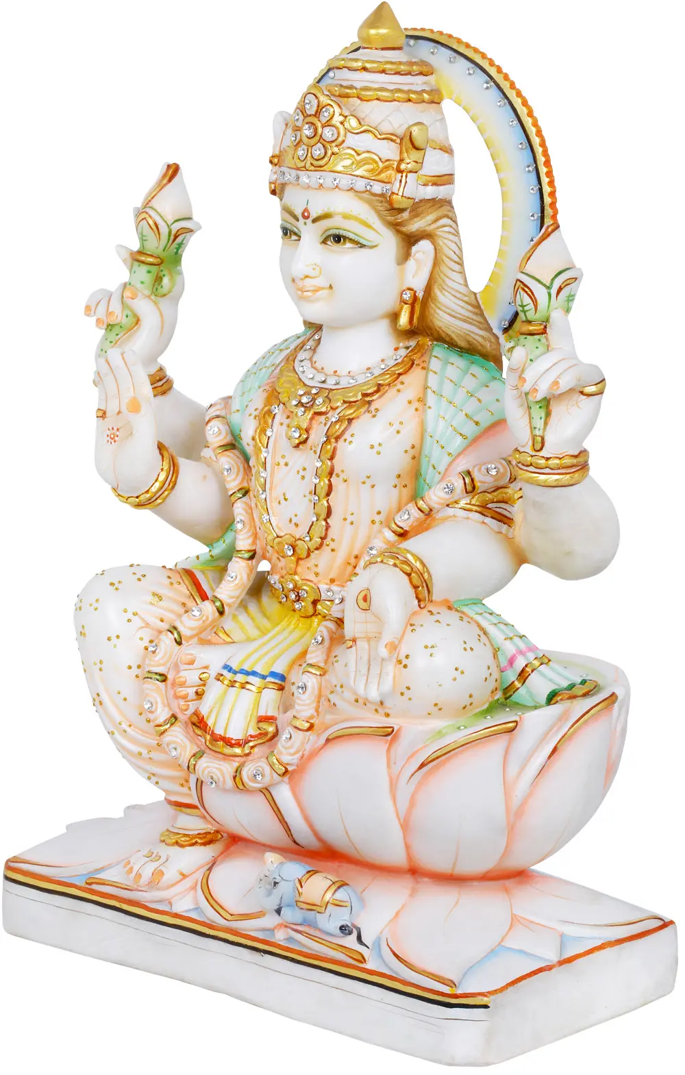 Carved from pure white marble, the statue possesses a timeless elegance and a smooth, cool touch. The subtle hand-painted details and the strategically placed embellishments bring the divine form to life, making it a captivating centerpiece for any altar, meditation space, or decorative setting. The quality of the marble ensures durability and a classic aesthetic that will be cherished for generations. This representation of Goddess Lakshmi is more than just an object of art; it is an invitation to invite her blessings of wealth, happiness, and prosperity into your life.