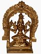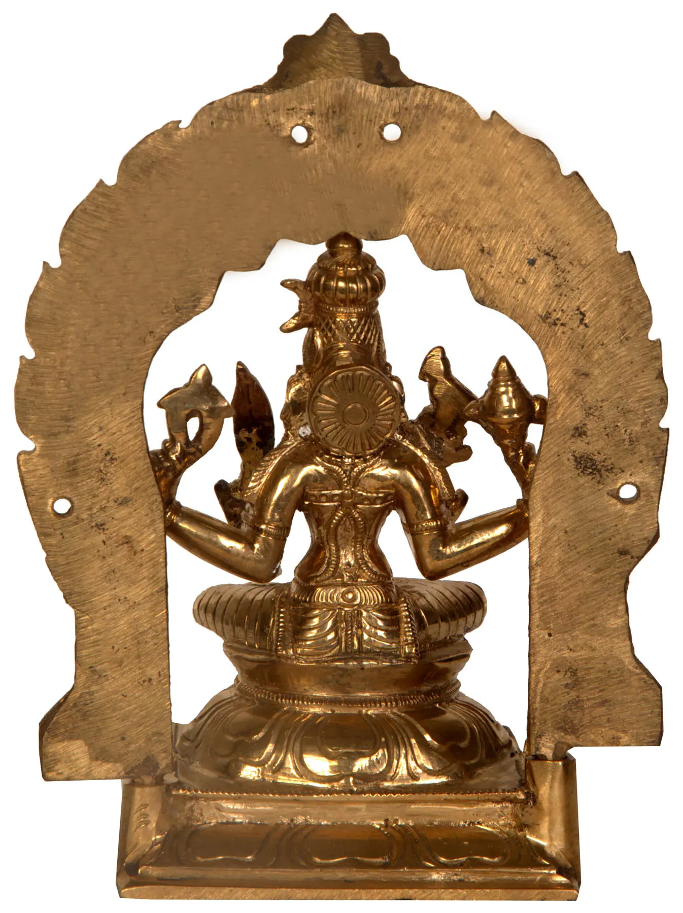 This stunning bronze statue portrays Meenakshi Amman in her seated posture, radiating peace and authority. She is adorned with elaborate jewelry, including necklaces and armbands, indicative of her royal status. Her serene countenance, with eyes that seem to hold ancient wisdom, draws devotees into her benevolent gaze. In her hands, she holds symbolic objects. The parrot perched on her hand is often associated with love and communication, while the other divine emblems represent her multifaceted powers and blessings. The ornate architectural arch behind her, reminiscent of temple gopurams, signifies her divine dwelling and her supreme position in the cosmos. This iconography invites contemplation and a deeper understanding of her role as a protector, a dispenser of justice, and a source of immense compassion.