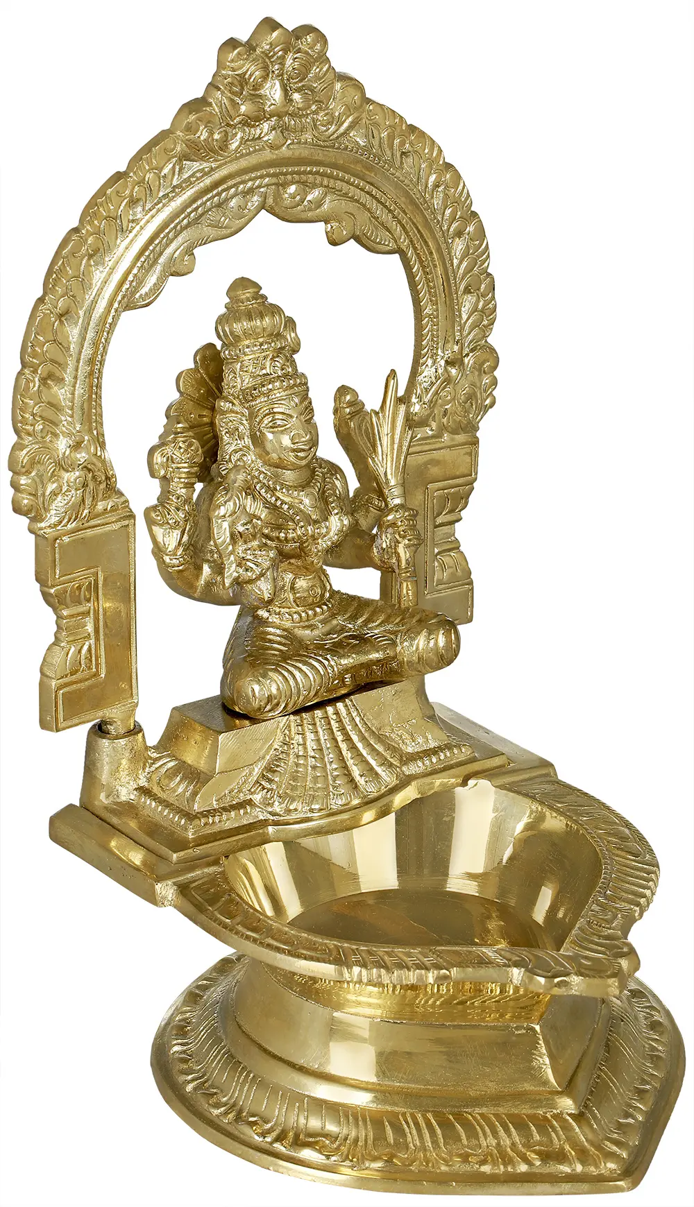 Goddess Rajarajeshwari is a significant deity in Hinduism, revered as the embodiment of ultimate feminine power and cosmic order. She is often identified with Maha Tripura Sundari, the most beautiful of the three worlds, and is considered the grantor of all desires and the remover of obstacles. In various Puranic narratives, she is depicted as the cosmic dancer, the creator, preserver, and destroyer, the very essence of the universe. The diya, as a traditional Indian lamp, holds immense cultural and spiritual significance. It is lit during festivals, ceremonies, and daily prayers to invoke blessings, ward off negative energies, and celebrate light over darkness. The act of lighting a diya is believed to purify the environment and the mind, fostering a sense of tranquility and spiritual connection. This particular brass rendition captures the divine essence with remarkable grace and artistry, making it a cherished object of worship and an heirloom-quality piece.