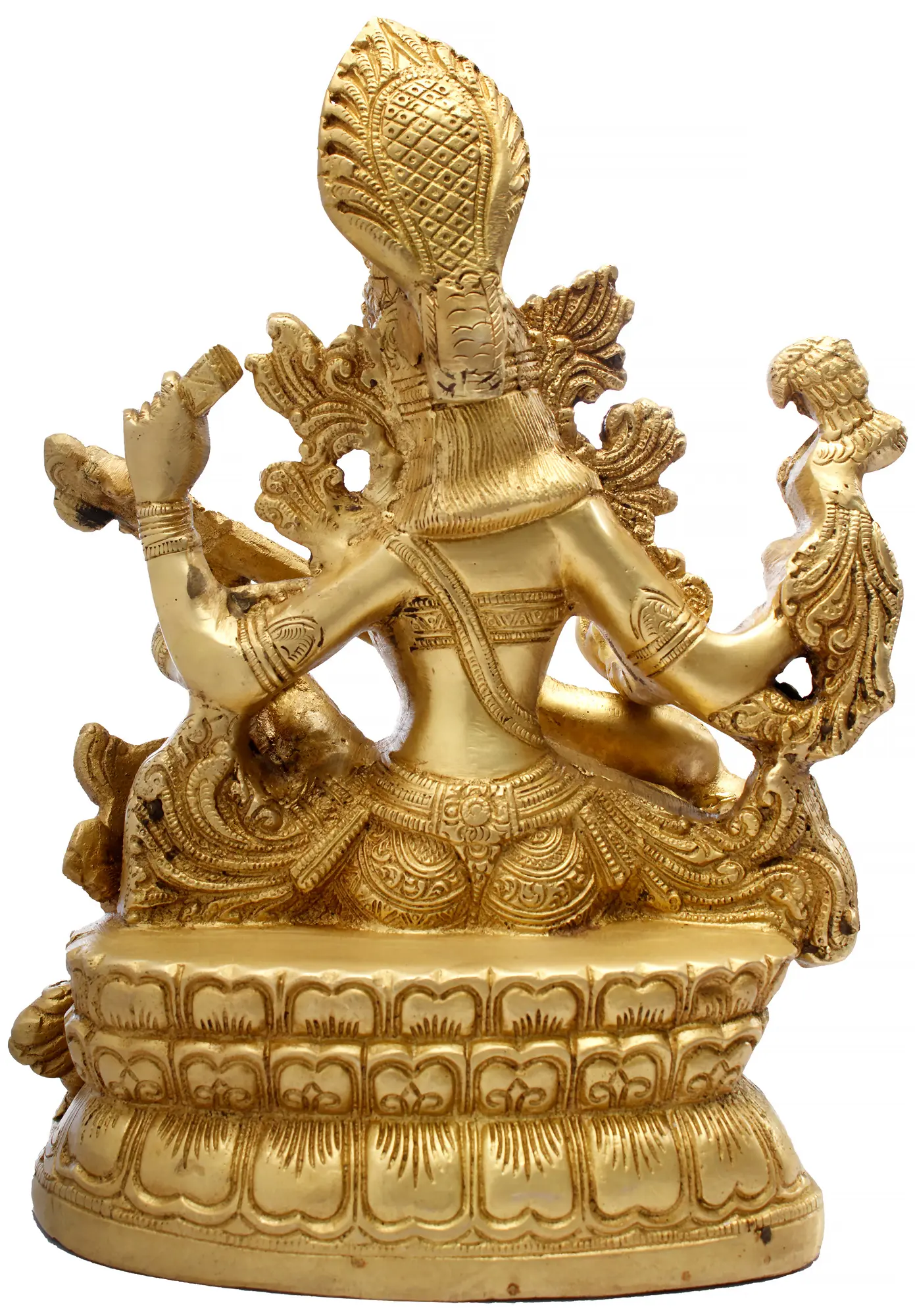 Invite the divine blessings of Goddess Saraswati, the patron of knowledge and wisdom, into your home with this handcrafted brass sculpture. Saraswati is depicted here as Sharada, radiating a serene aura that inspires learning and creativity. This art piece, crafted with precision by Indian artisans, symbolises the importance of education and the pursuit of knowledge. Place it in your study or learning space to invoke Saraswati's guidance, fostering a harmonious environment for learning and intellectual growth.