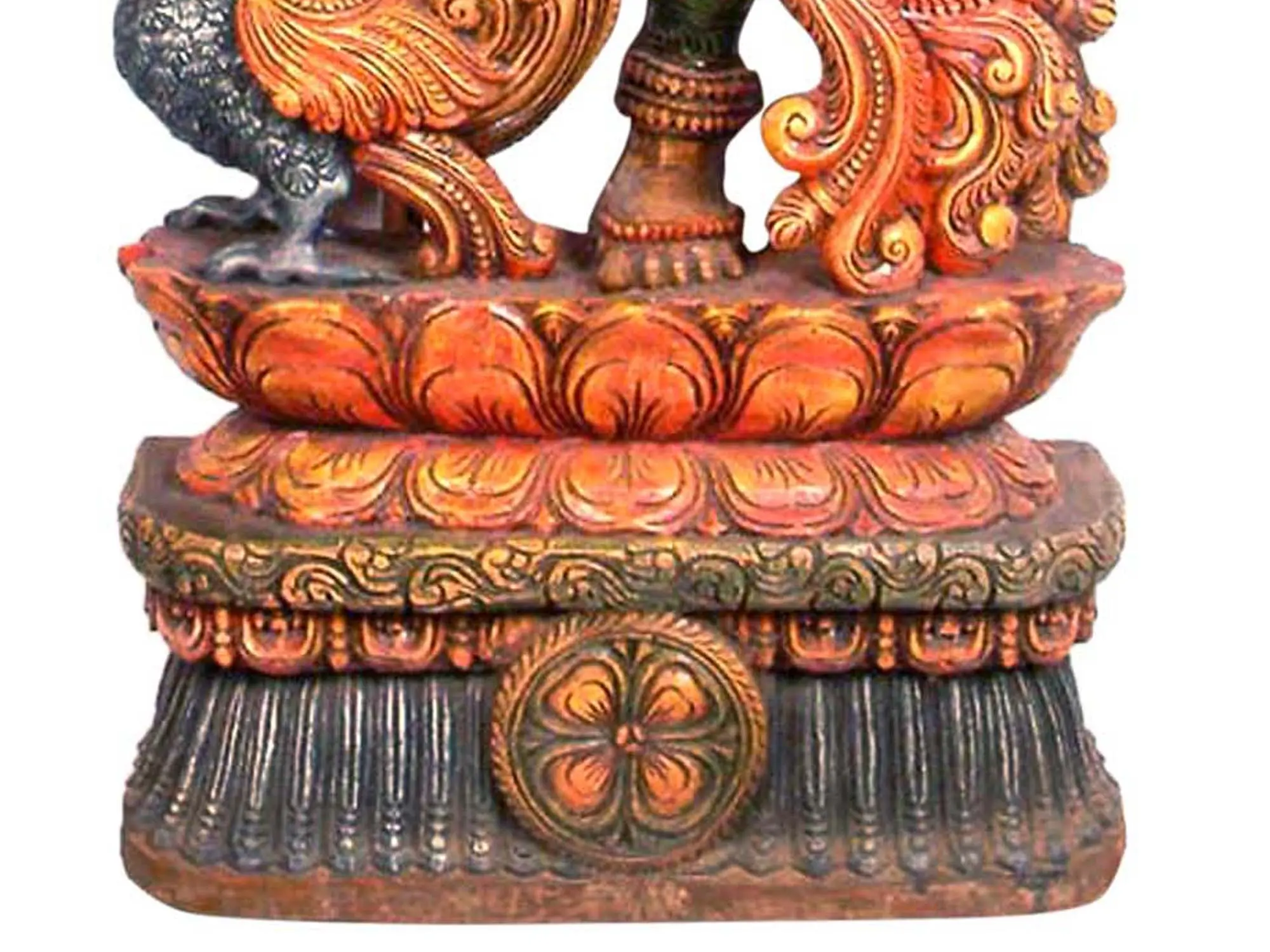 Behold a magnificent representation of the divine feminine – a handcrafted wood carving hailing from the venerable tradition of South Indian temple art. This awe-inspiring piece captures the essence of a revered deity, bringing her blessings of knowledge, creativity, and harmony into your home. The intricate details and vibrant colors of this sculpture are a testament to the skill and devotion of the artisans who have poured their hearts into its creation. Standing at an impressive 5.0 x 2.2 x 0.7 feet, this statue commands attention and becomes a focal point of any space.