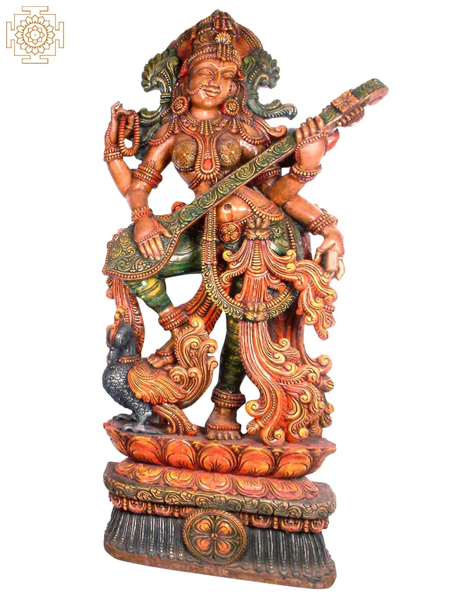 Goddess Saraswati - South Indian Temple Wood Carving Statue