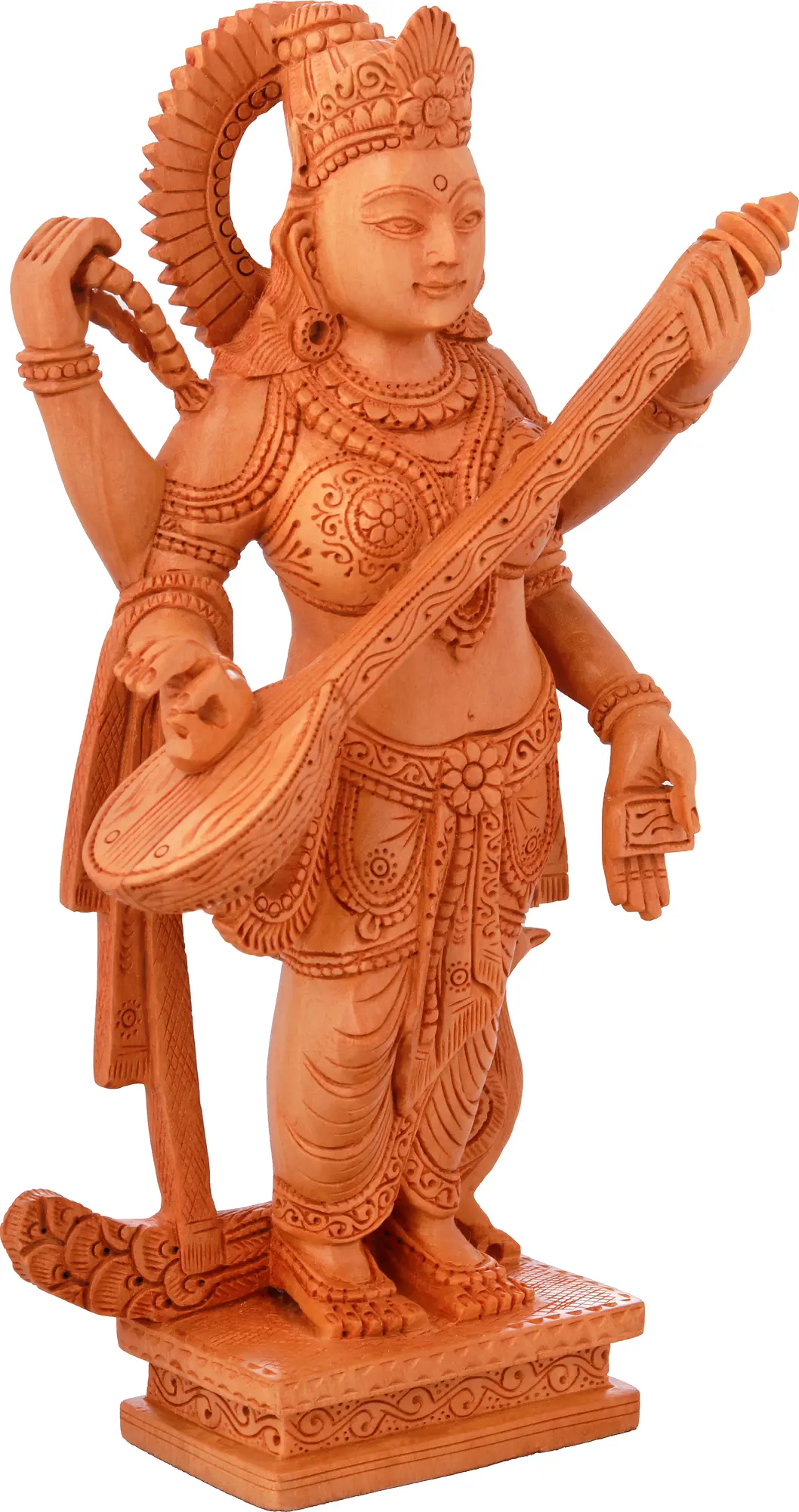 This exquisite wood carving captures the divine essence of Goddess Saraswati, the Hindu deity of knowledge, music, arts, speech, and wisdom. Each intricately carved detail reflects a deep reverence for this revered goddess, making it a captivating centerpiece for any sacred space or a treasured decorative item. The warm, natural tone of the wood lends an earthy yet celestial feel to the sculpture, inviting contemplation and inspiration. The artistry of this piece is evident in every curve and contour. Goddess Saraswati is depicted with her characteristic four arms, each holding symbolic objects that represent her manifold blessings. In her hands, she gracefully cradles a veena, the ancient Indian stringed instrument, from which the very melodies of creation are believed to emanate. Her posture is serene and poised, embodying the tranquility that accompanies profound knowledge. The delicate carvings on her attire, jewelry, and headdress showcase the meticulous craftsmanship of the artisan, bringing to life the divine beauty of the goddess. ––––––––––