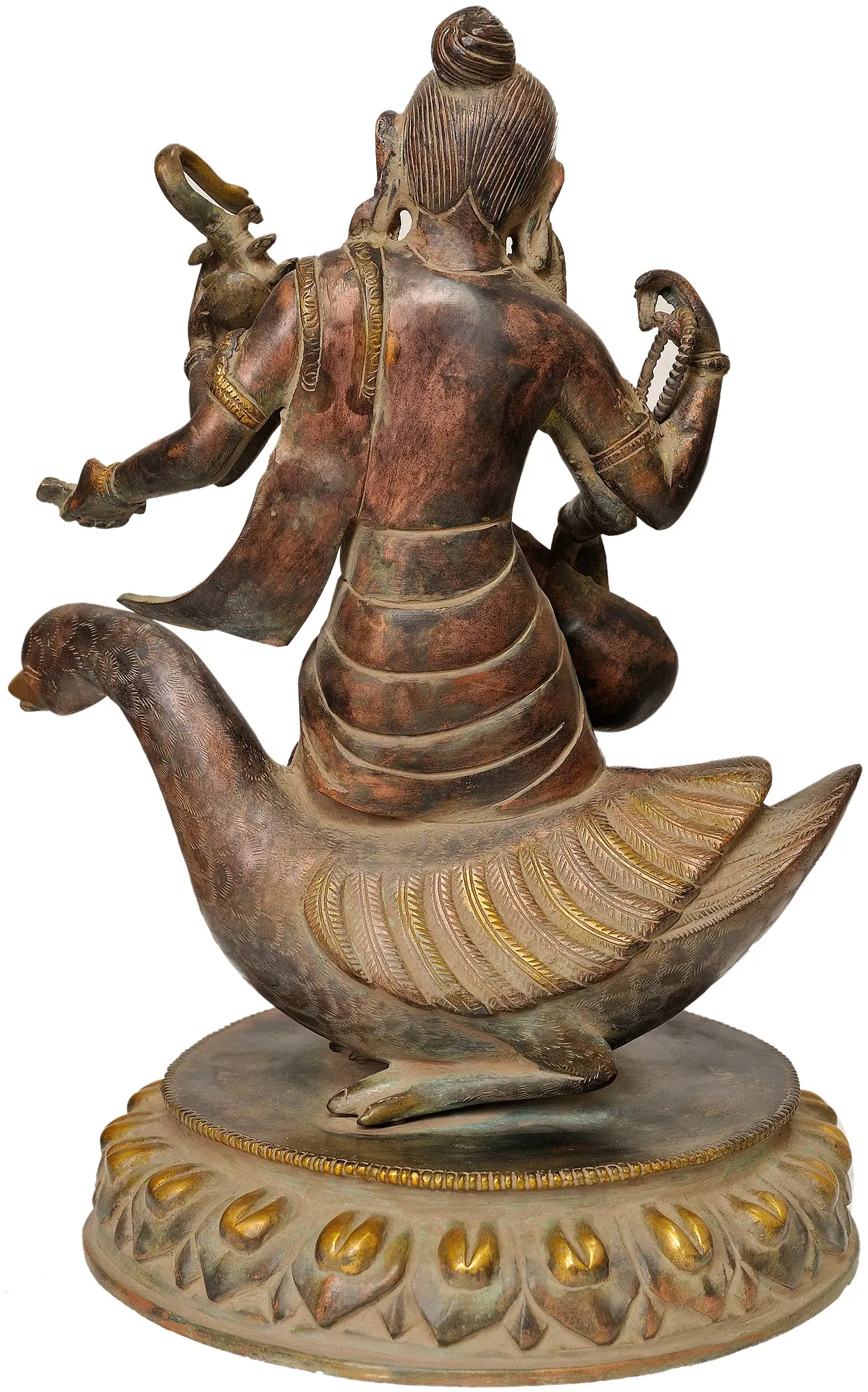 The multiple arms of Saraswati represent her omnipresence and ability to engage with various aspects of knowledge and creation simultaneously. The veena, held delicately, signifies the importance of sound, melody, and the creative arts in the pursuit of knowledge. One hand often holds a mala (rosary), symbolizing the spiritual aspect of learning and the cyclical nature of existence, while another may hold a book or palm leaf manuscript, representing the vast repository of wisdom and scriptures. Her mount, the swan or peacock, is also deeply symbolic. The swan, known for its ability to distinguish milk from water, represents discernment and purity of knowledge, while the peacock symbolizes beauty, grace, and the blossoming of artistic talent. This statue, with the goddess seated gracefully upon her avian vahana, is a potent reminder of the divine connection between knowledge, art, and spiritual understanding.