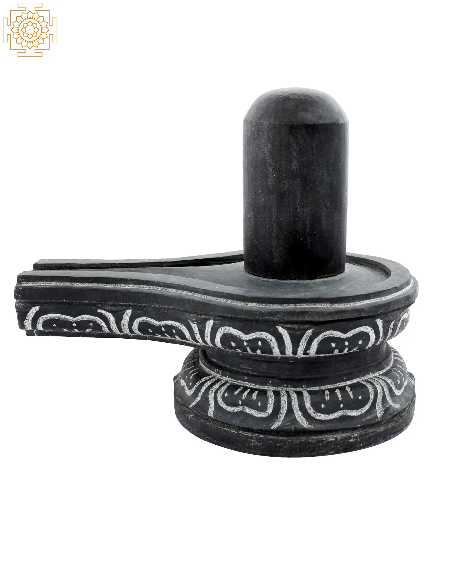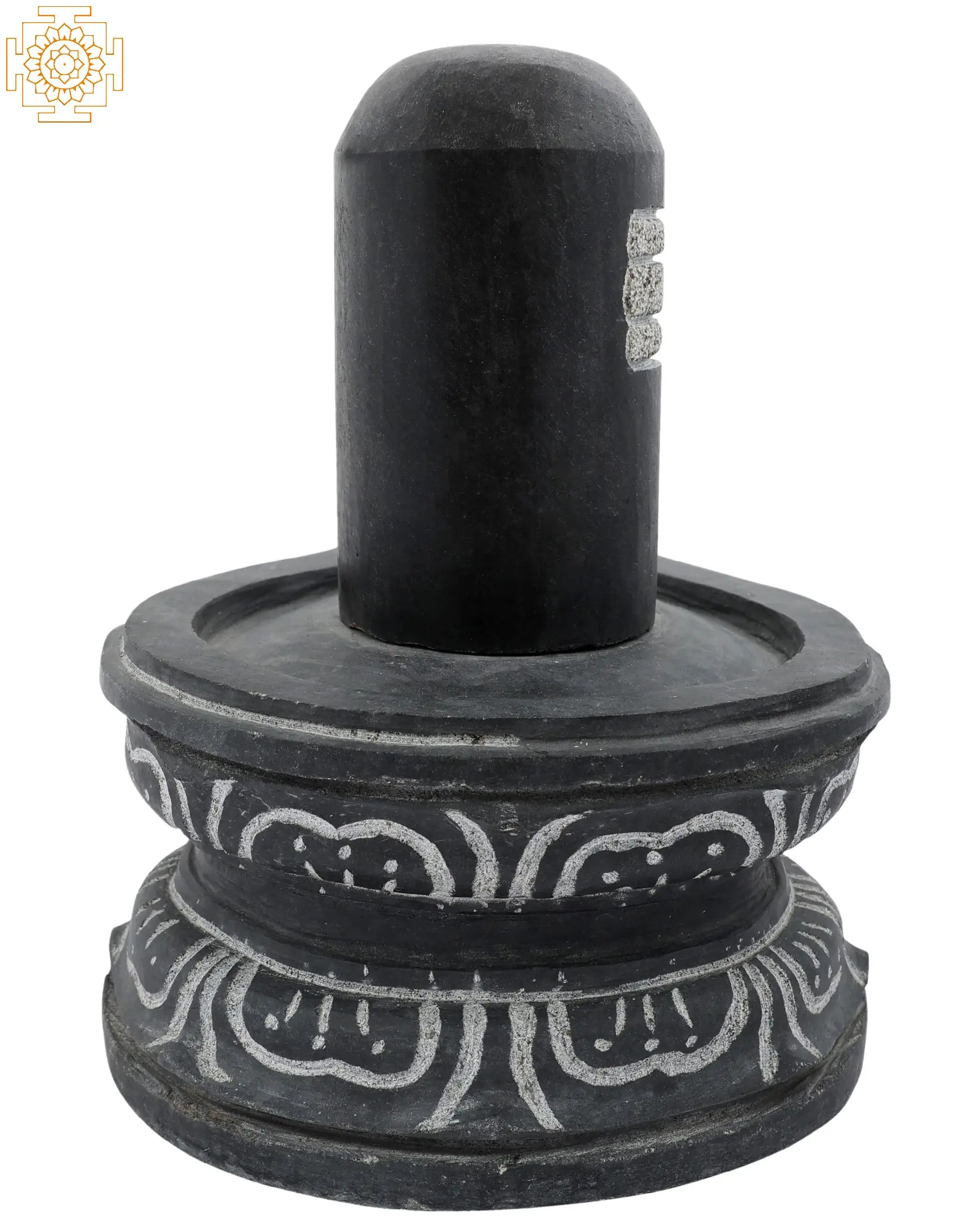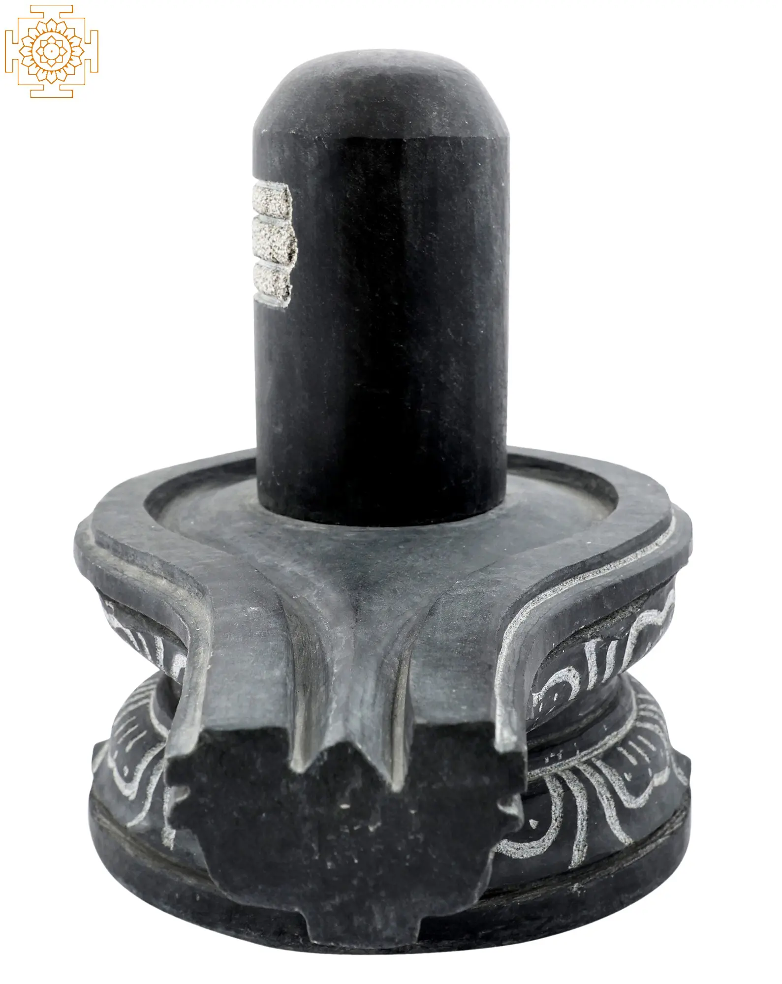 This particular sculpture features the traditional markings that signify the divine presence of Shiva. The horizontal bands, known as the *tripundra*, are etched onto the cylindrical form, representing the three primary forces of creation, preservation, and destruction, as well as the three gunas (Sattva, Rajas, Tamas). The central dot, the *bindu*, within the markings symbolizes the singular, ultimate reality – the consciousness that underlies all existence. The serene and minimalist aesthetic allows for deep meditative focus, drawing the worshipper into a state of spiritual connection. The circular base, the *yoni*, symbolizes the feminine creative energy, the cosmic womb from which all life emerges, highlighting the inseparable duality of Shiva and Shakti, masculine and feminine principles that drive the universe. The delicate engravings on the base further enhance its aesthetic appeal, adding an intricate layer to this sacred object.
