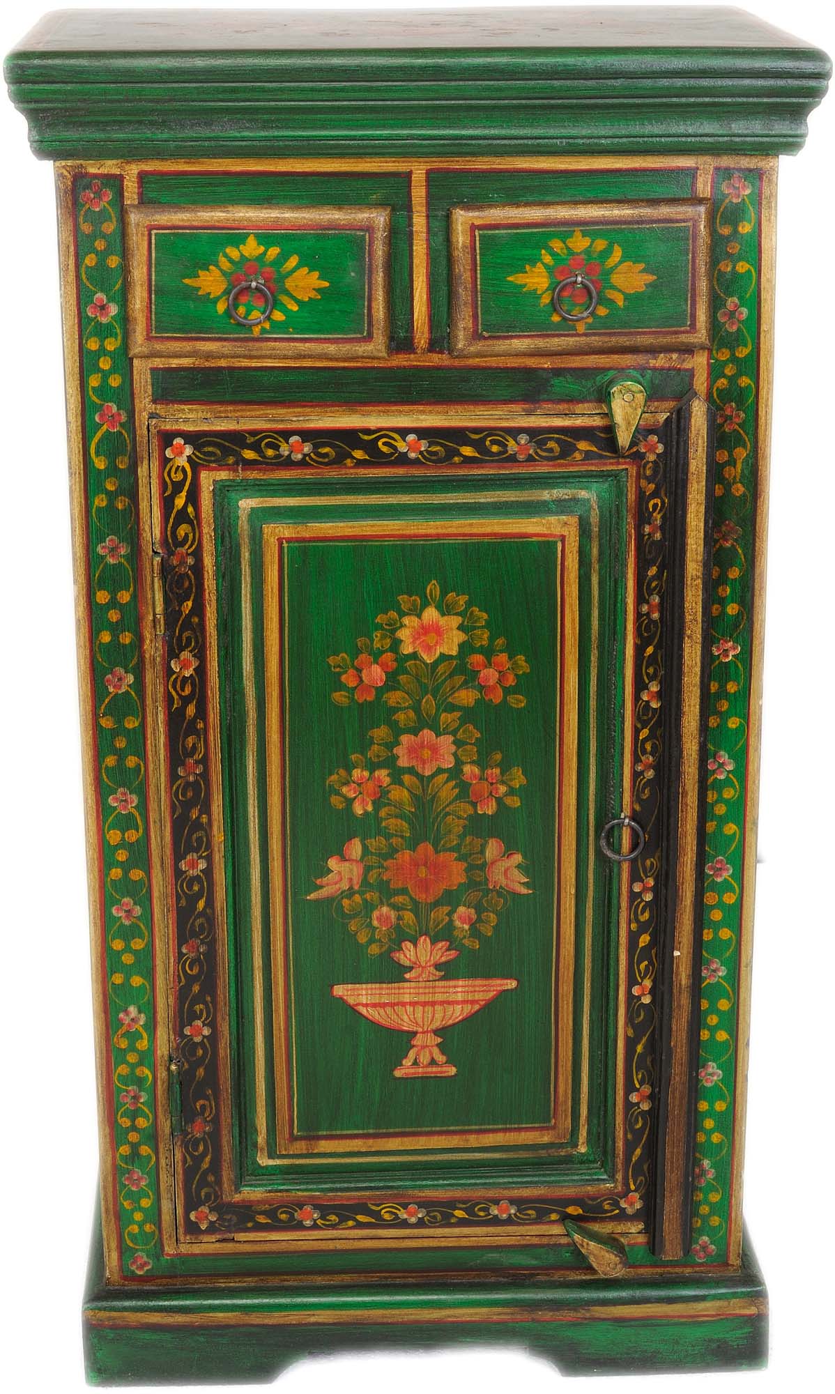 This exquisite wooden cupboard is a breathtaking testament to artisanal skill and vibrant artistry, bringing a touch of the exotic and the enduring beauty of nature into your home. Its deep, lush green finish evokes the verdant abundance of a hidden garden, a place where ancient tales whisper and mythological creatures might find refuge. The carefully hand-painted floral motifs are more than mere decoration; they are a language of symbolism, speaking of growth, prosperity, and the cyclical renewal of life. In many cultures, the color green is deeply connected to fertility, healing, and the earth's bounty. It is the color of lush forests, where deities like Pan in Greek mythology roamed, and the color of spring, symbolizing rebirth and new beginnings. The intricate floral patterns, rendered in warm hues of orange, yellow, and red, further amplify this sense of life and vitality. These blossoms, reminiscent of those found in traditional Indian miniature paintings or Persian carpets, carry within them echoes of ancient gardens and stories of love and beauty.