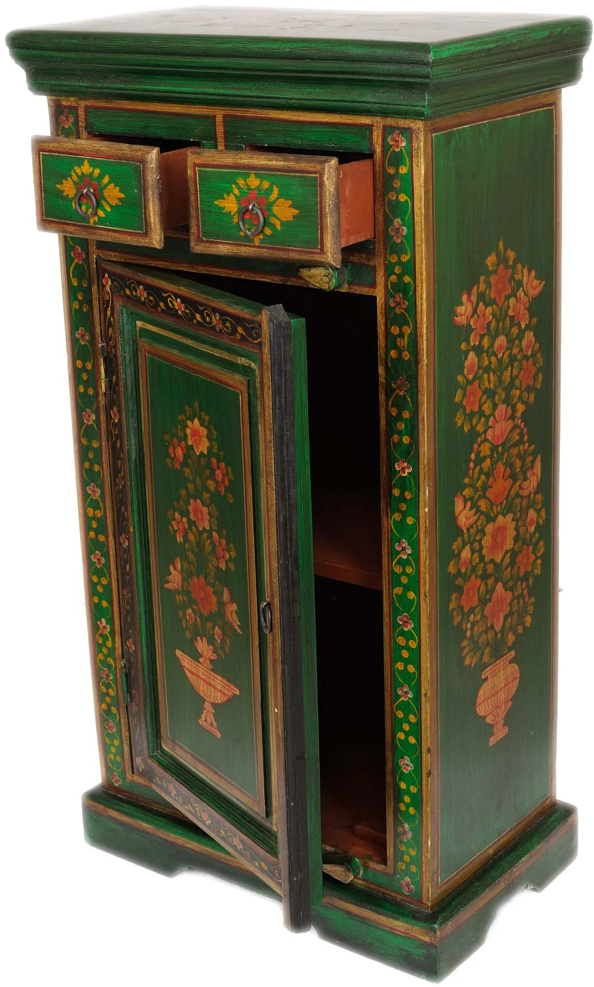 The cupboard is crowned with a distinguished, layered top, adding a regal air to its design. The two small drawers, each adorned with a charming floral motif and a rustic ring pull, offer convenient storage for smaller treasures. The single door, artfully decorated and secured with a brass latch, hints at the secrets or cherished items held within. This piece transcends the ordinary, offering not just a place to store your belongings, but a portal to a world of artistry and enchantment. It is a statement piece that speaks of discerning taste and an appreciation for handcrafted beauty, a treasure to be enjoyed for generations.