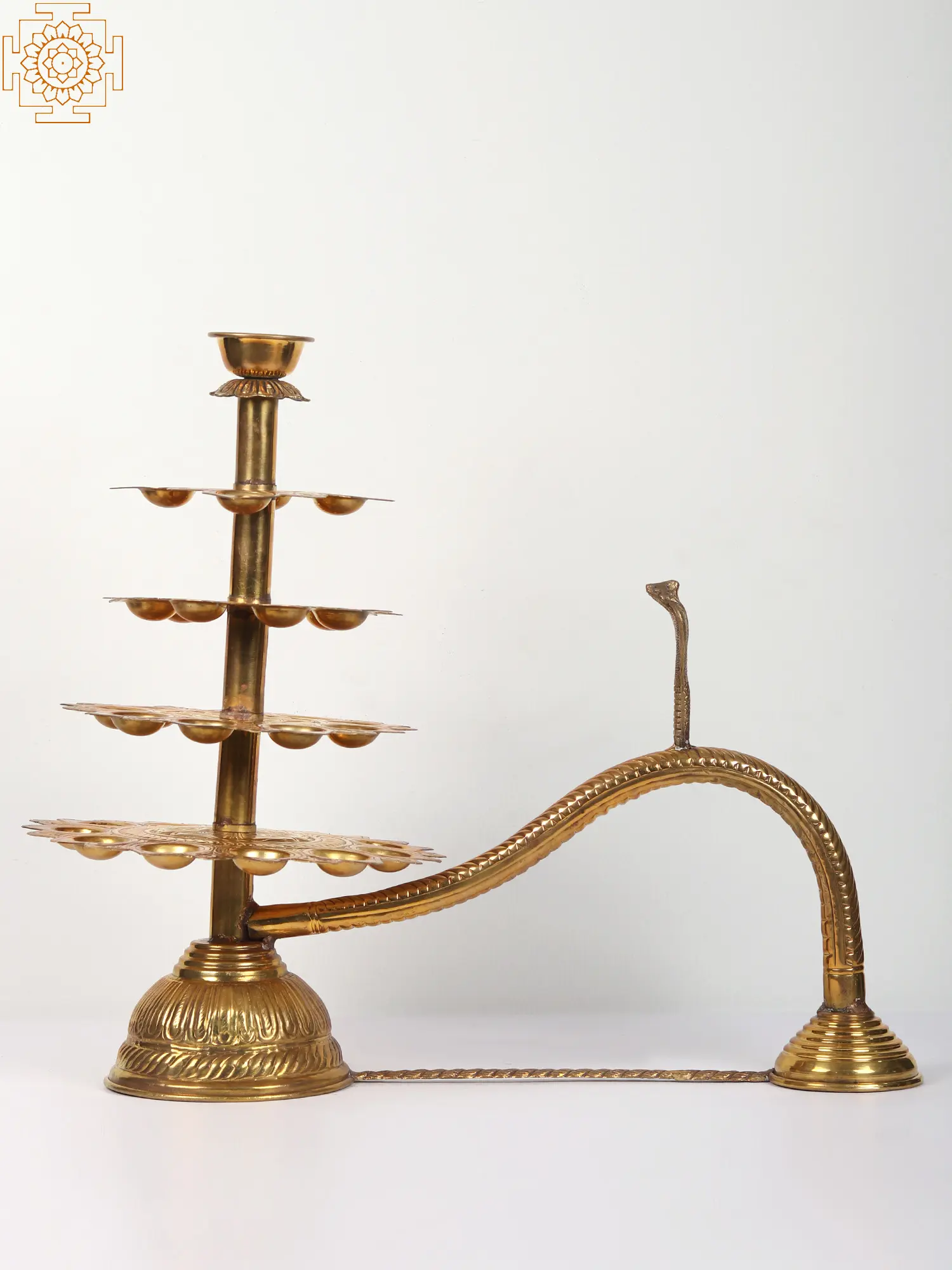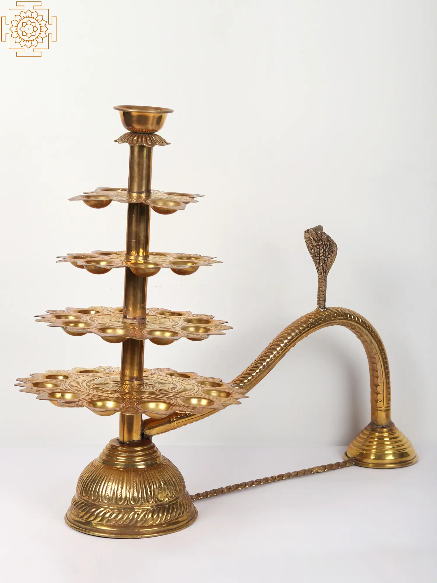The lamp's tiered structure, adorned with delicate floral motifs, represents the unfolding petals of a lotus, a sacred flower associated with purity, enlightenment, and the divine feminine energy of Goddess Lakshmi. Each tier holds multiple small bowls, designed to hold oil and wicks, allowing for a sustained and mesmerizing flame. The graceful, arched arm culminating in a coiled cobra figure adds a potent layer of symbolism. The Naga, or serpent, in Hinduism is a revered entity, often depicted as a protector, associated with Kundalini energy, and symbolizing fertility, power, and immortality. The cobra's watchful presence over the lamps imbues the piece with an aura of auspiciousness and divine guardianship.
