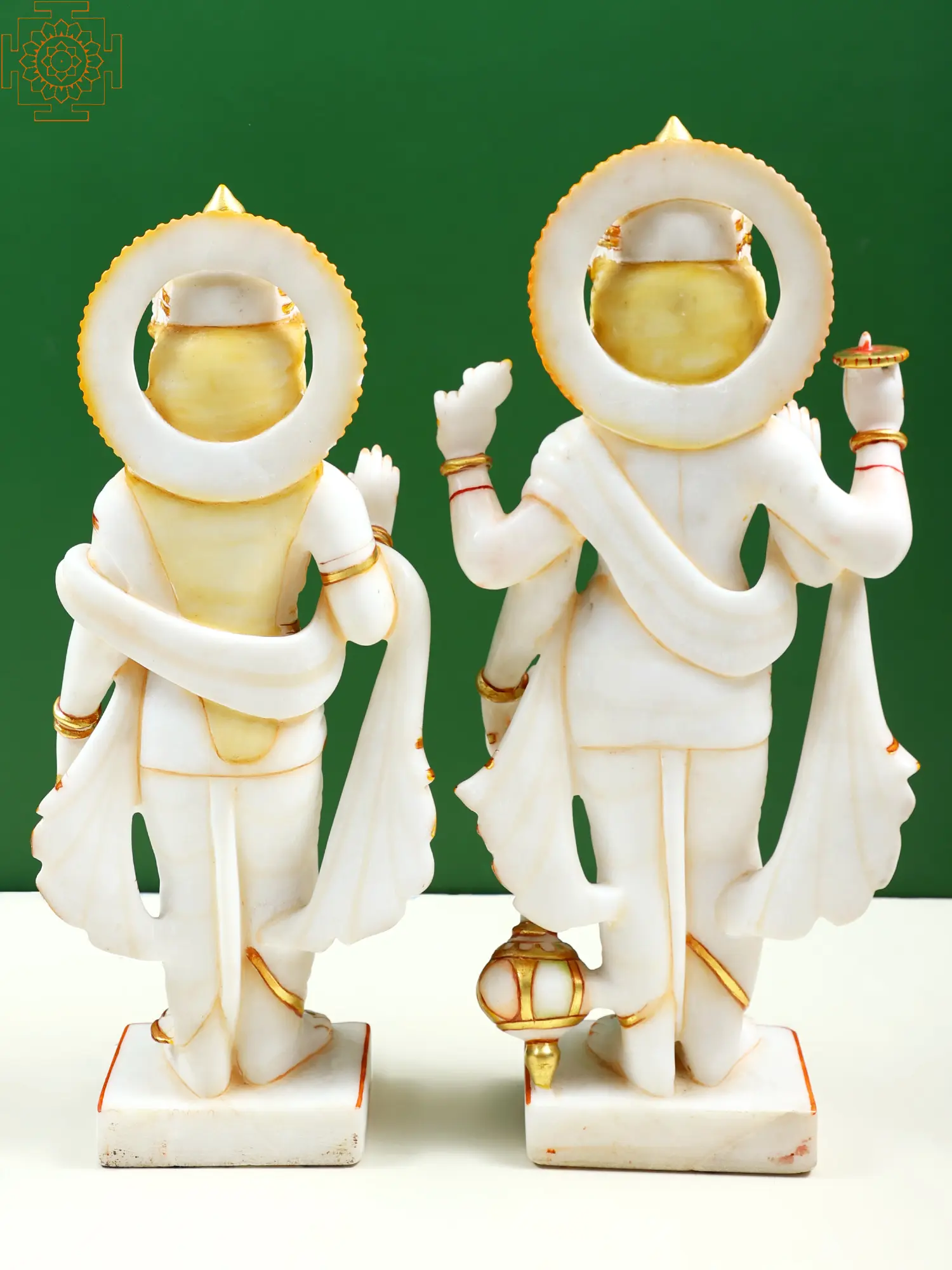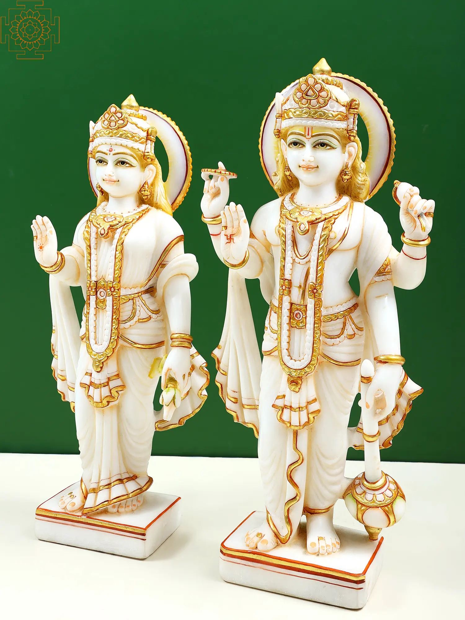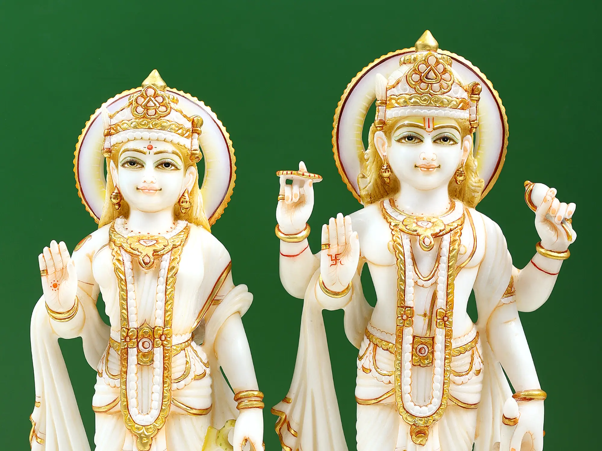 Despite the predominant white of the bitone colour palette, each aspect of the murtis have been accentuated with considerable skill and attention to detail on the part of the sculptor. The folds of His flowing dhoti and the delicate pleats of Her saree. The distinguishing curves of their respective torsos and the musculature of their limbs. The expression of their eyes, the shapes of their mouths. From underneath the studded crowns on their heads cascade tresses the gracious colour gold.