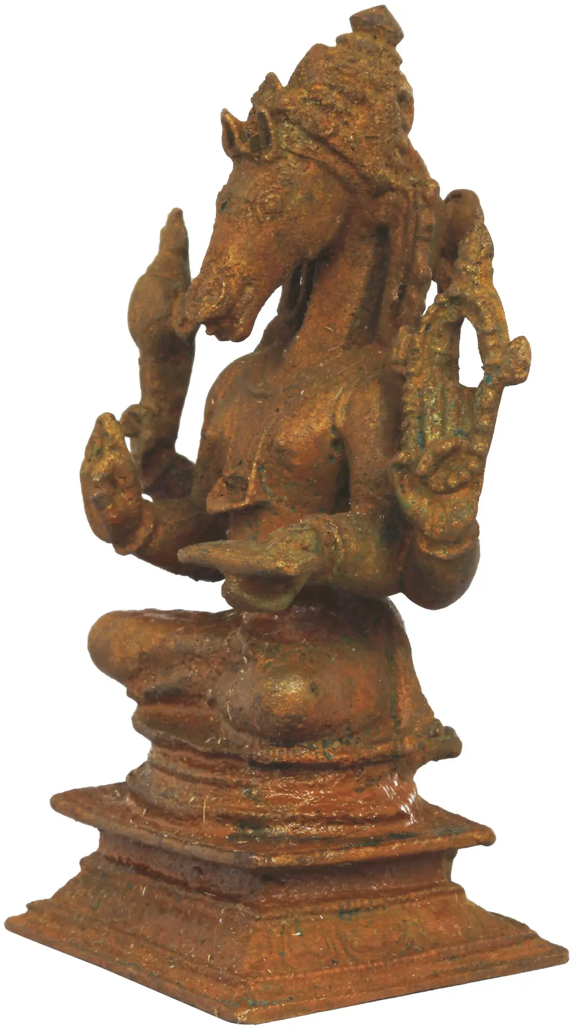 This exquisite bronze statue depicts Hayagriva, a powerful and revered avatar of Lord Vishnu. Known as the god of knowledge, wisdom, music, and art, Hayagriva is often depicted with the head of a horse, symbolizing the untamed spirit and immense power that wisdom brings. In Hindu mythology, Hayagriva is invoked to overcome ignorance and confusion, bestowing clarity and enlightenment upon his devotees. Tales recount his role in retrieving the Vedas from the demons Madhu and Kaitabha, thereby restoring divine knowledge to the universe. His horse-like visage signifies victory over darkness and the triumph of intellect.