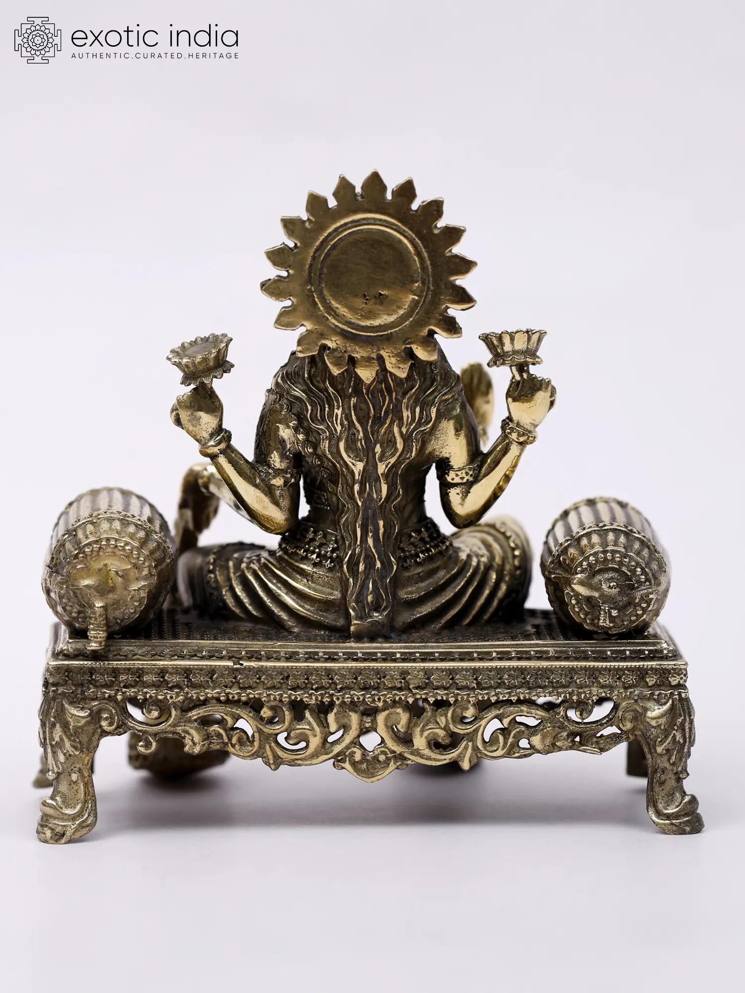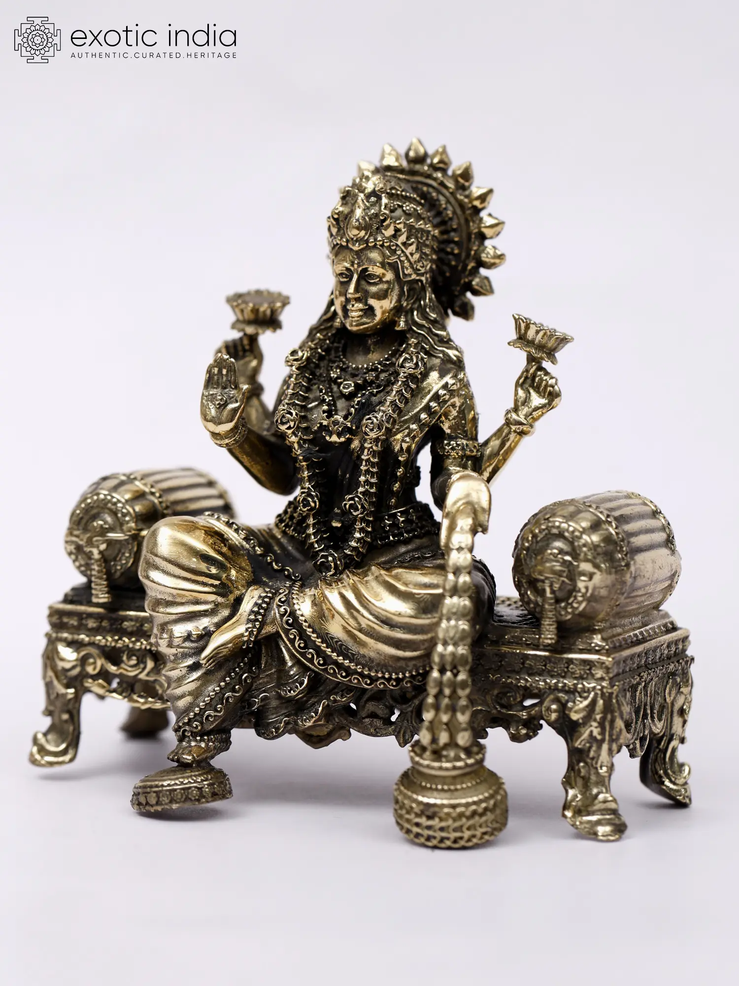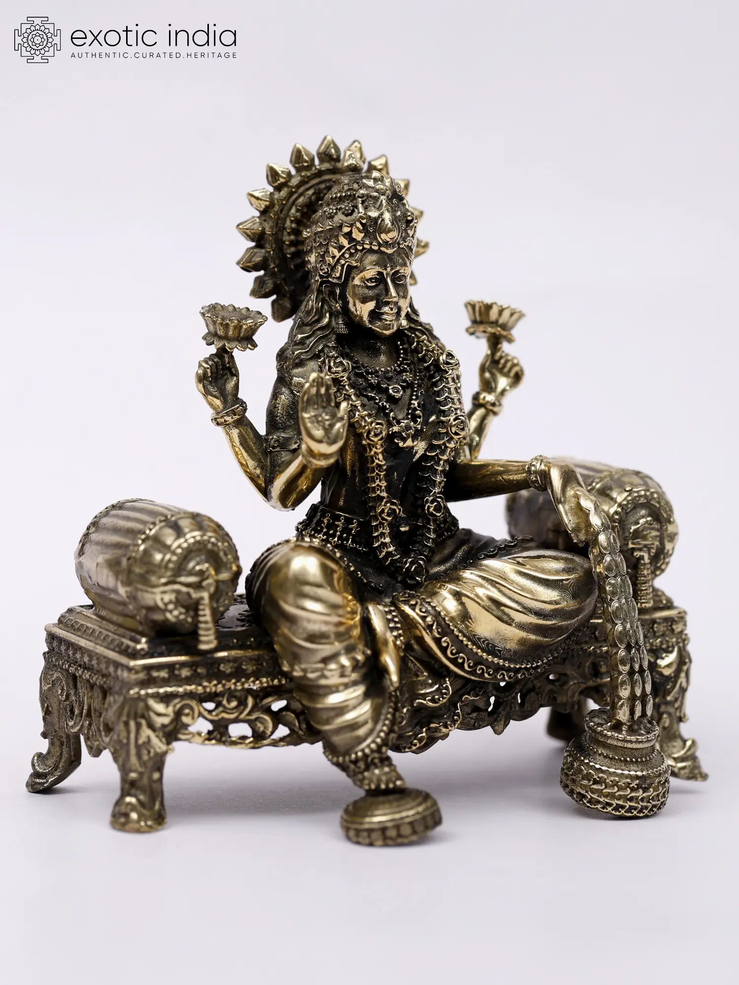 This magnificent brass statue features Goddess Lakshmi seated elegantly on a Singhasana, a royal throne, adorned with intricate jewels. Representing wealth, fortune, and prosperity. Lakshmi exudes grace and serenity with her benevolent smile and tranquil expression. The detailed craftsmanship highlights her ornate jewelry, flowing garments, and the regal throne, showcasing the artist’s attention to detail and reverence for the divine.