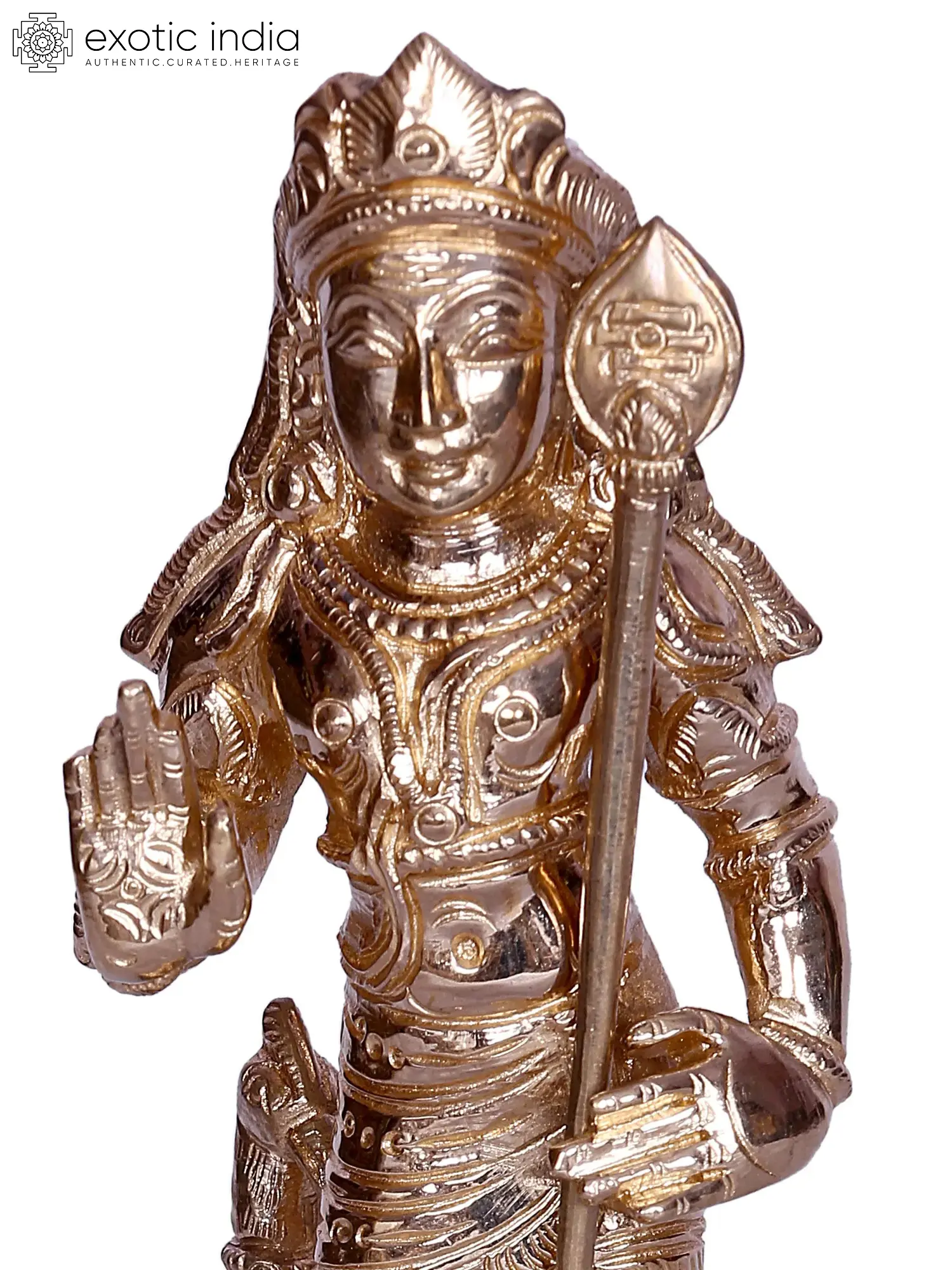 Bala Murugan, a celestial vision on a lotus pedestal, embodies divine grace and strength. Adorned in regal attire, Murugan, “also known as Skanda”, “the Son of Goddess Parvati and Lord Shiva”, wields the mighty Shakthi Vel (the spear), a symbol of supreme power. His right hand assures protection and courage with “Abhaya Mudra”, while his left beckons blessings. The peacock, his loyal mount, stands behind, a symbol of triumph over vanity. This ethereal form, crafted in bronze, signifies courage, wisdom, and the triumph of good over evil. Worshipping this form grants devotee’s courage, protection, and spiritual insight.