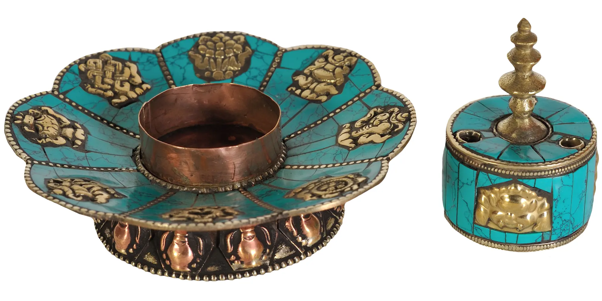 This incense burner is more than just a decorative item; it is an invitation to cultivate mindfulness and create an atmosphere of peace. The warm glow of burning incense, paired with the visual harmony of the copper and turquoise, can transform any space into a sanctuary. Its compact size makes it ideal for placing on altars, meditation desks, or side tables, where its intricate details can be fully appreciated. The careful inlay work and the symbolic significance of the Ashtamangala make this a truly special piece, perfect for personal devotion, as a thoughtful gift for loved ones, or to simply enhance the spiritual ambiance of your living space.