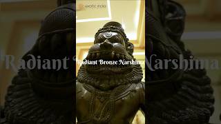 This magnificent Swamimalai bronze has captured what the palace attendants, Prahlad and Hiranyakashyapu witnessed when Narasimha, the fierce form of Vishnu emerged out of the broken pillar. Srimad Bhagavad and various Puranas describe the magnificence of the appearance of Narasimha. He can be seen in his Ugra Roopa (fierce form), embodying the Raudra (raging) rasa or juice, inducing the bhava or emotion of fear in the heart of the evildoers. He wears the distinct Kiritamukuta (conical crown) followed by a bejewelled Lalatapattika (forehead band). A Vaishnava tilak adorns his forehead, highlighted by his frowning eyebrows that provide a frame to his bulging eyes, an indication of the viciousness of Narasimha. Between his finely coiled majestic mane and his crown are his ears, straight like those of a lion ready for the hunt. The fierceness of Narasimha is best conveyed by his open mouth, showing two rows of sharp teeth, causing the evil-hearted beings to tremble with horror. The wildness of the visage of Sri-Narasimha is contradicted outstandingly by the grandeur of his ornamentation- a reminder that even in this form, he is Bhuvanesh (lord of the Cosmos). He wears jewelled skandamala (bands on his shoulders), necklaces, armlets, a gem-studded Udarbandh (band on the belly), and anklets. On the right side of his chest is the Srivatasa, the symbol of Vishnu’s consort Sri-Lakshmi, marking the presence of his Shakti, the female and active energy. Three ornaments that require special attention are- Narasimha’s yajnopavita, his keyura (armbands), and his hand chains. Unlike a regular yajnopavita, Narasimha’s sacred thread is not made from cotton, but by securing the Adi-shehsha around his body. The artist, following the descriptions of the ancient texts, has adorned the great god with a repetition of the Makara (a mythical sea creature, with the body of crocodile, dolphin and sometimes an elephant) in his armbands as well as the centrepiece of his crown. The Makara is an awesome and fearsome creature, whose use as the jewellery for Sri Narasimha brings out the latter’s control over all creations, simple and complex, since as a dweller of the great waters, Makara is associated with the Creation. The beautiful hand chains in this bronze murti highlight the admirably realistic hands of Narasimha made even more striking by his razor-sharp nails. Such is the splendour of the nails of Narasimha, that Madhavacharya, the Medieval Vaishnava saint wrote a stuti (hymn), the Nakha-Stuti, as a tribute to them. Zoom in on the statue to savour the detailed carvings by the master artists of Swamimalai.