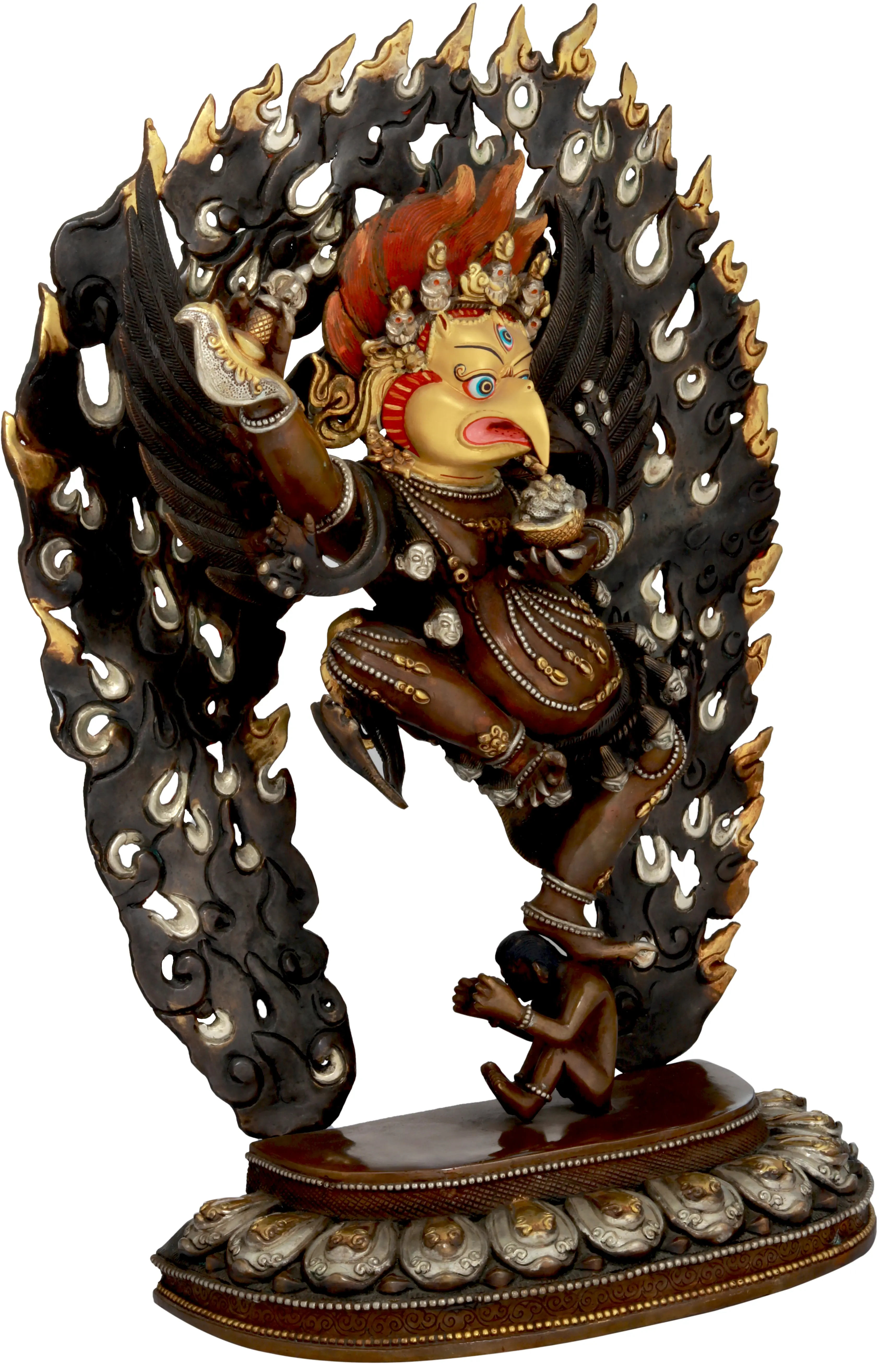 Crafted from high-quality copper, this sculpture is a testament to the enduring skill of master artisans. The application of 24 karat gold gilding imbues the piece with a radiant glow, elevating its spiritual aura and aesthetic appeal. The contrasting textures and the skillful interplay of shadow and light highlight the intricate details of the design, from the sharp angles of the crow's beak to the delicate curls of the ornamentation. Each element has been carefully shaped and finished, resulting in a work of art that is both visually striking and spiritually resonant. This magnificent piece serves as a powerful reminder of the wisdom, strength, and transformative potential that resides within us all.