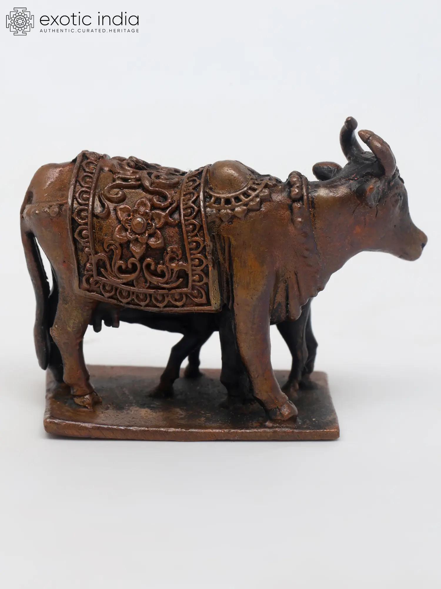 Many magical, divine, and priceless objects surfaced from the ocean's depths when the Ksheer Sagar was stirred by Suras and Asuras. One of these was the cow Kamadhenu, a mother figure venerated in Hinduism and capable of bestowing blessings that benefit one beyond the realm of the living. Nandini, Kamadhenu's daughter, who shares these qualities with her mother, is frequently depicted with her calf. In this small copper statue, Nandini is seen sipping milk from the udders as Kamadhenu stands firm, adorned beautifully. Kamadhenu's neck is embellished with a lovely bell. According to Hindu texts, she is a holy animal that grants wishes; hence, placing such an icon in space attracts auspiciousness and abundance in life.