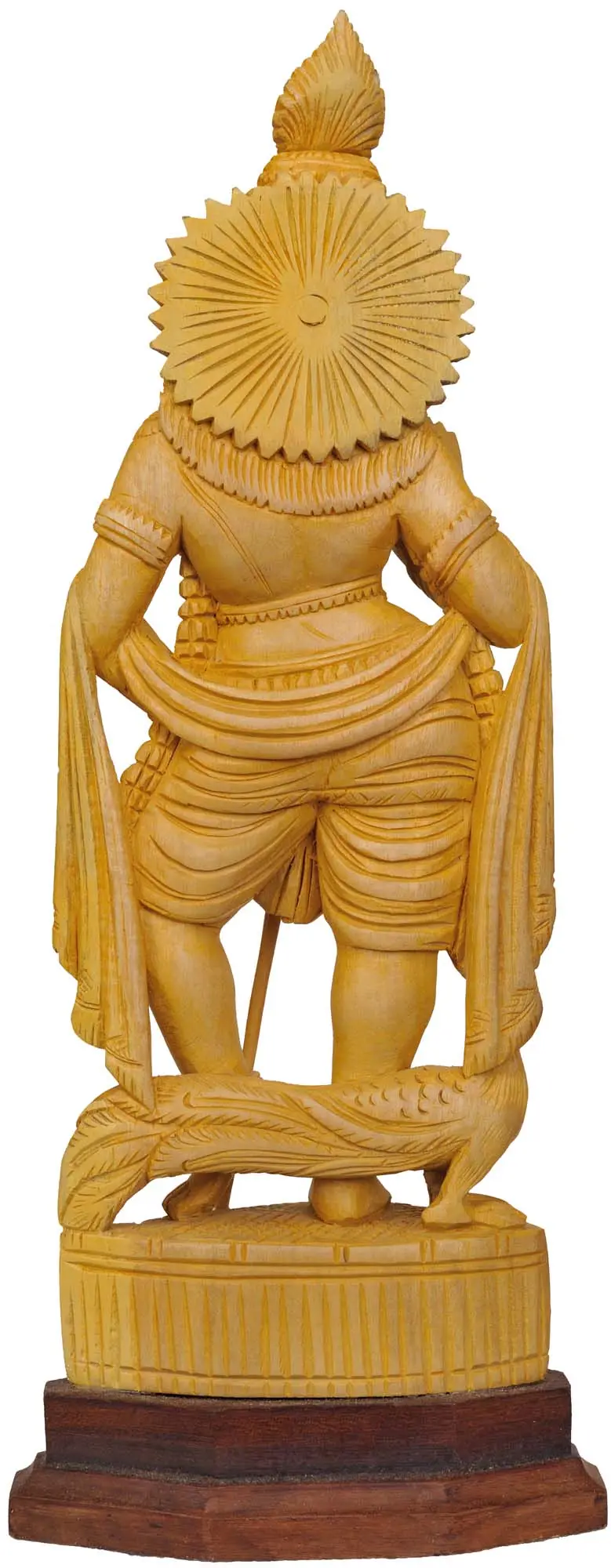 Embodying strength, valor, and divine protection, this exquisite wood carving depicts Kartikeya, the Hindu god of war. Crafted with meticulous attention to detail from pristine white cedar wood sourced from the lush forests of Trivandrum, Kerala, this statue is a testament to the rich tradition of Indian artistry. The wood, known for its fine grain and natural beauty, has been expertly shaped by skilled artisans to bring forth the divine form of the celestial general. Kartikeya, also known as Murugan or Skanda, is a prominent deity in Hinduism, revered as the commander-in-chief of the celestial armies. Born of the god Shiva and the goddess Parvati, his very conception was a divine intervention to vanquish the demon Taraka and his associates, who had tormented the gods and humanity. His story is replete with tales of his bravery, his unwavering determination, and his role as a protector against evil. He is often depicted with six heads, symbolizing his command over the six senses, and riding a peacock, his divine vahana (mount), which represents the vanquishing of ego and pride. This carving captures Kartikeya in a posture of authority and grace. He stands firmly, his stance exuding confidence and readiness. In his hand, he holds the Vel, his divine spear, a symbol of his power and the vanquisher of ignorance. The intricate details of his attire, from the ornate necklaces to the flowing dhoti, are rendered with remarkable precision, showcasing the artisan's deep understanding of classical Indian iconography. The serene yet powerful expression on his face invites contemplation and invokes a sense of peace and protection. The presence of his loyal mount, the peacock, at his feet, further accentuates his divine dominion and his role as a protector against malevolent forces.